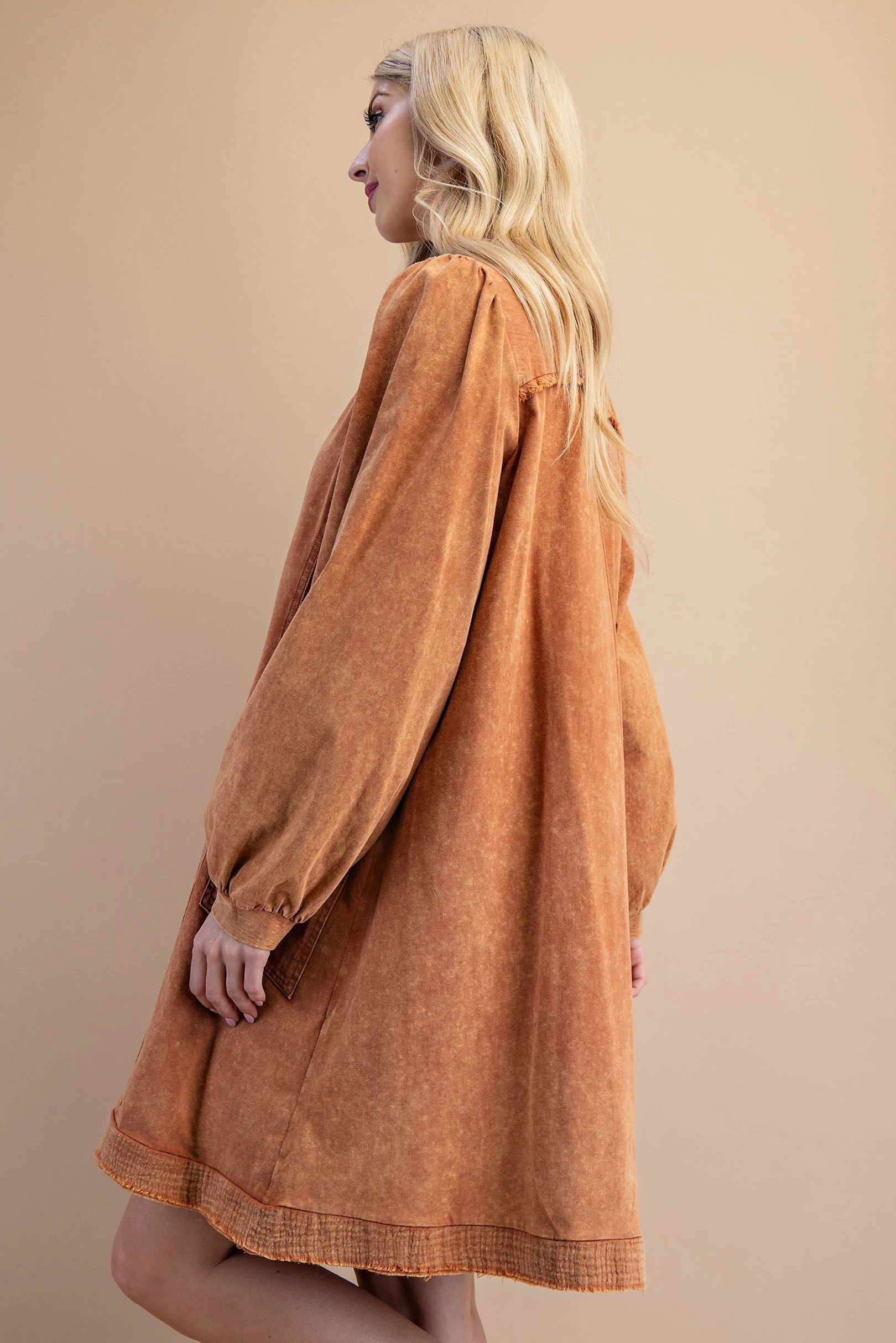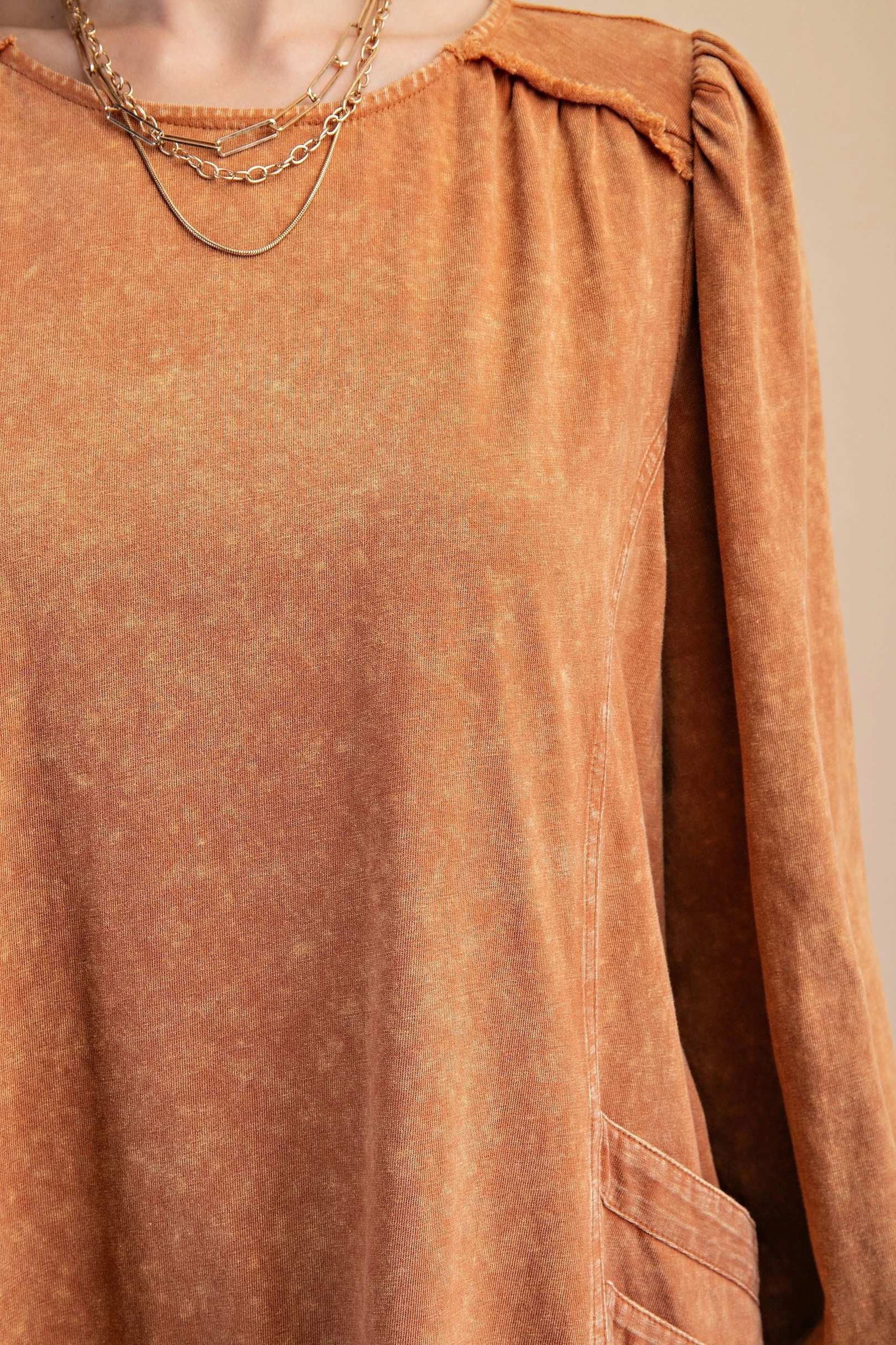 Washed Long Sleeve T-Shirt Dress with Seaming Details and Double Pockets on the Sides