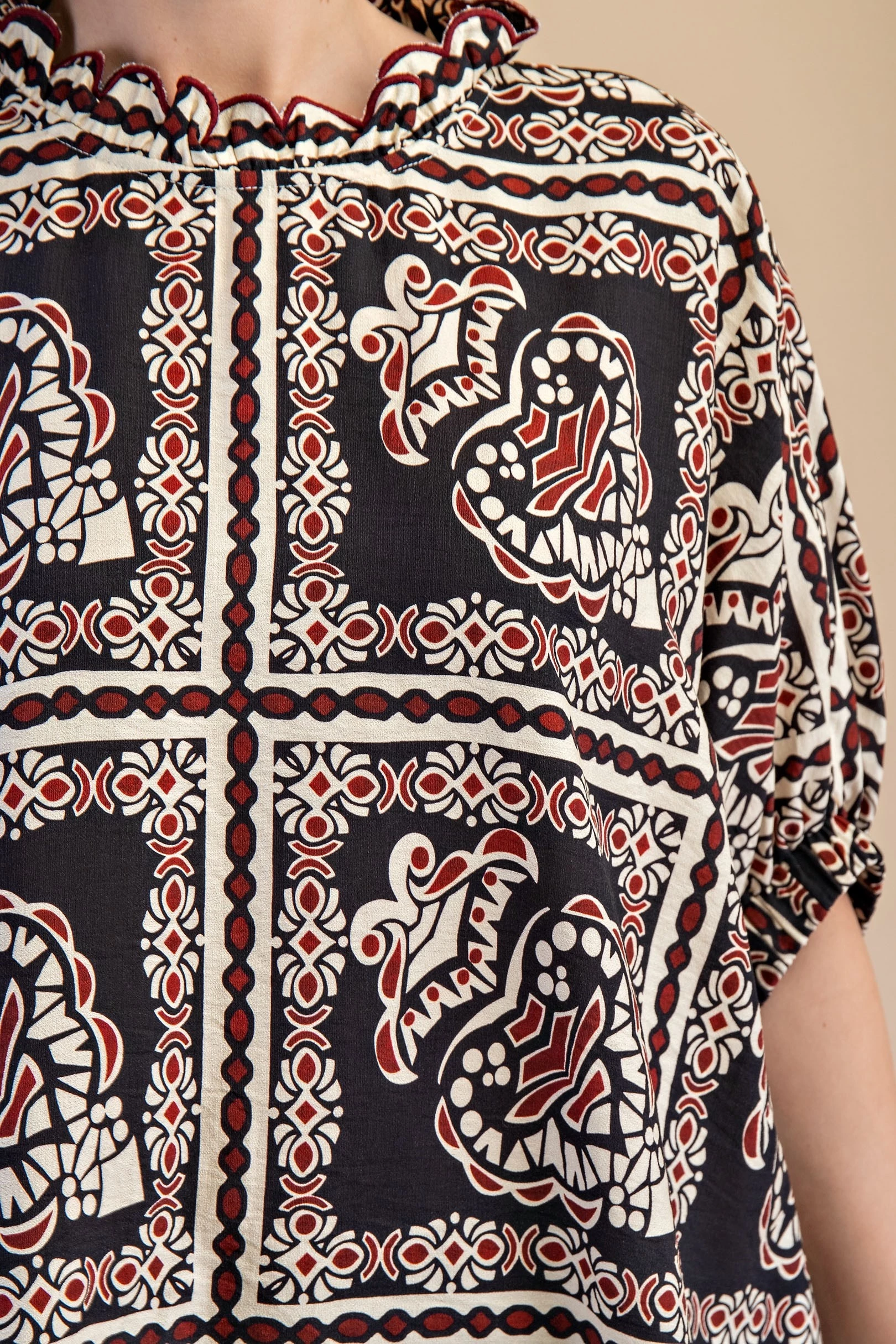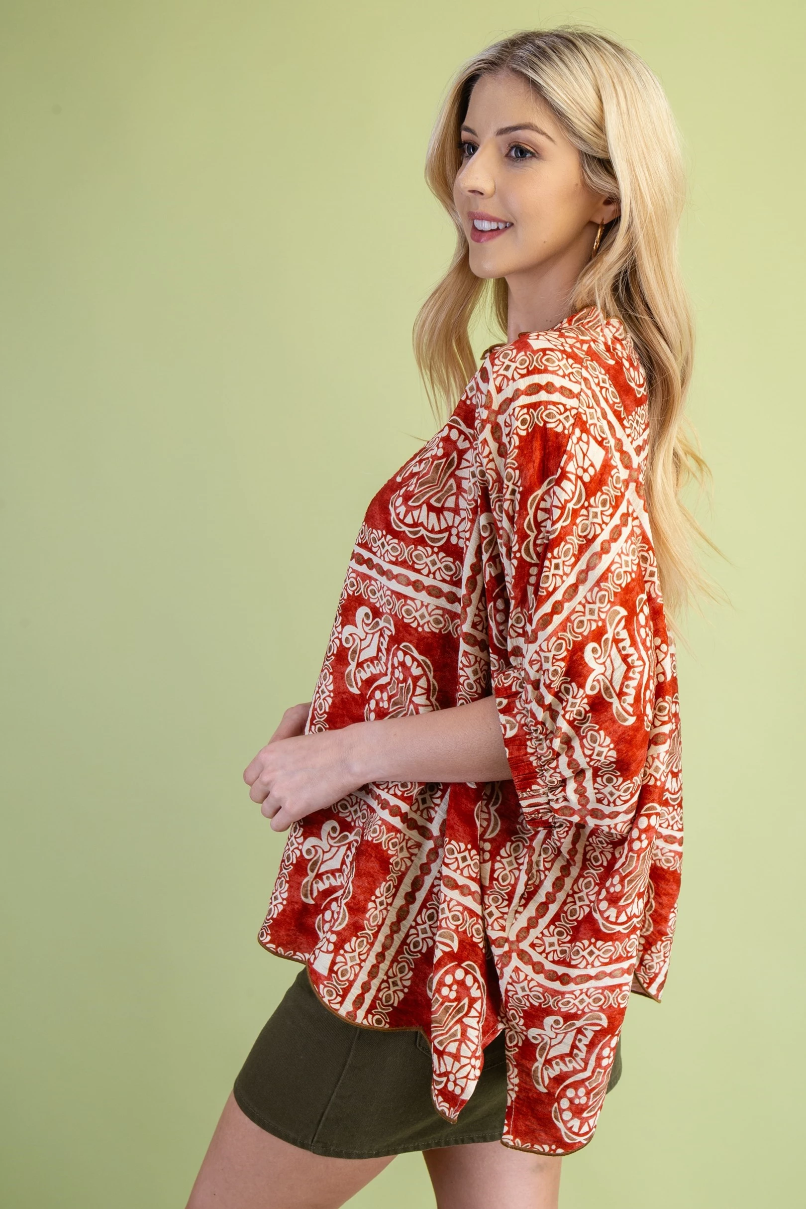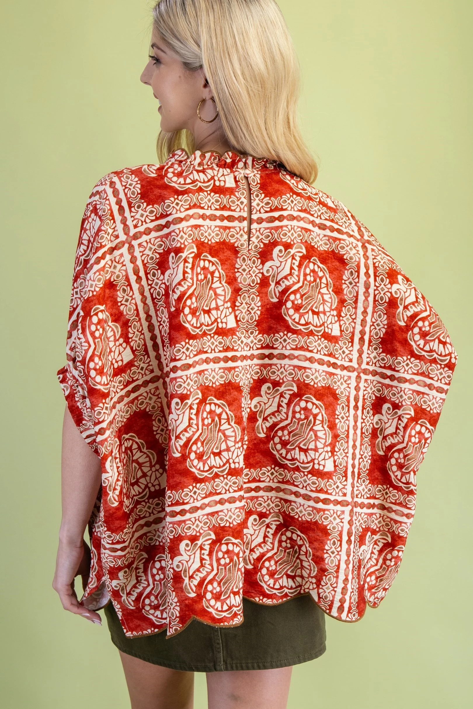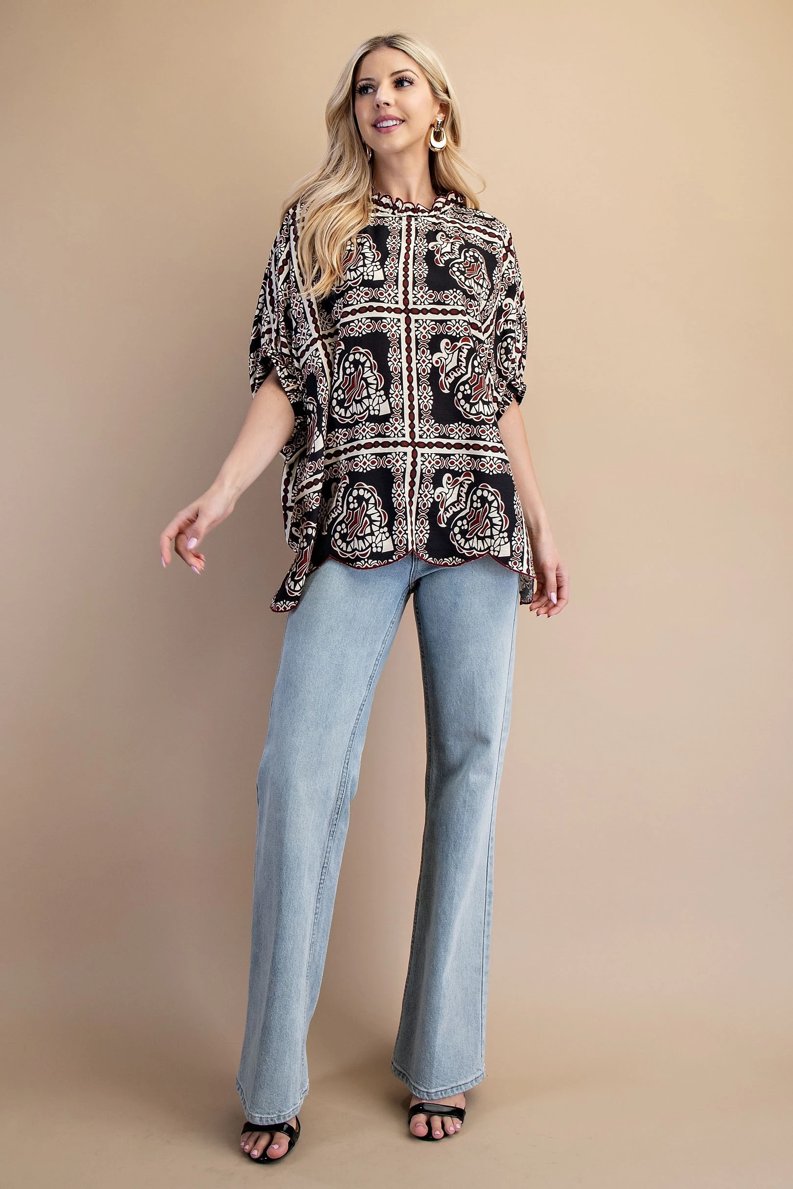 Printed Dolman Sleeve Blouse with a Scalloped Hem and Neck