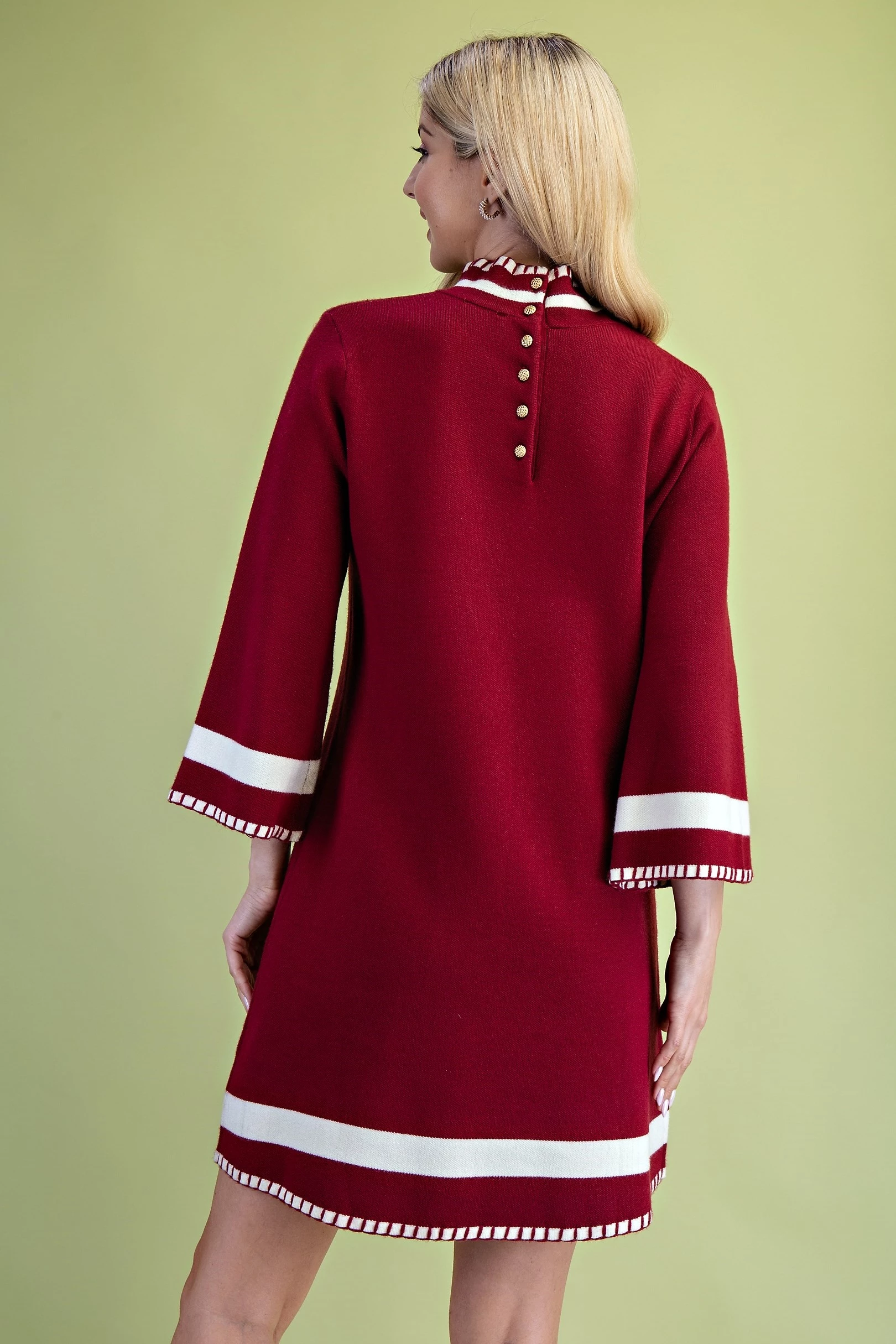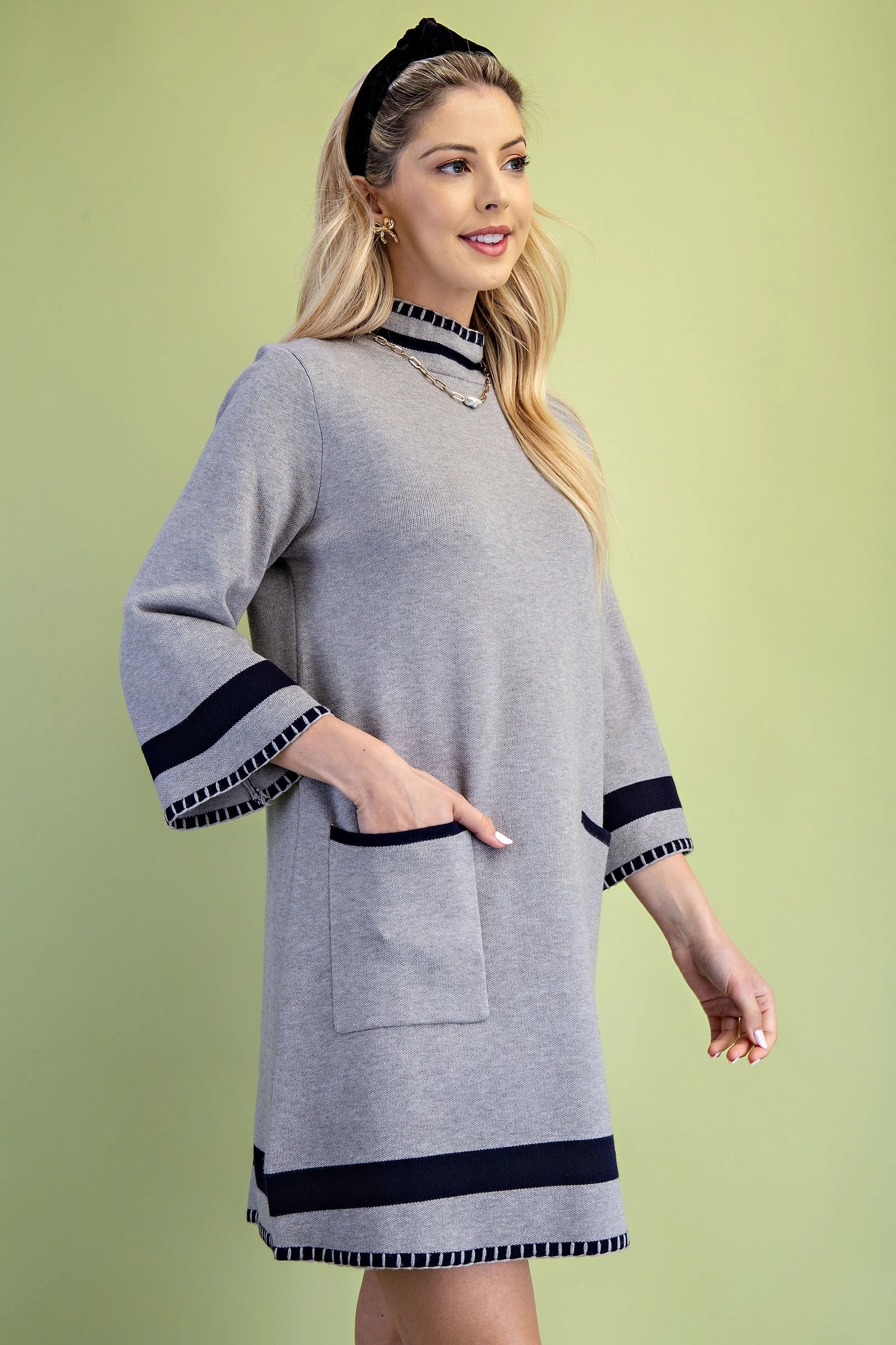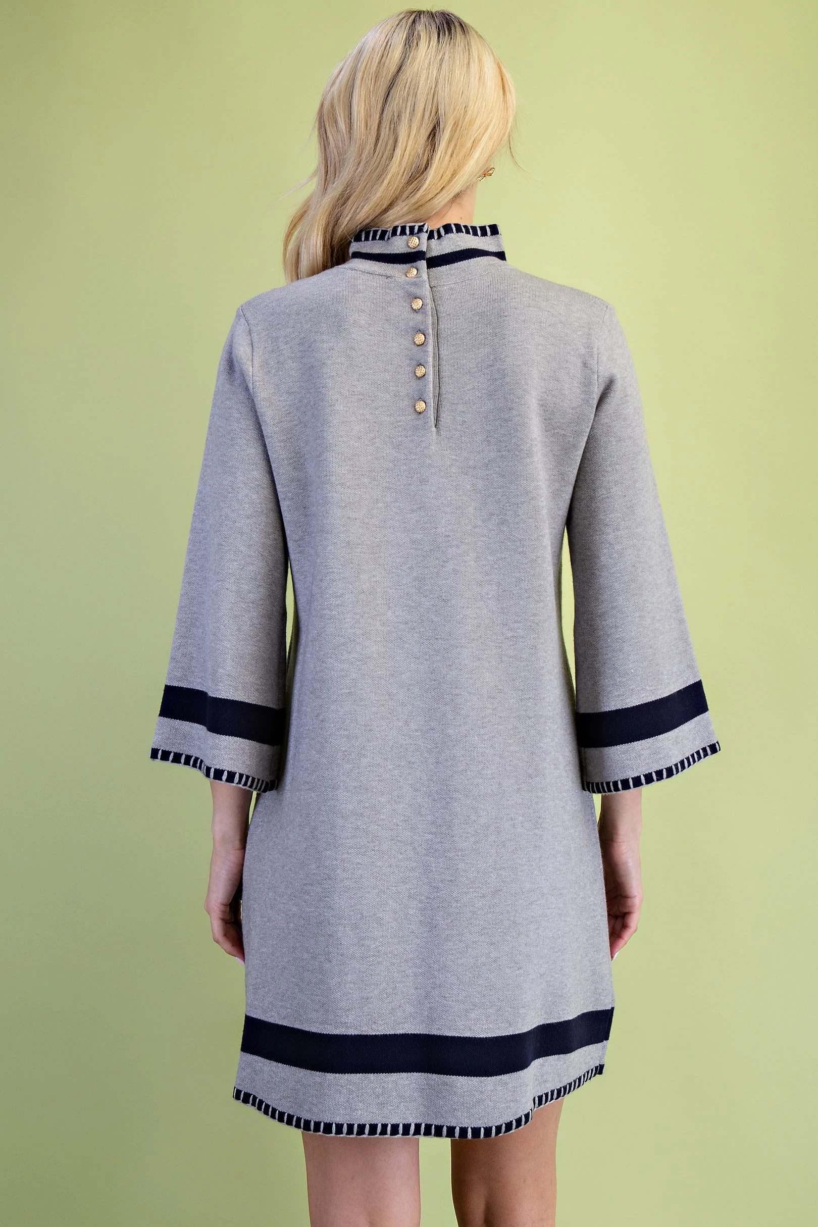 Color Blocked Mock Neck Sweater Dress with Back Button Closures and Stitched Hem Details