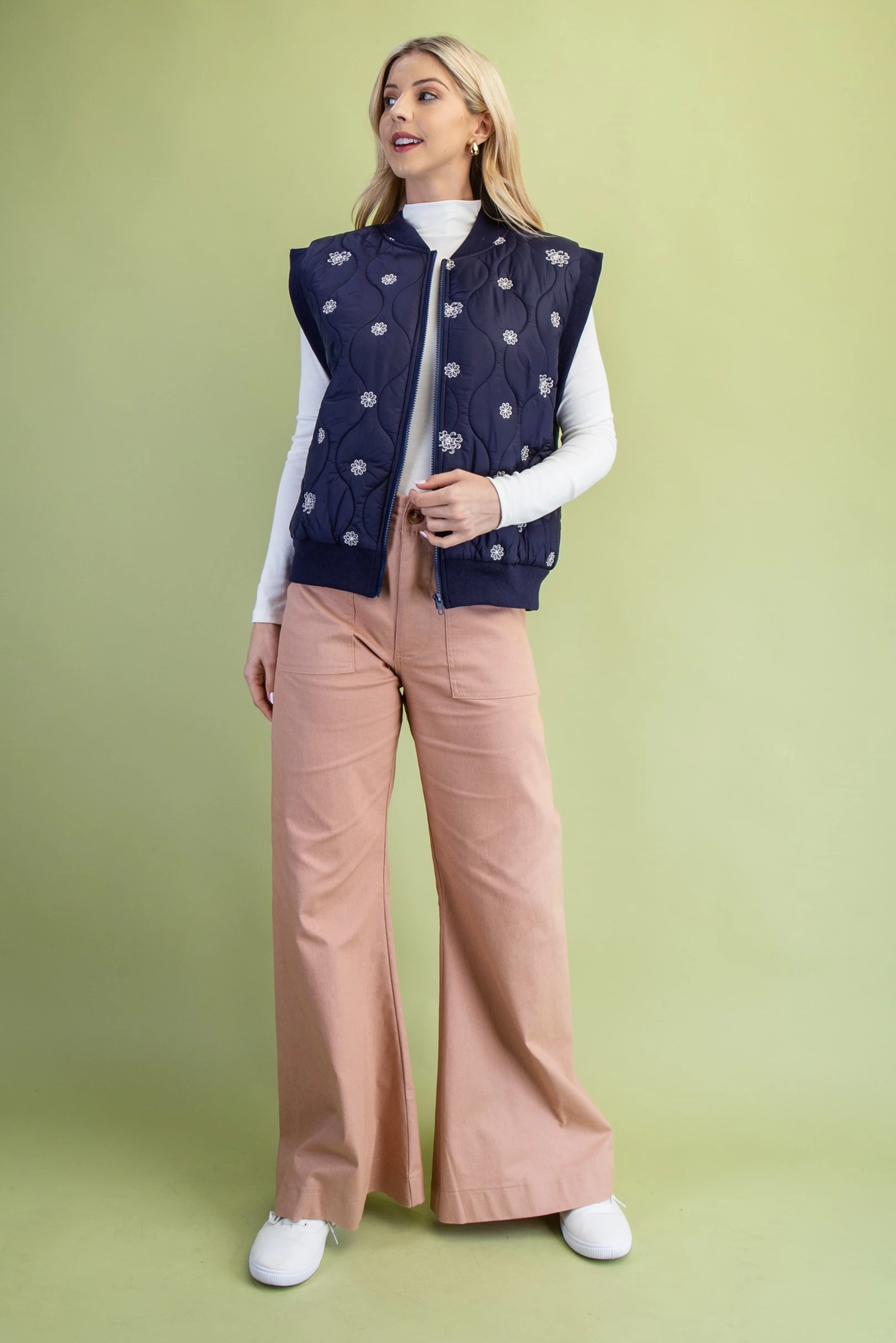 Wide Leg Exposed Zipper Pants in a Stretchy Denim-Like Fabric with Stitching Details