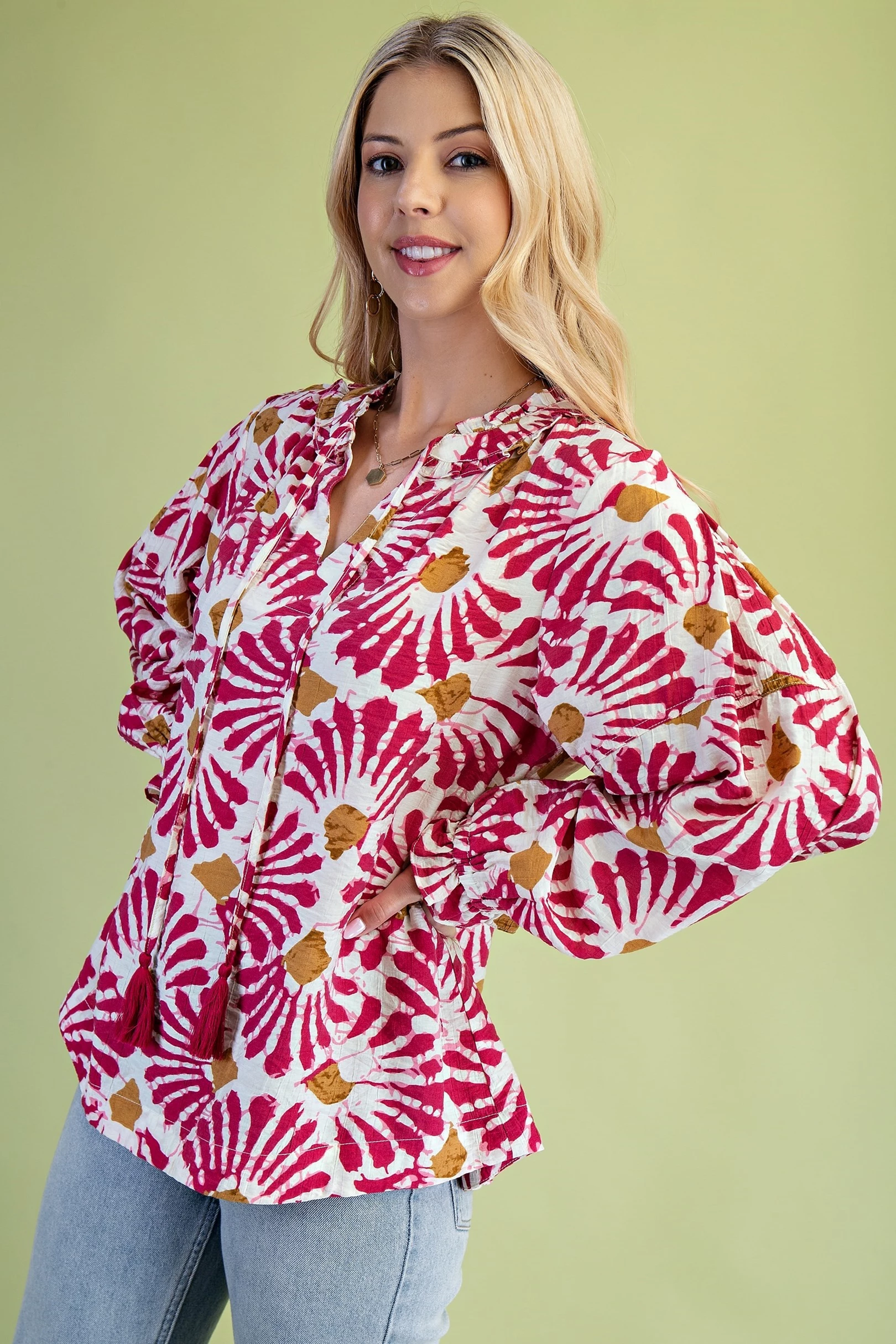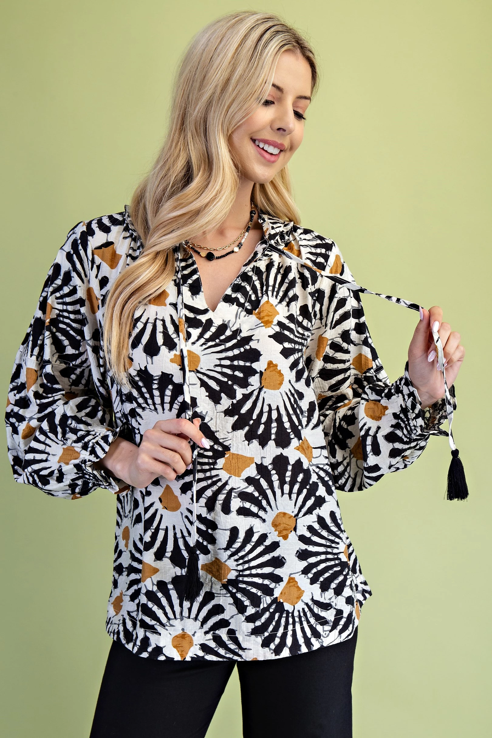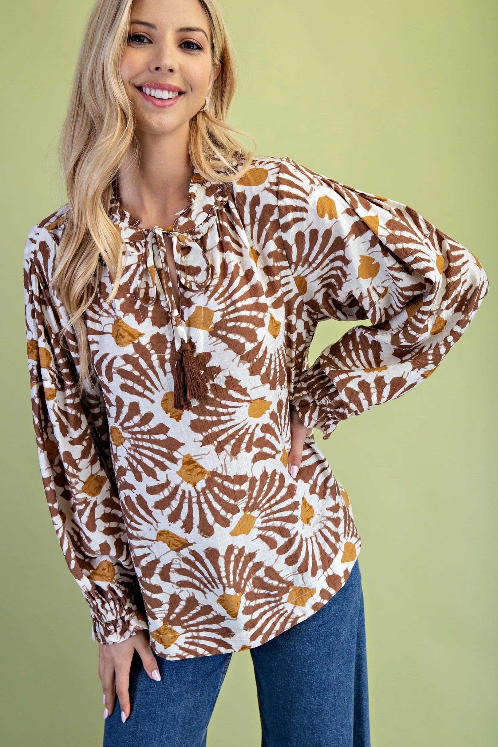 Dye-Effect Floral Print Blouse with a Ruffled Neckline and Tassel Tie Neck String