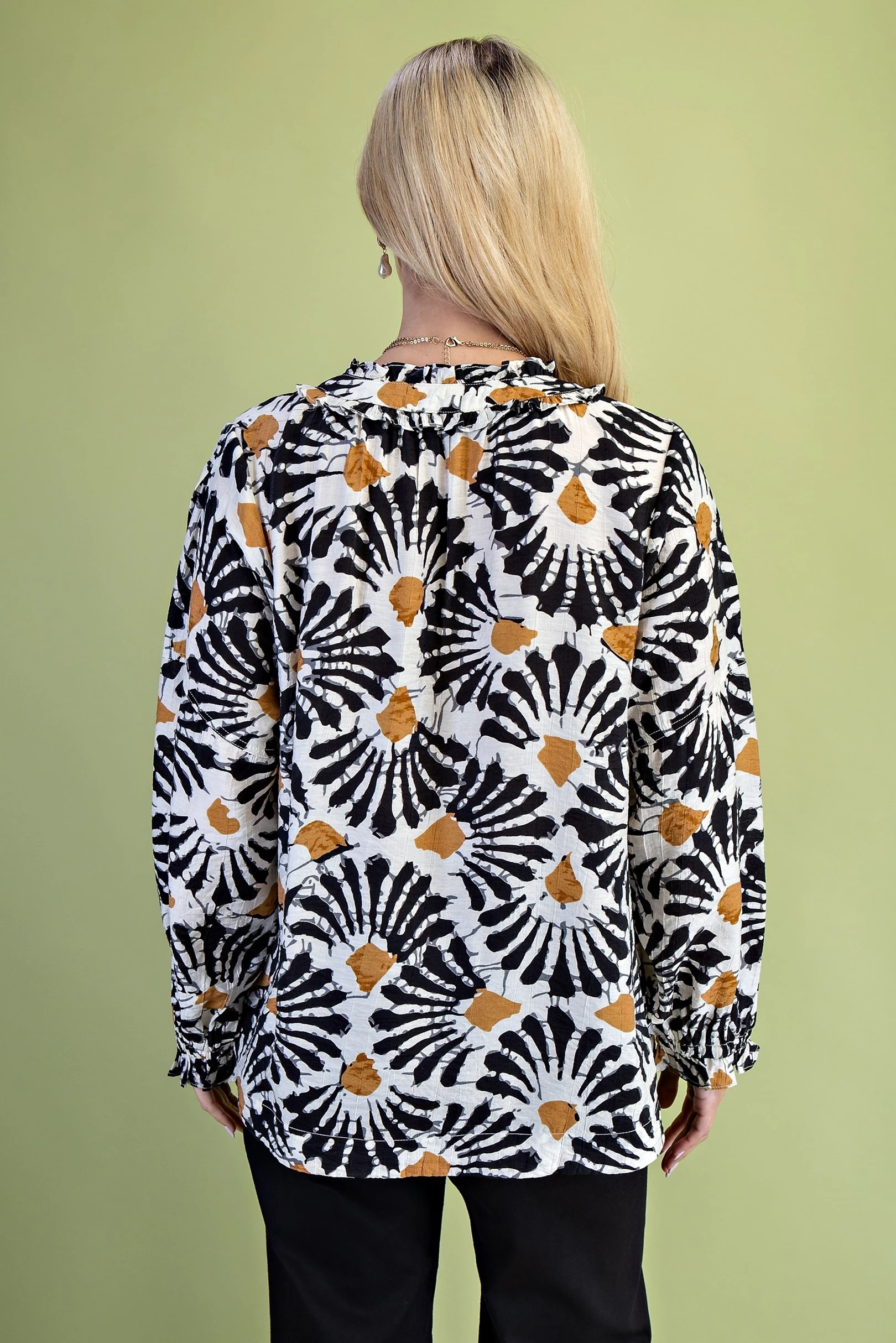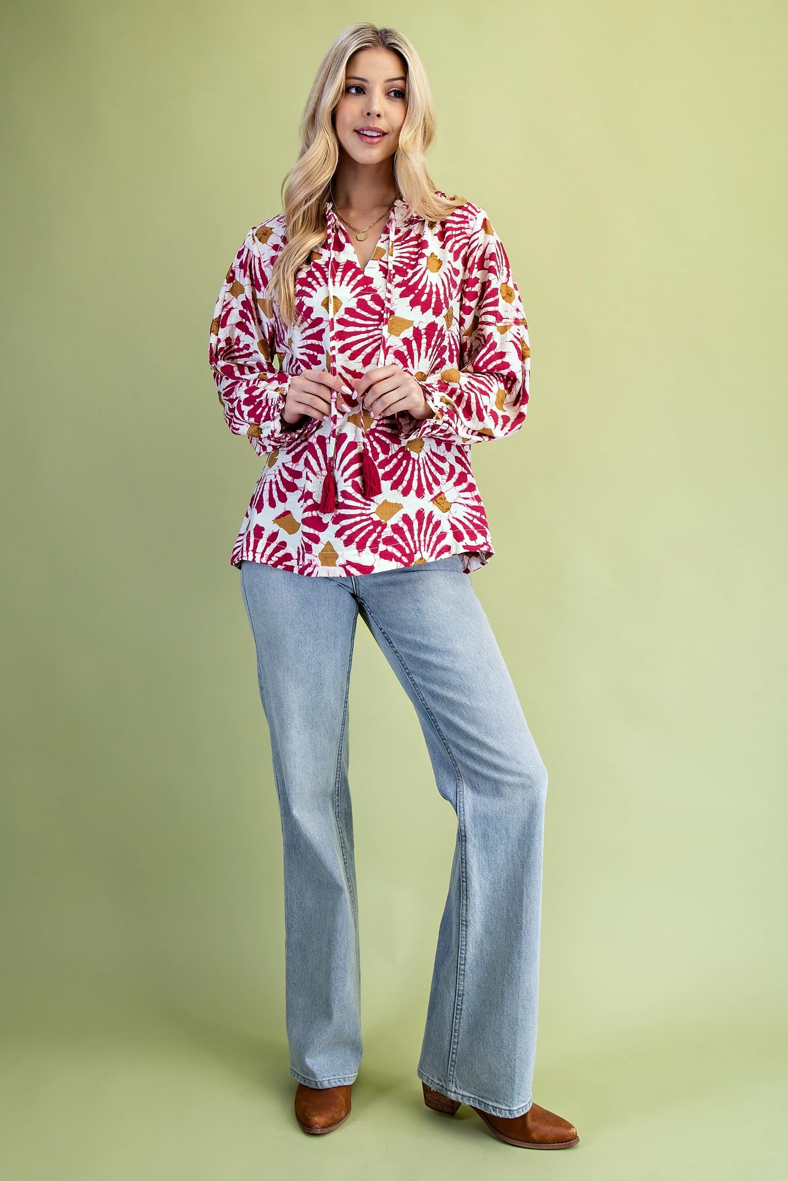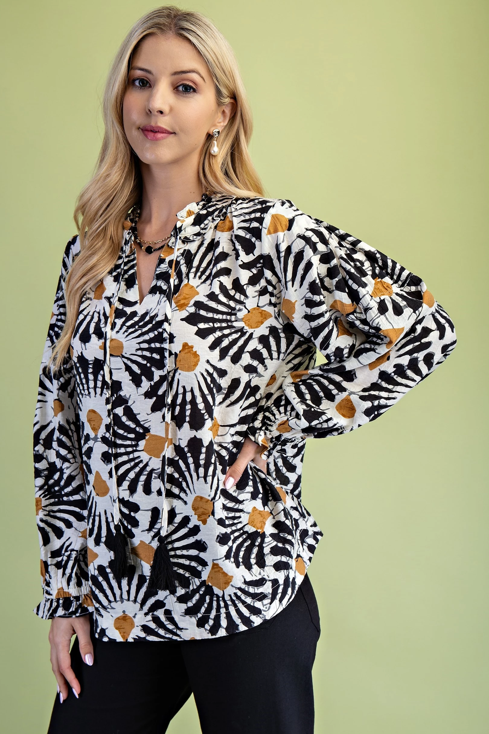 Dye-Effect Floral Print Blouse with a Ruffled Neckline and Tassel Tie Neck String
