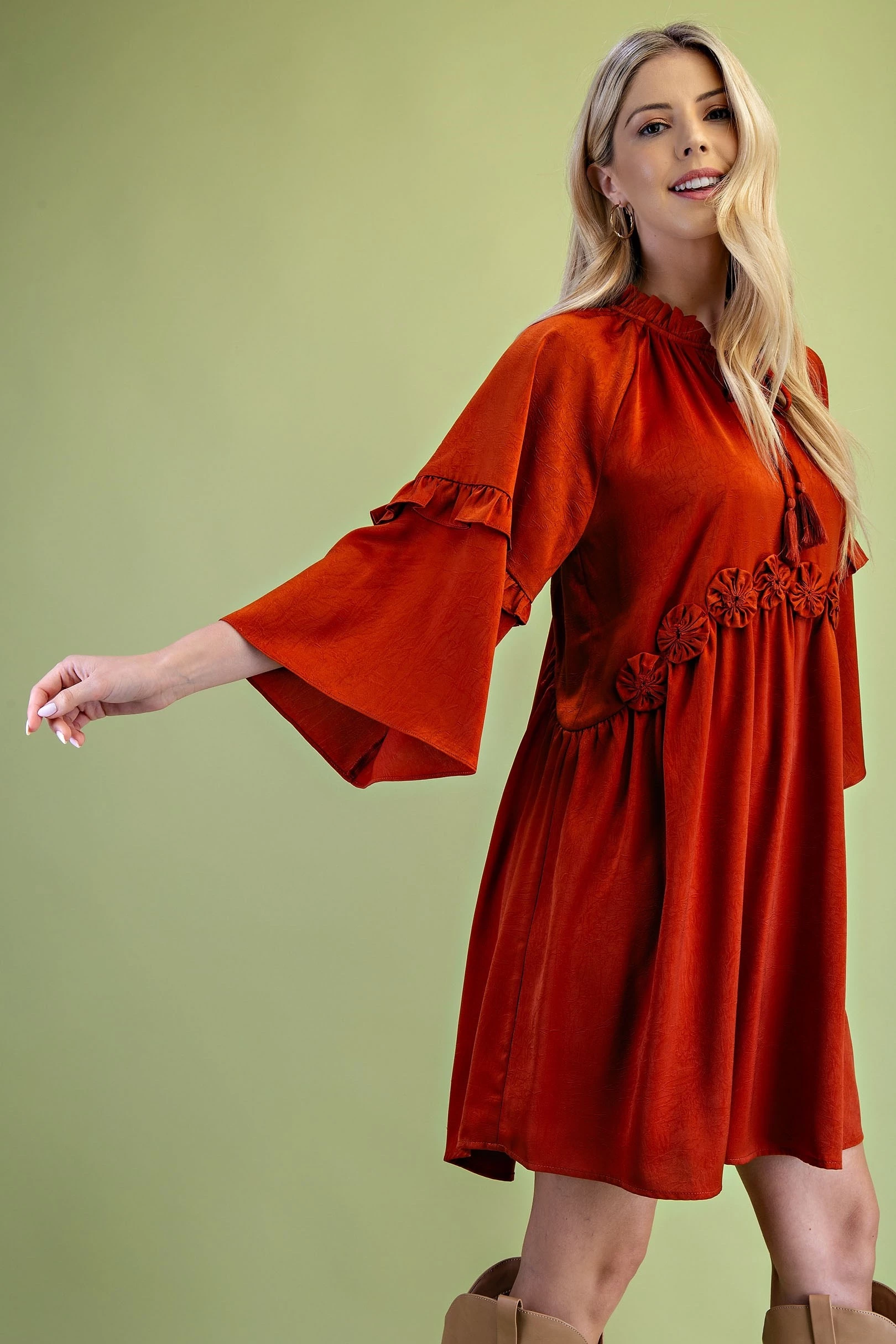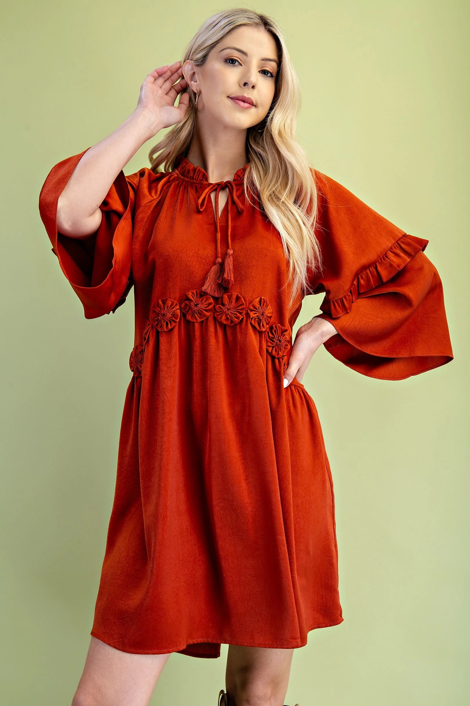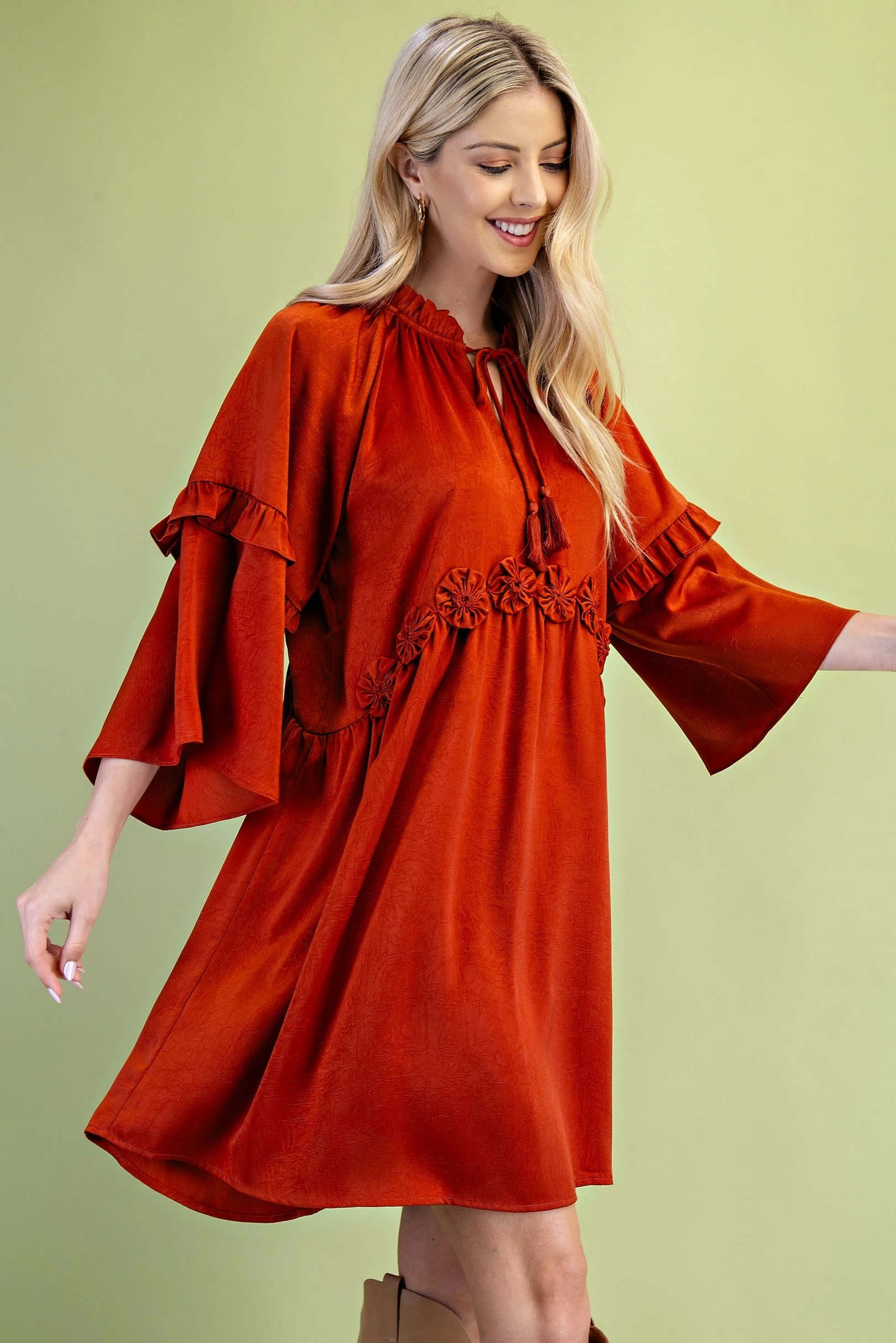 Tassel Neck Tie Bell Sleeve Top with Rosettes on Front Waist and Ruffle Details
