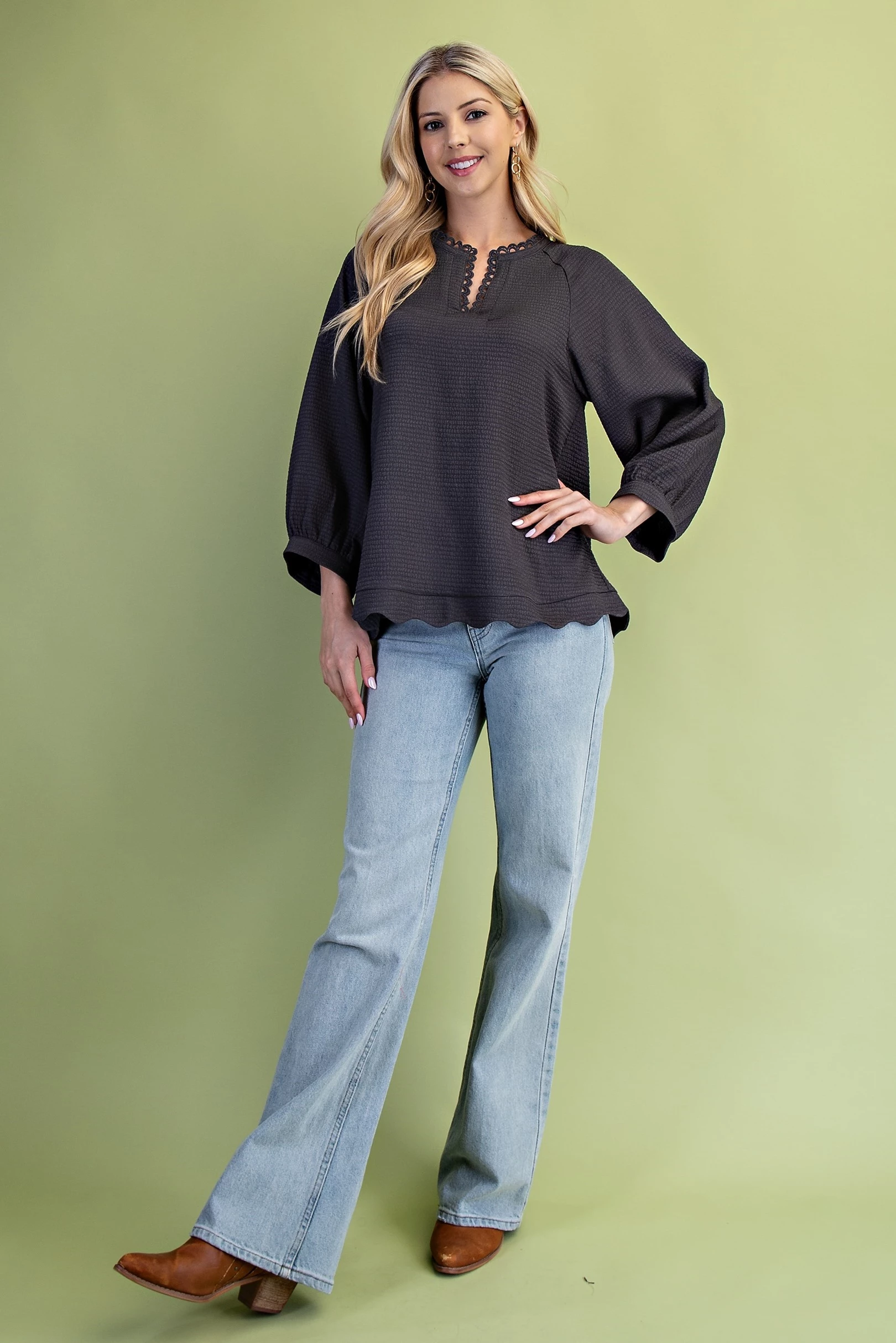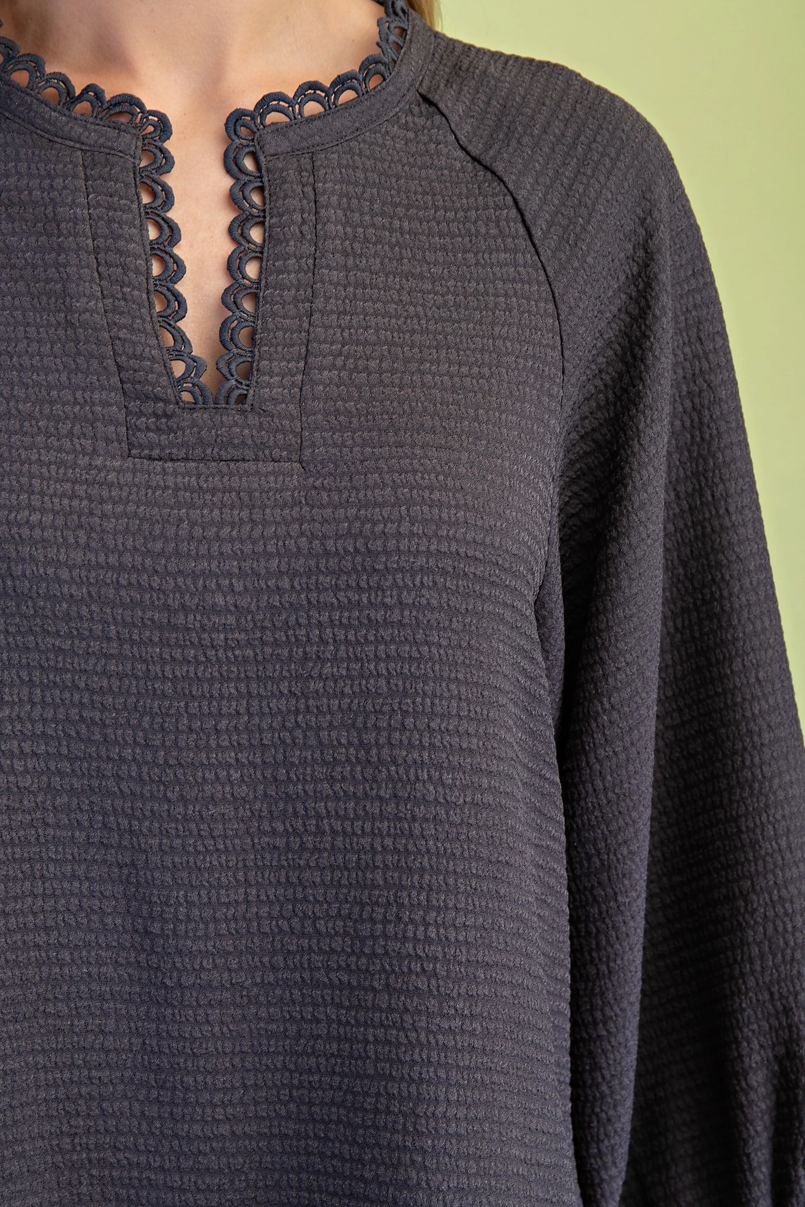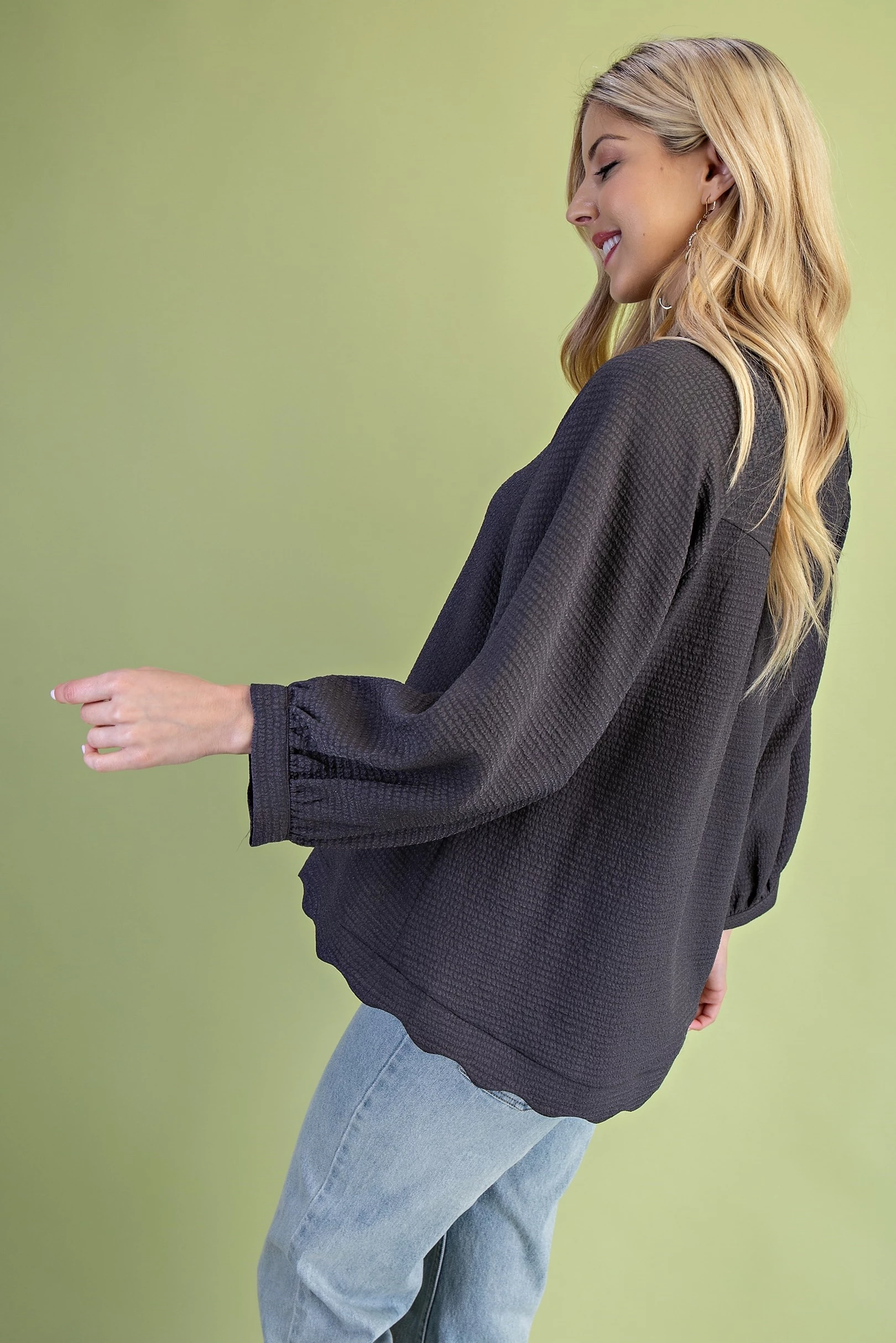 Satin V-Neck Blouse with a Smocked Yoke and Ruffled Collar
