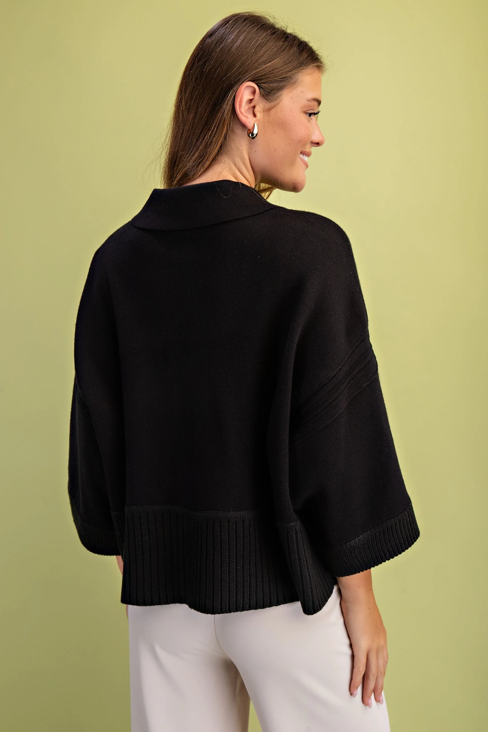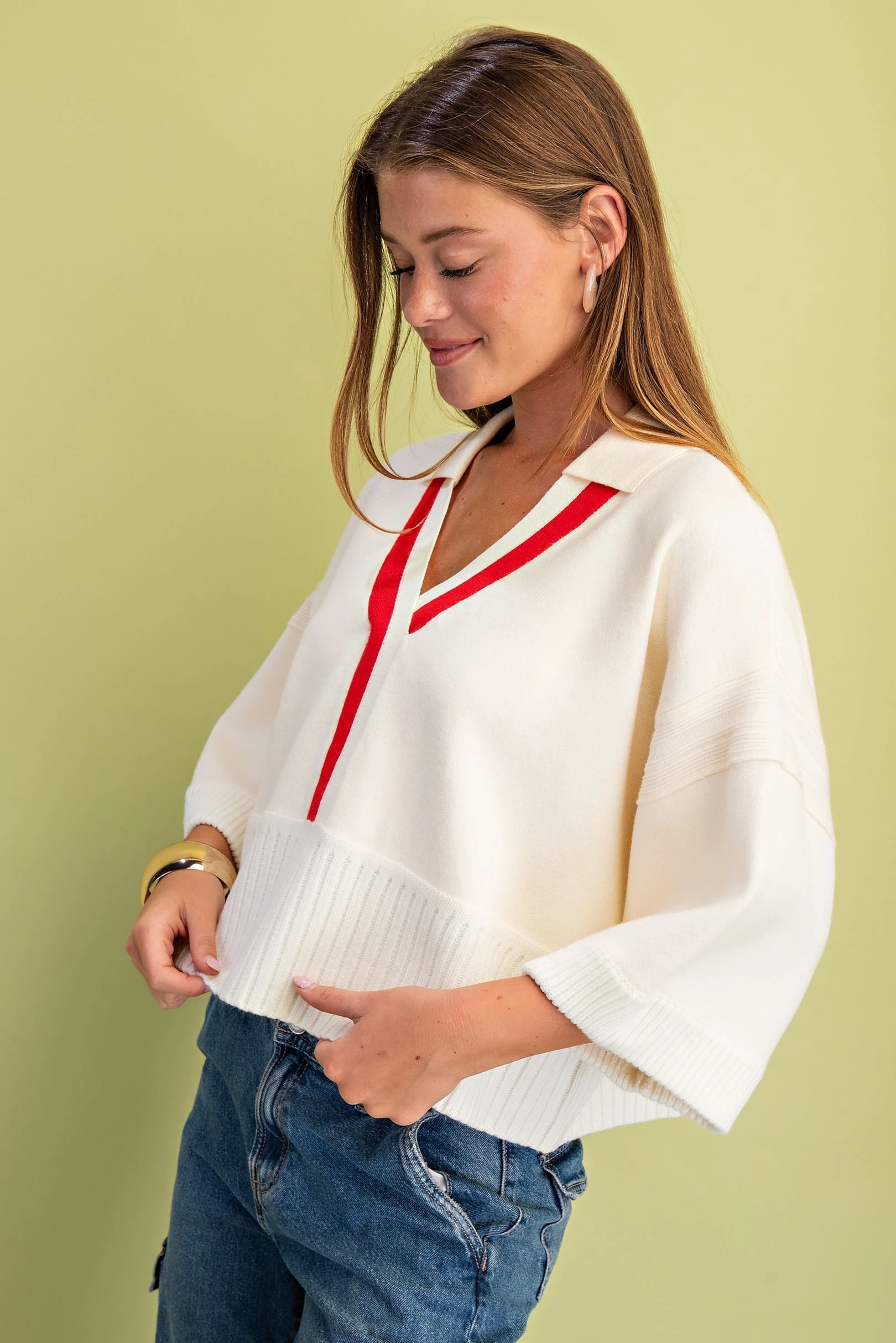 V-Neck Collared Sweater with a Contrasting Stripe and Ribbed Band Details