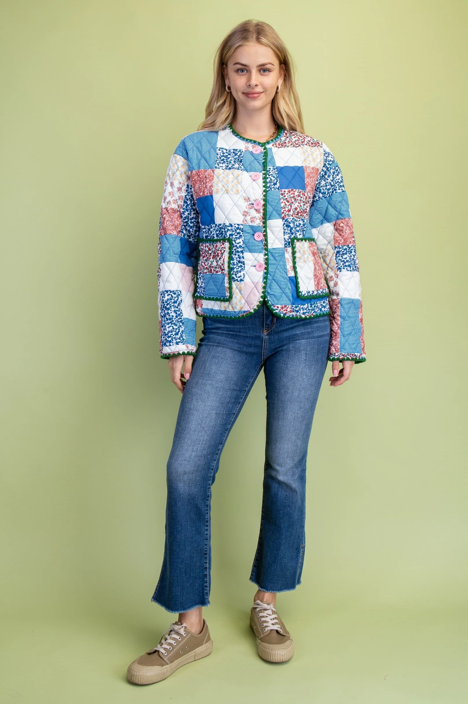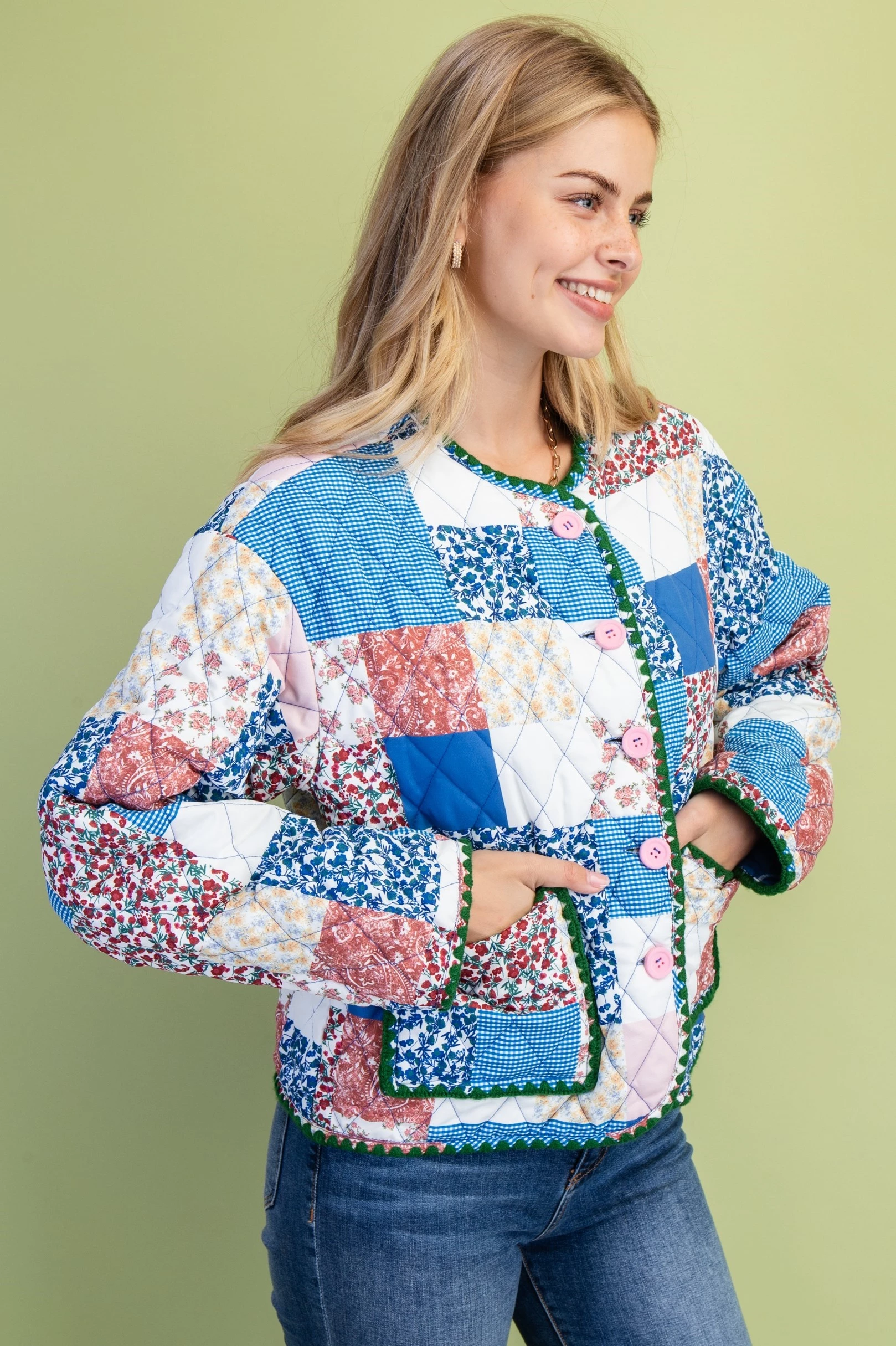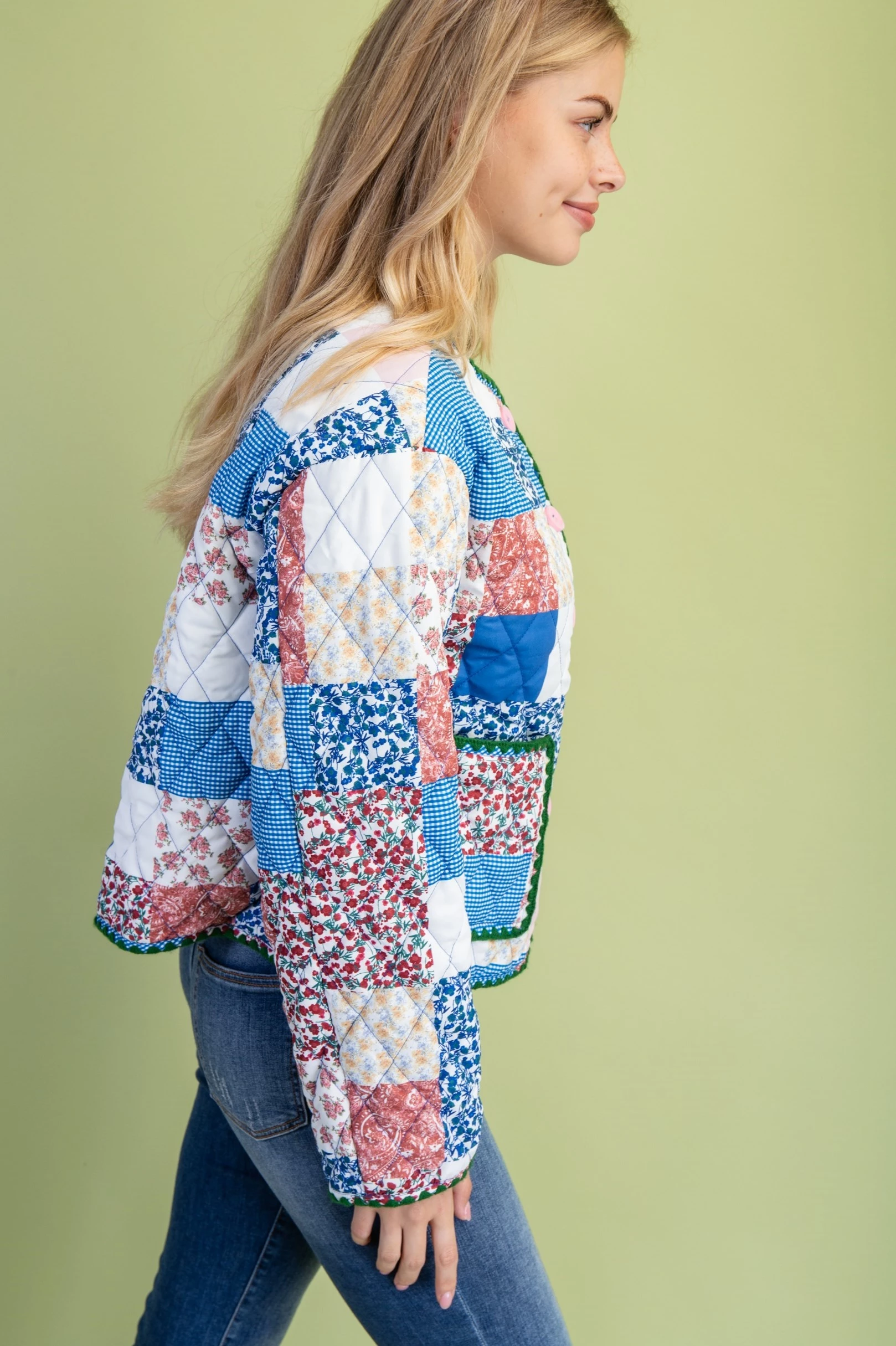 Mixed Patchwork Print Quilted Jacket with Stitching Details and Felt Buttons