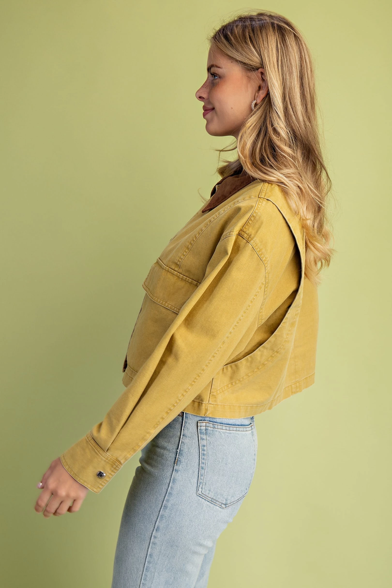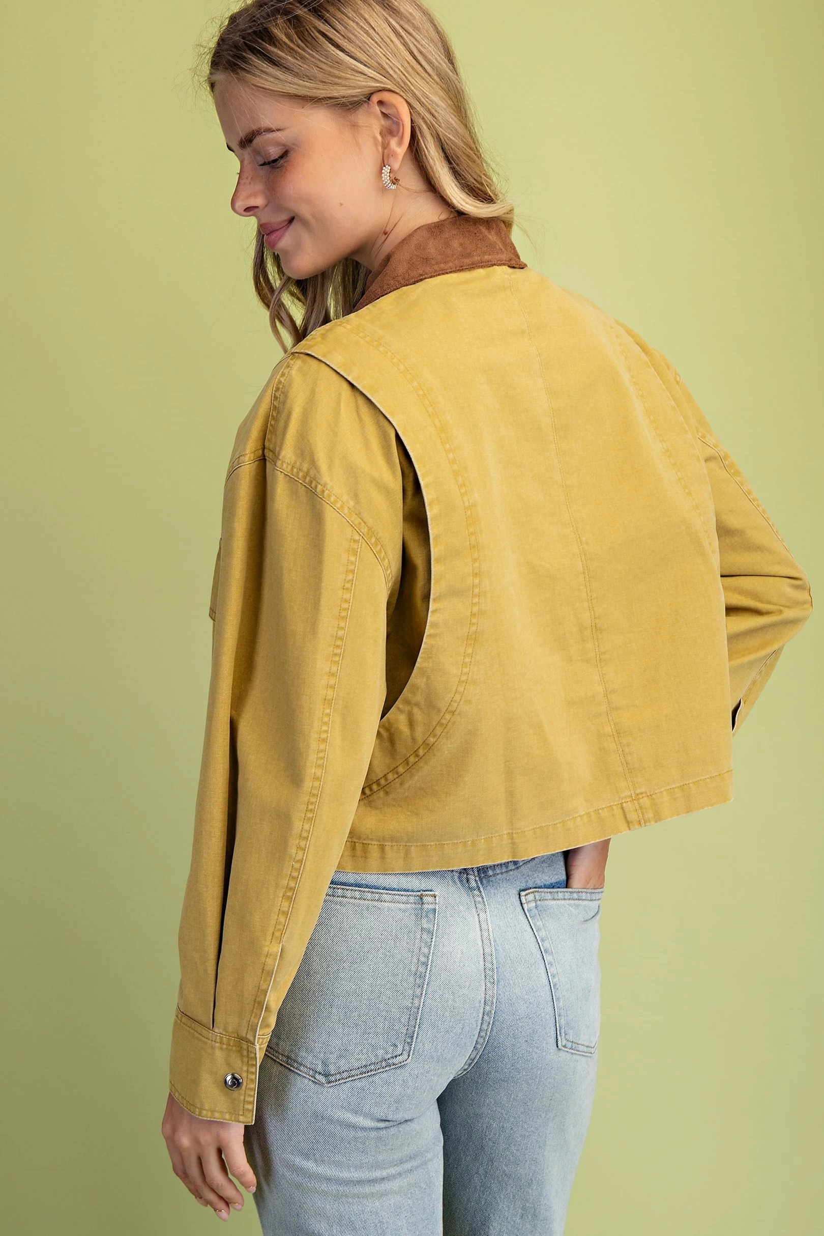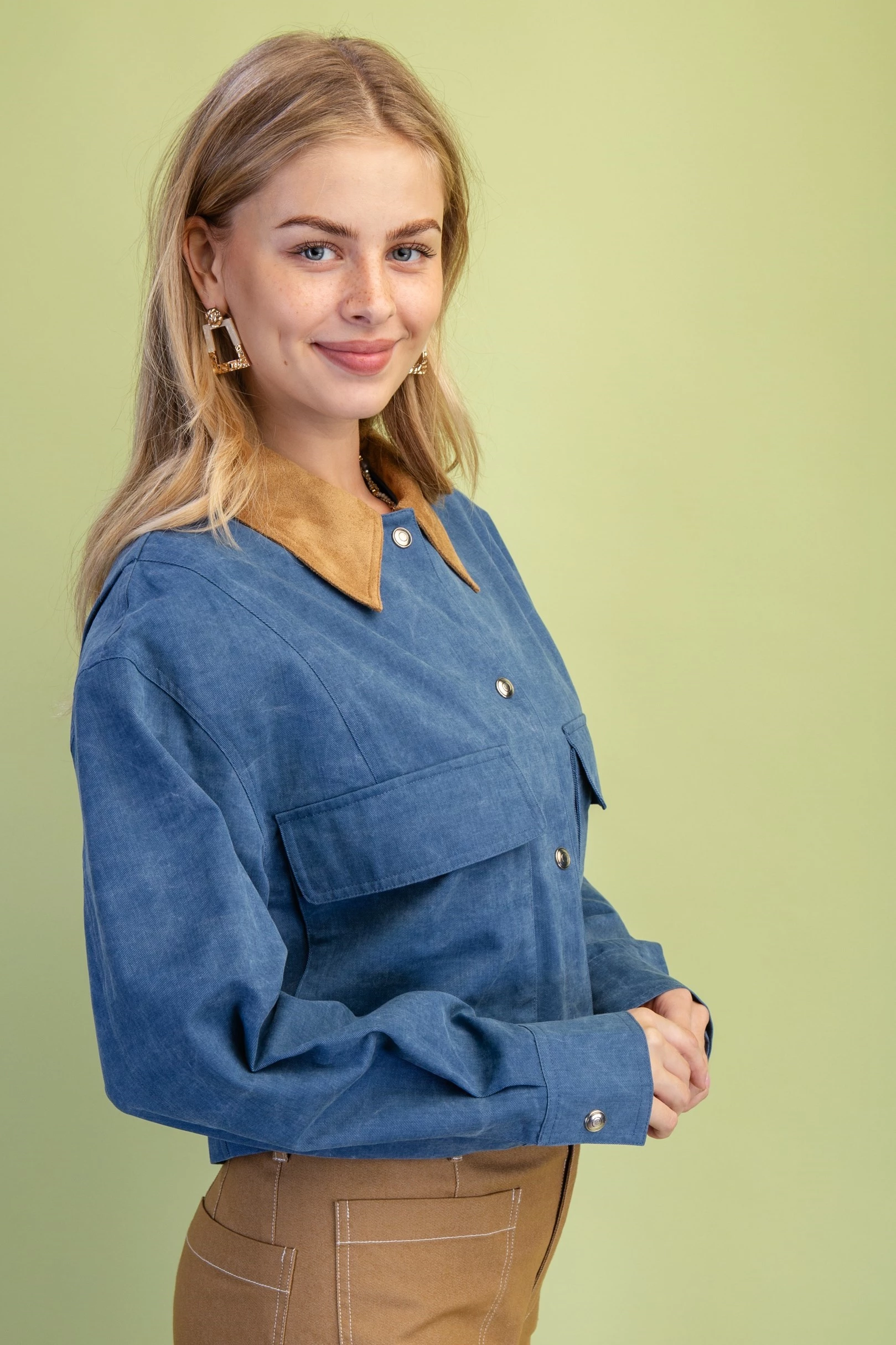 Snap Closure Jacket with a Suede Collar and Faux Back Pocket