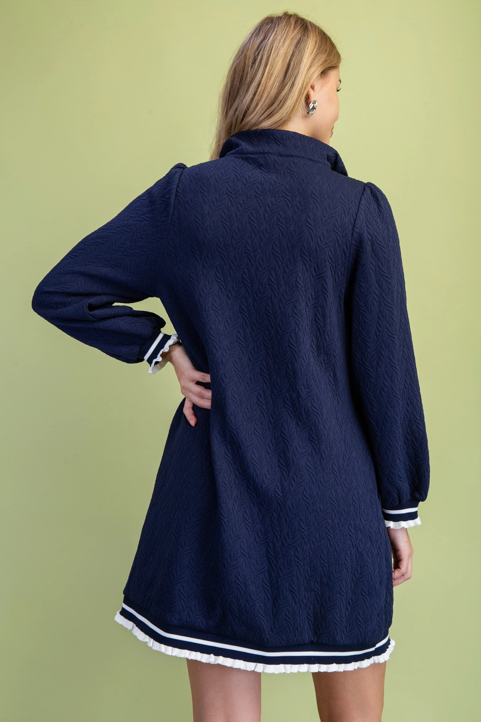 Textured Half Zip Dress with Ruffled Contrasting Stripe Details
