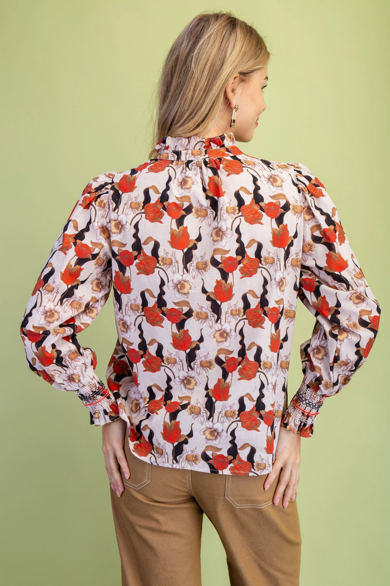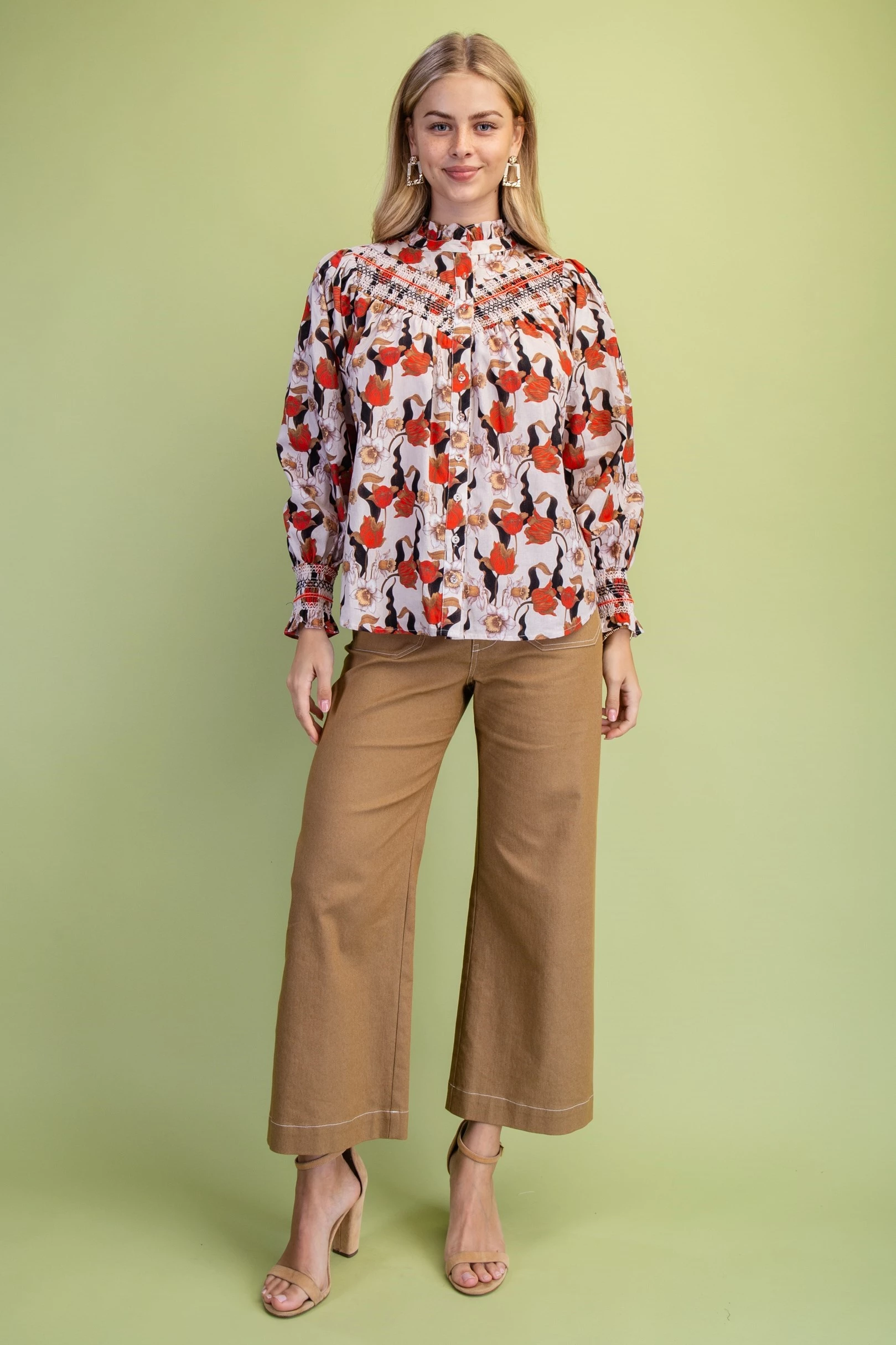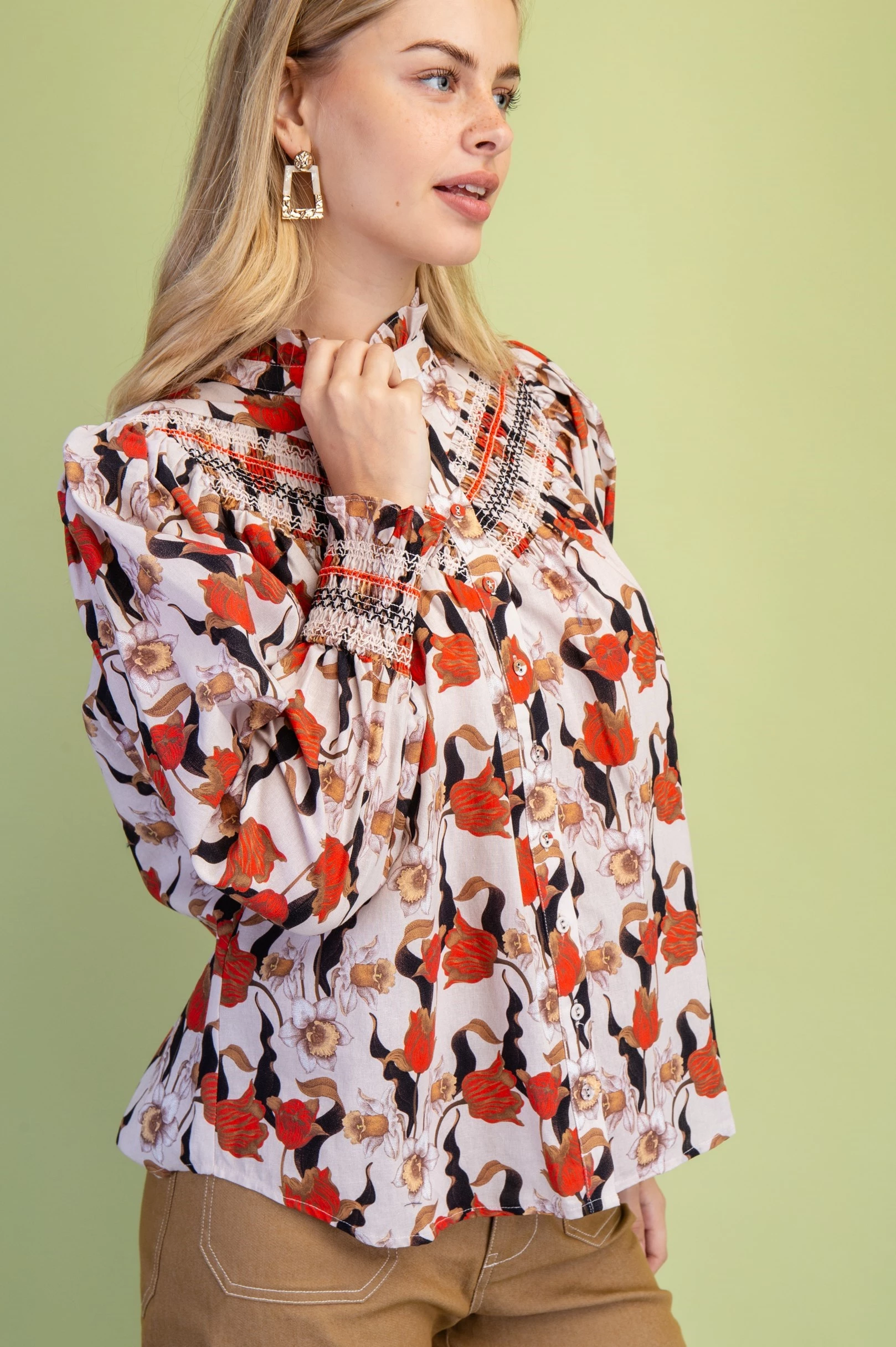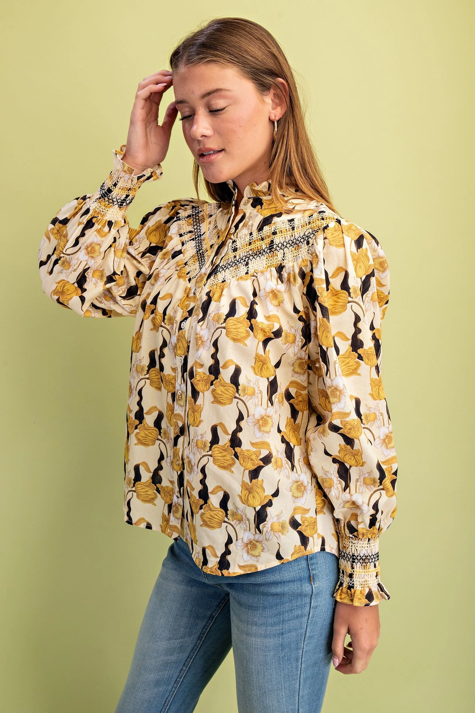 Floral Long Sleeve Button Down with Decorative Smocking Details and a Ruffled Collar