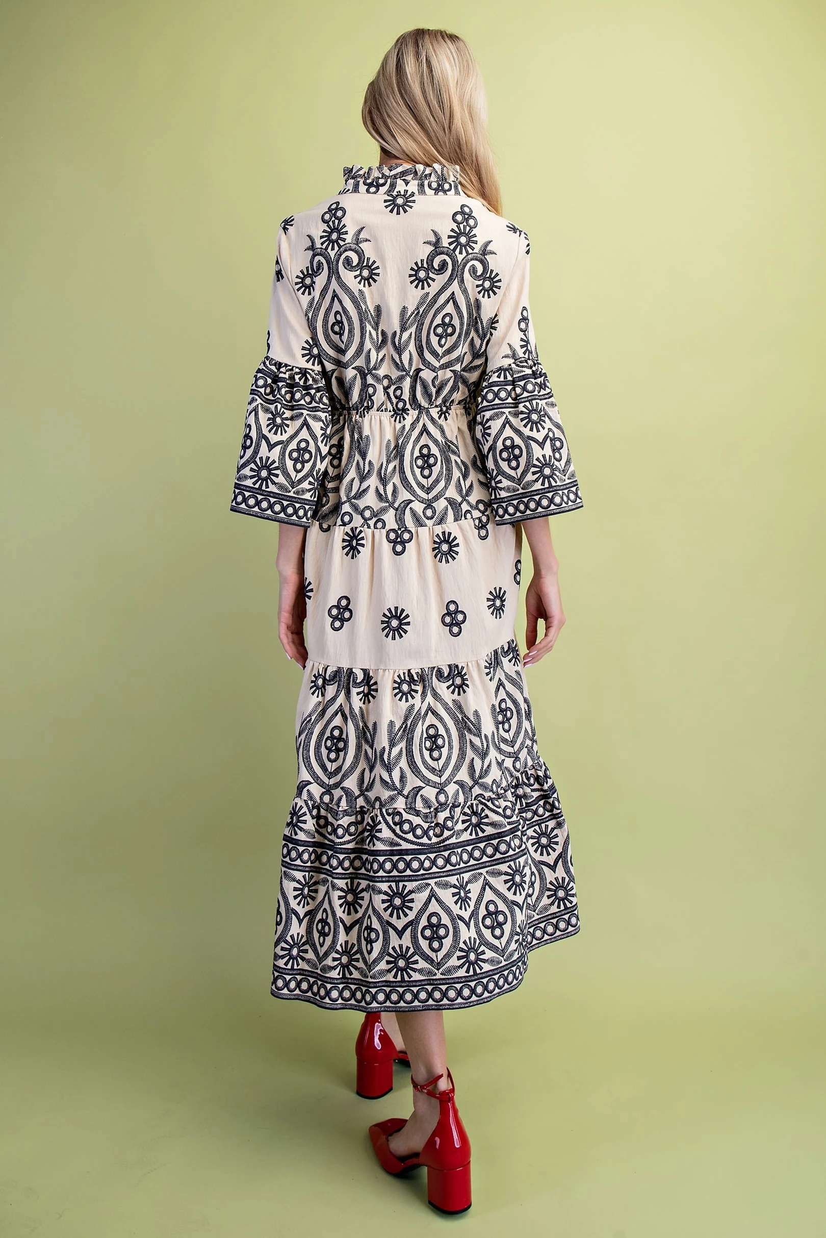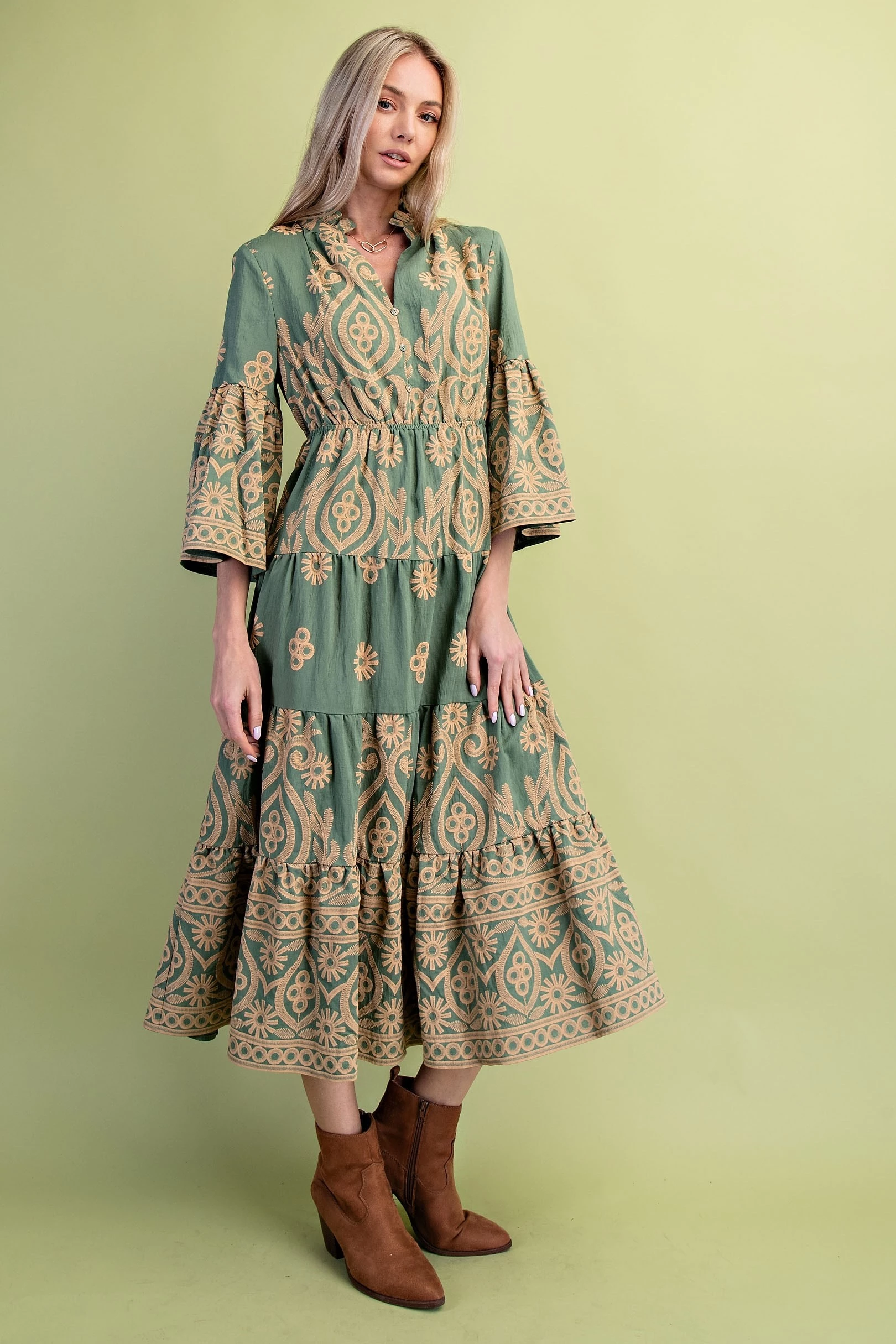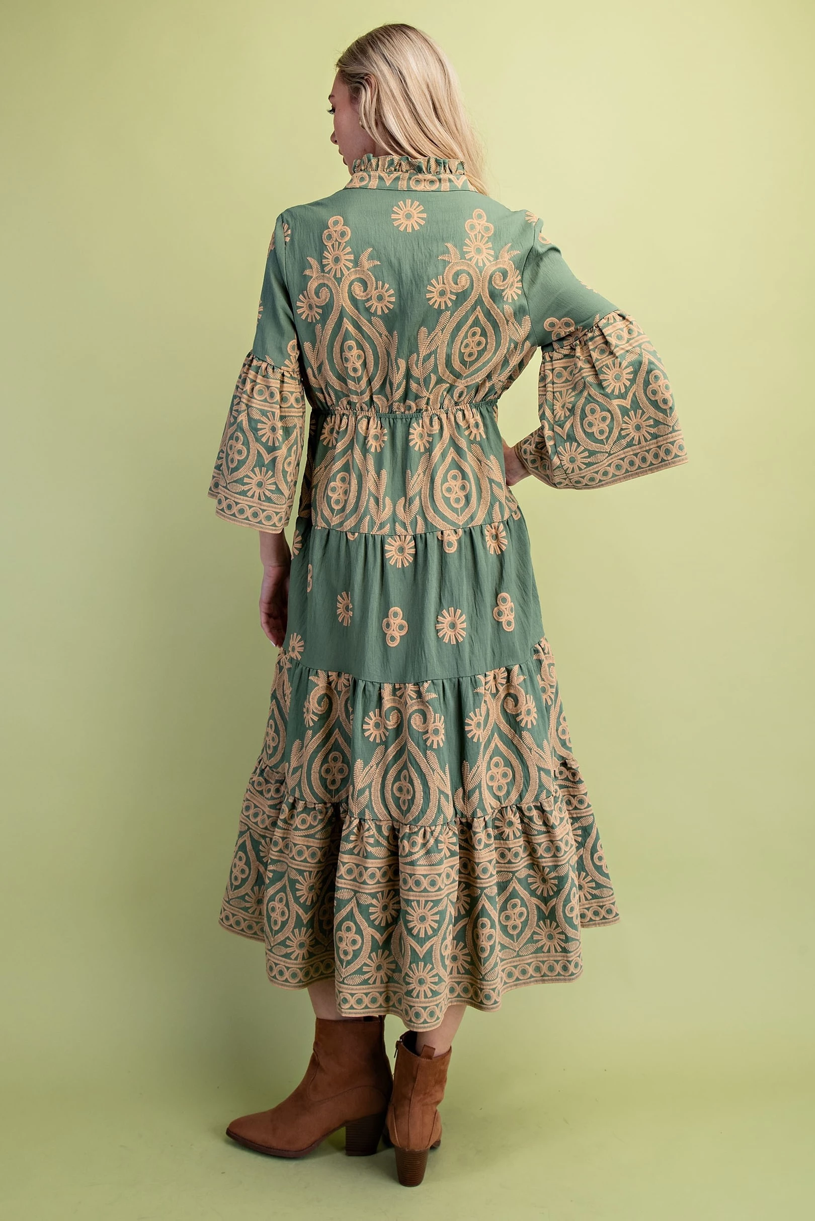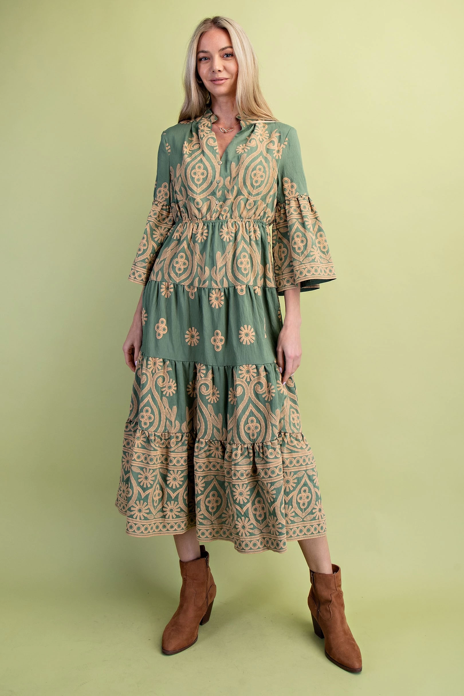 Textured Print Tiered Dress with a Ruffled Neck and Bell Sleeves