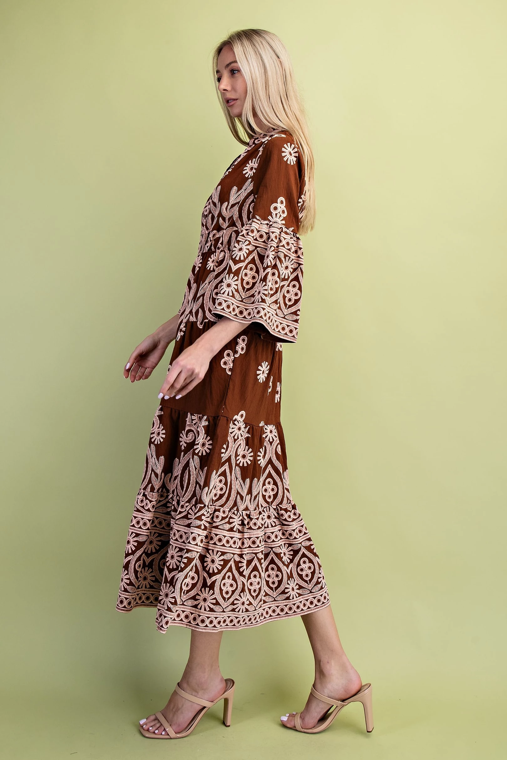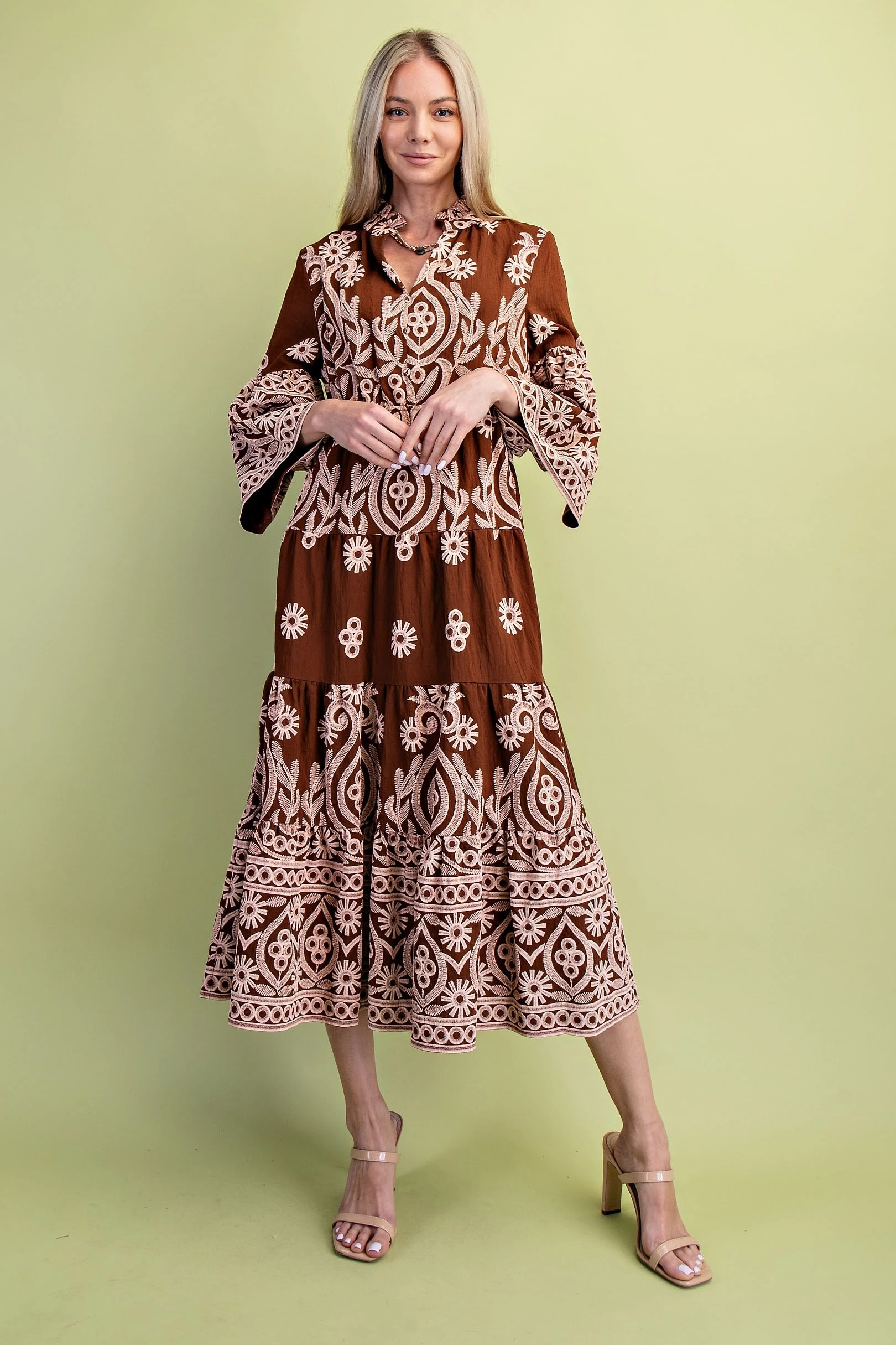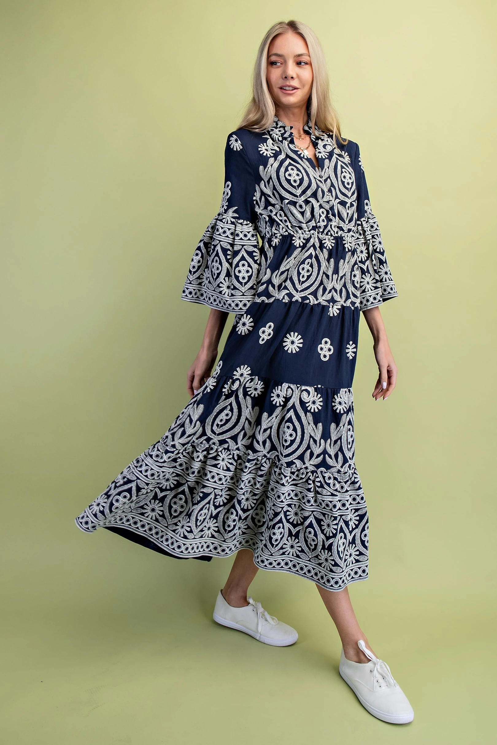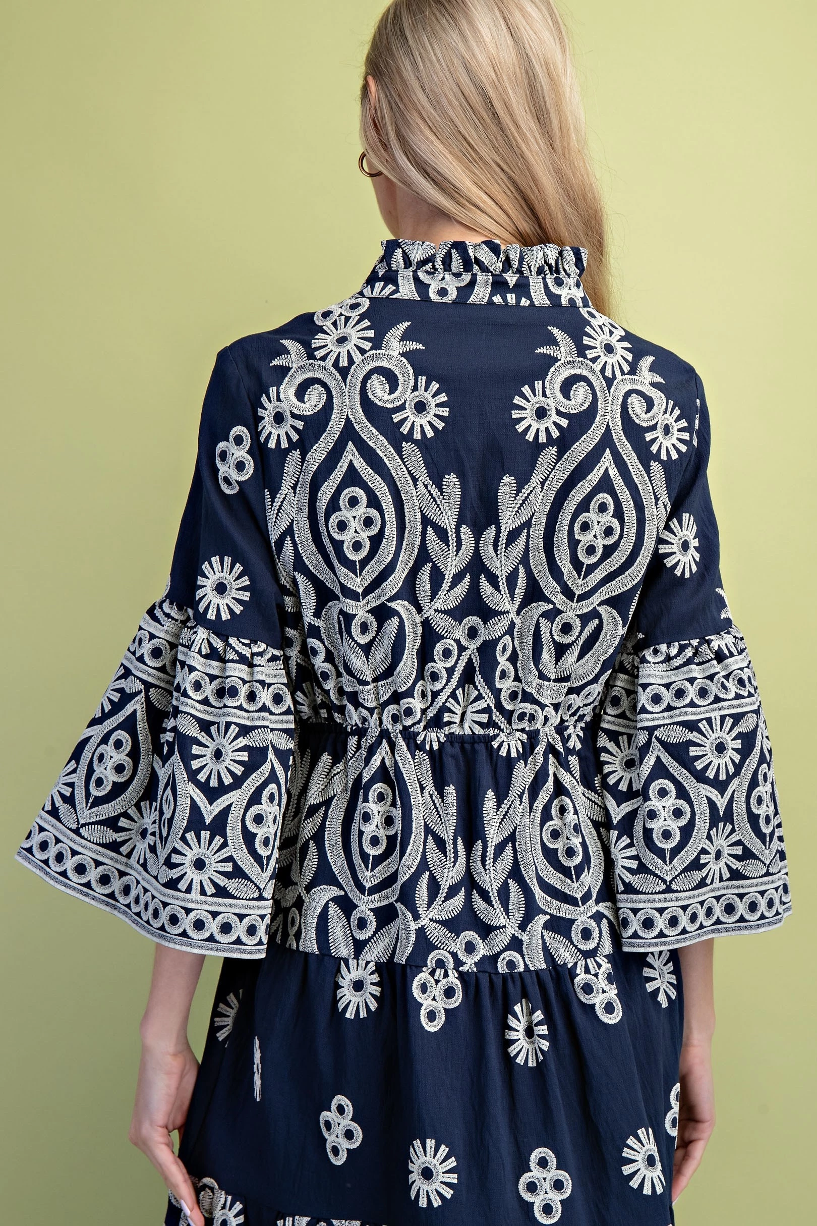 Textured Print Tiered Dress with a Ruffled Neck and Bell Sleeves