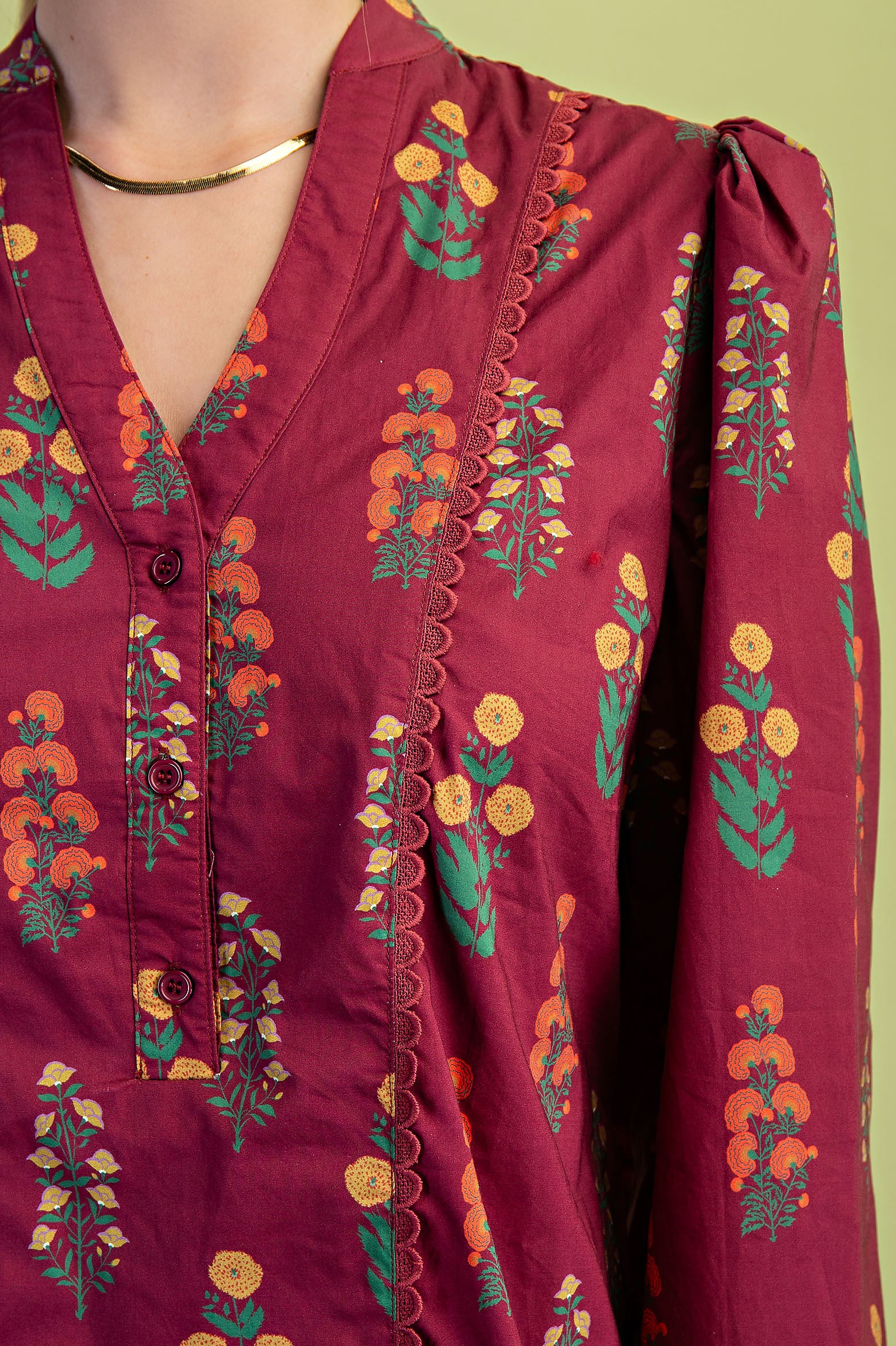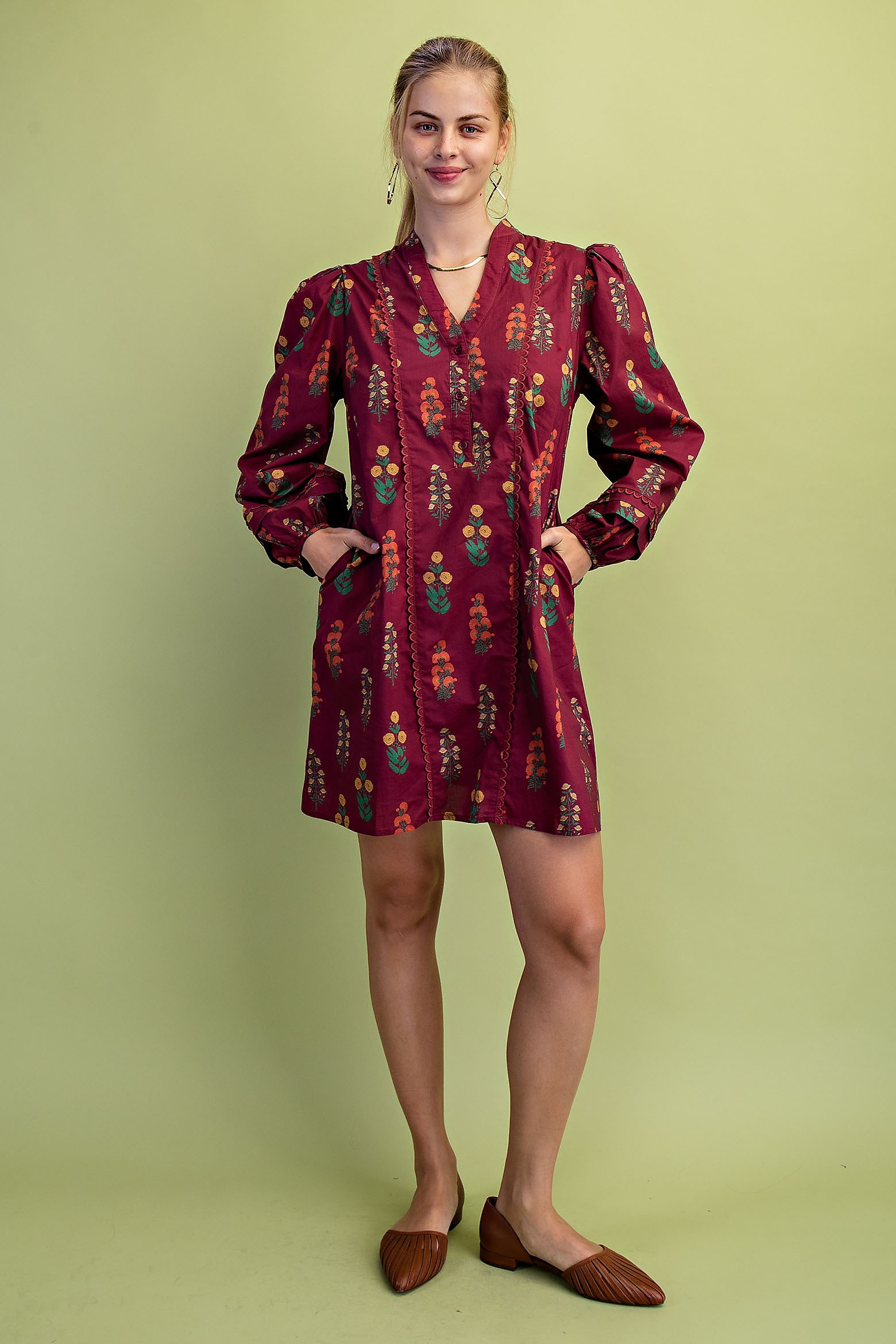 Floral Print Half Button Mini Dress with Balloon Sleeves and Ric-Rac Trim Details. The Dress is Lined