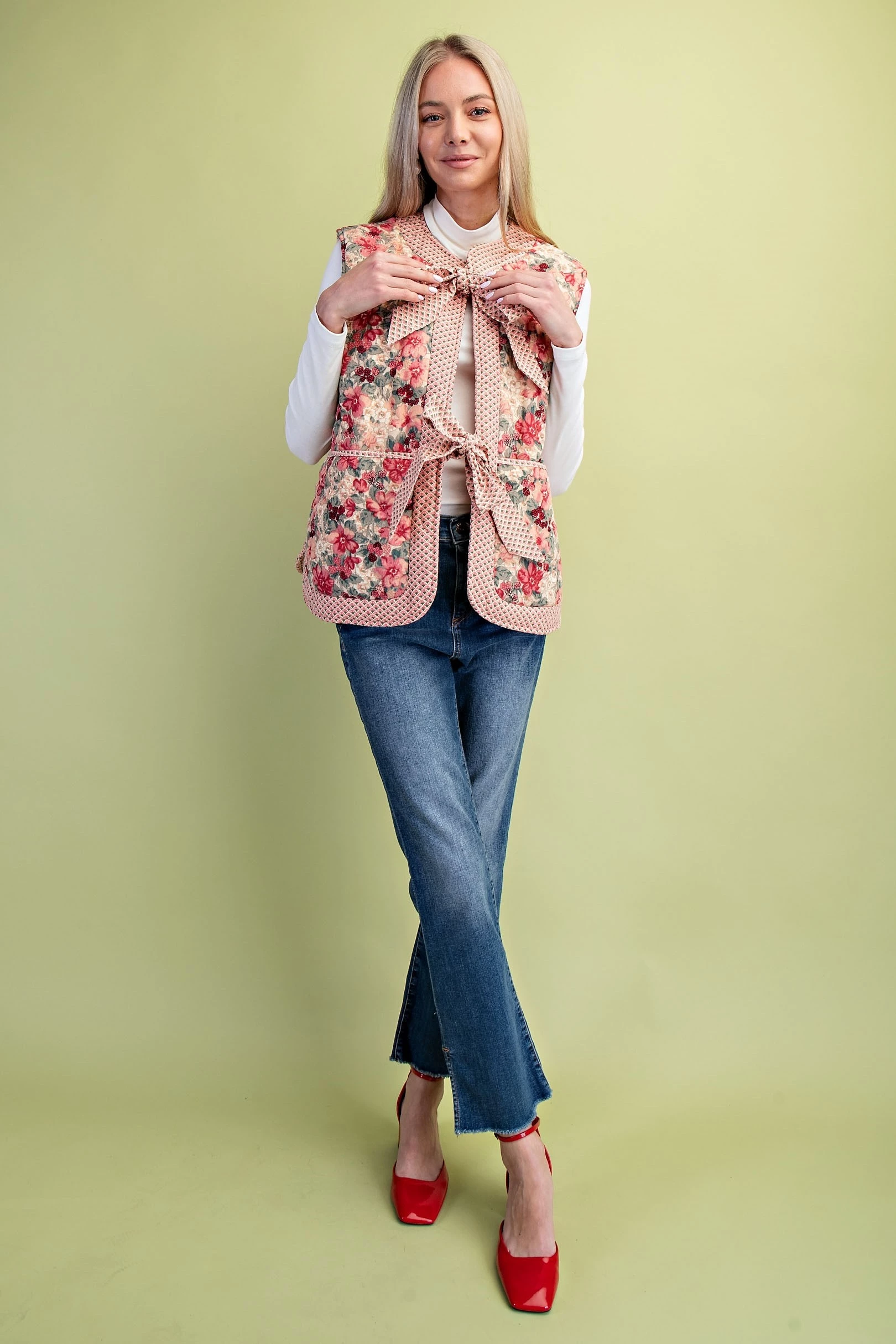 Quilted Floral Print Vest with Two Front Bow Ties and Contrasting Fabric Details