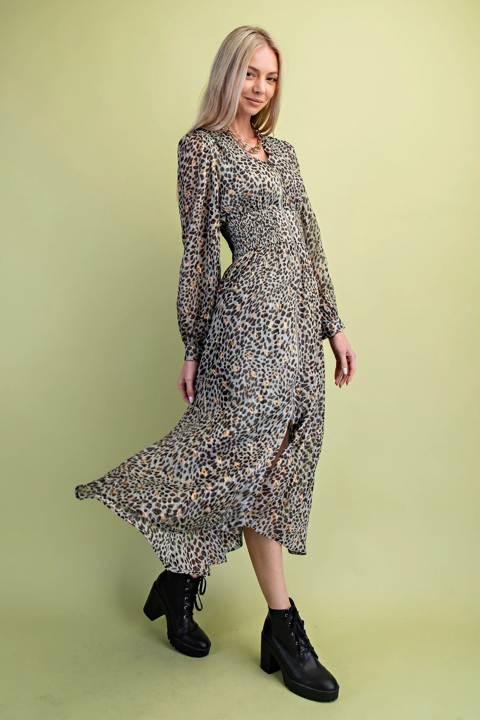 Metallic Accented Leopard Print V-Neck Midi Dress with a Front Zipper and Smocked Waist. The Dress is Lined