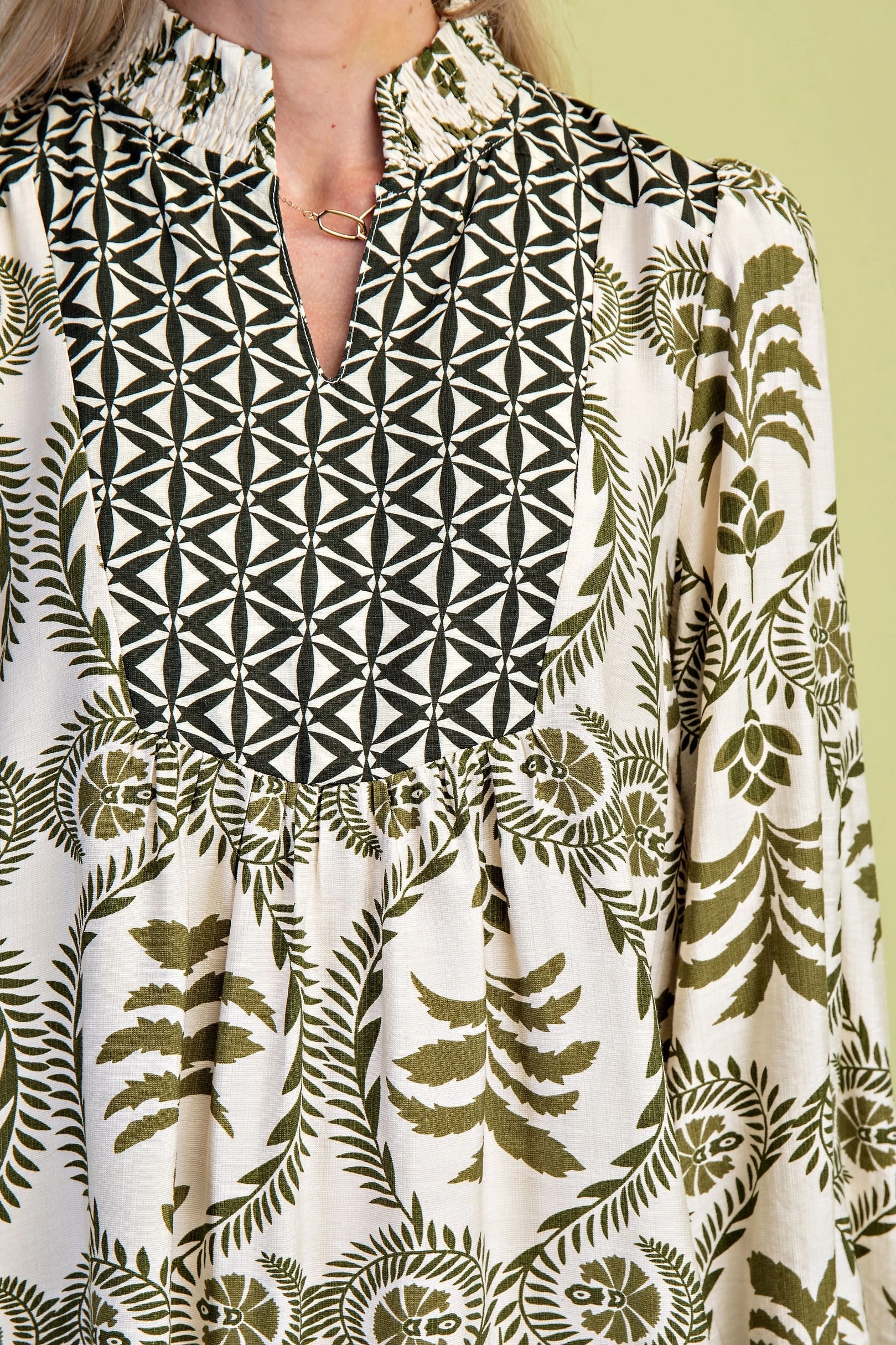 Printed V-Neck Dress with a Smocked Neck and Contrasting Fabric on Yoke