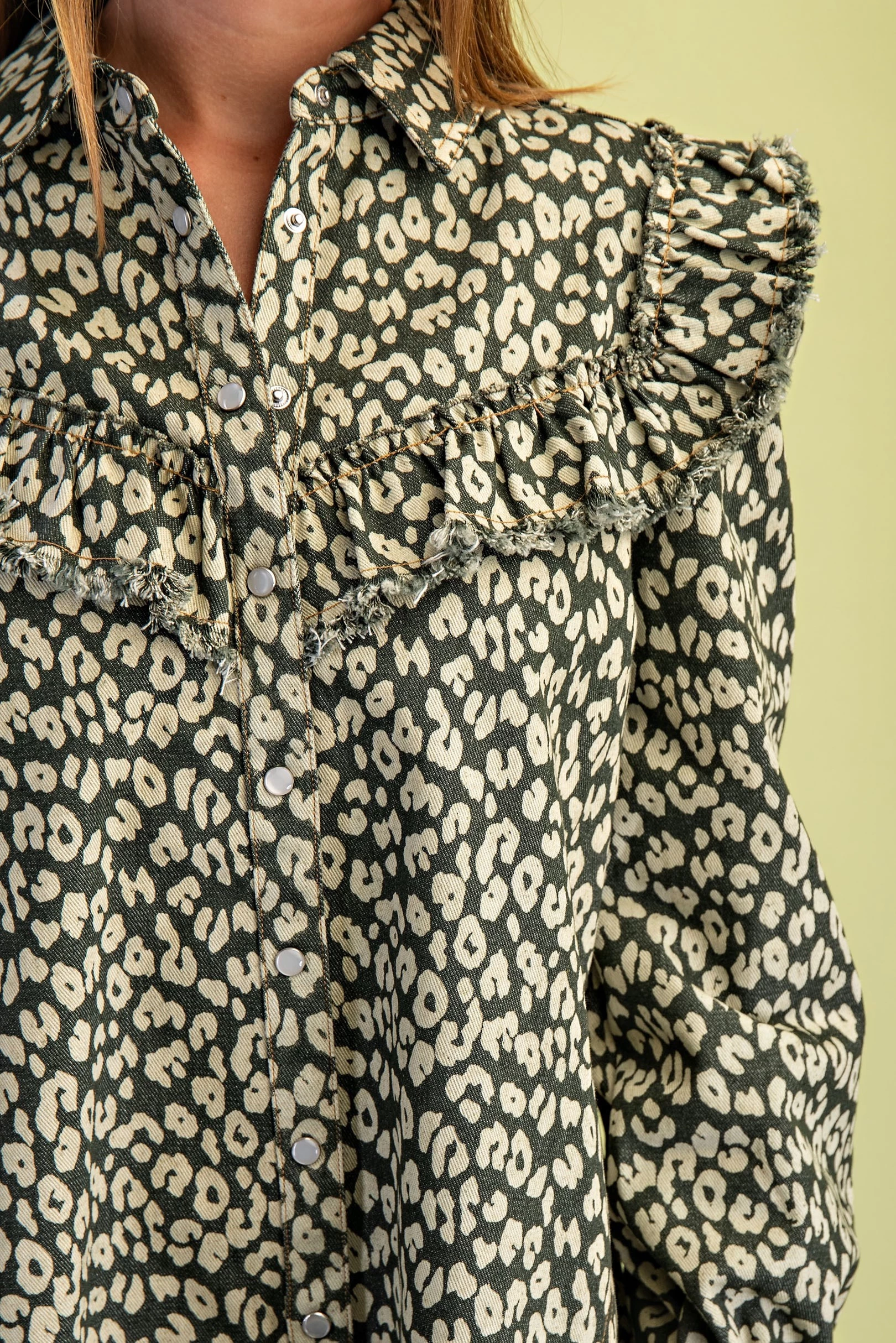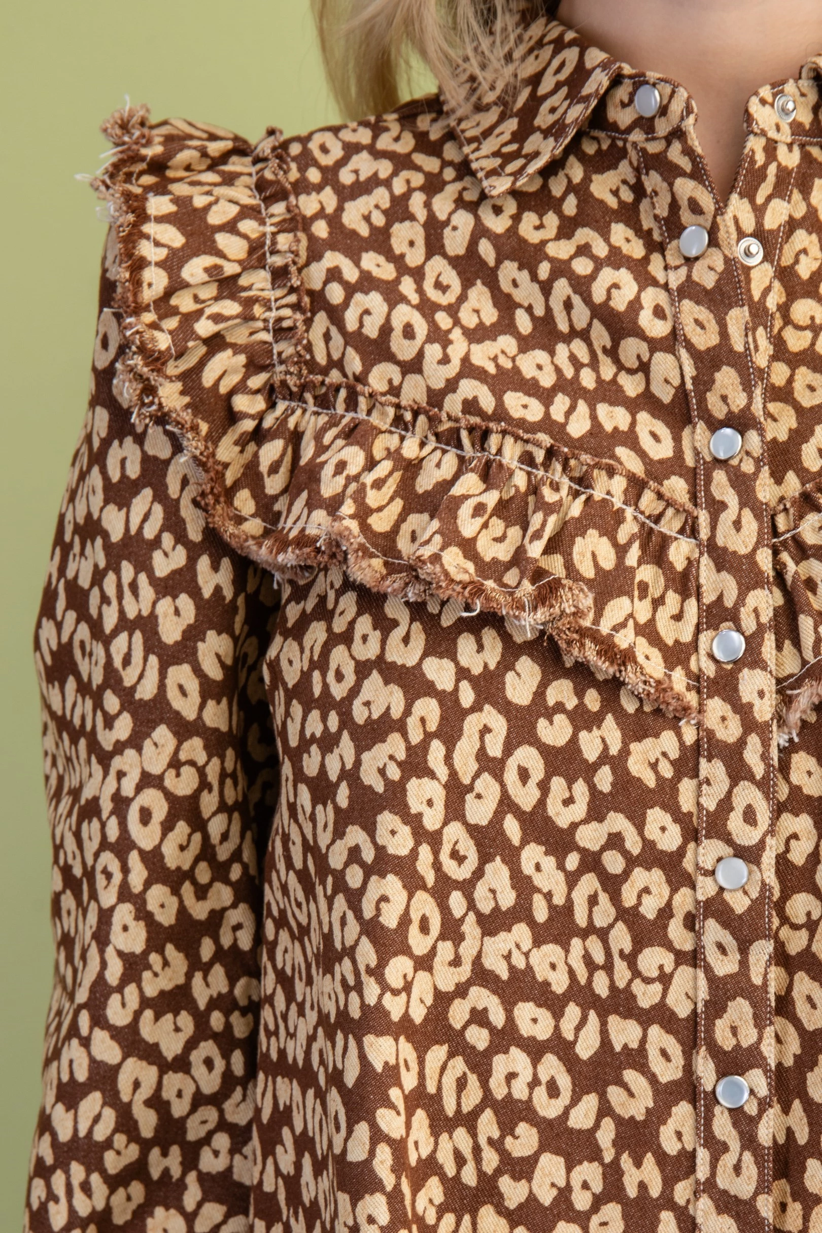 Leopard Print Denim Snap Closure Shirt Dress with Ruffle Details