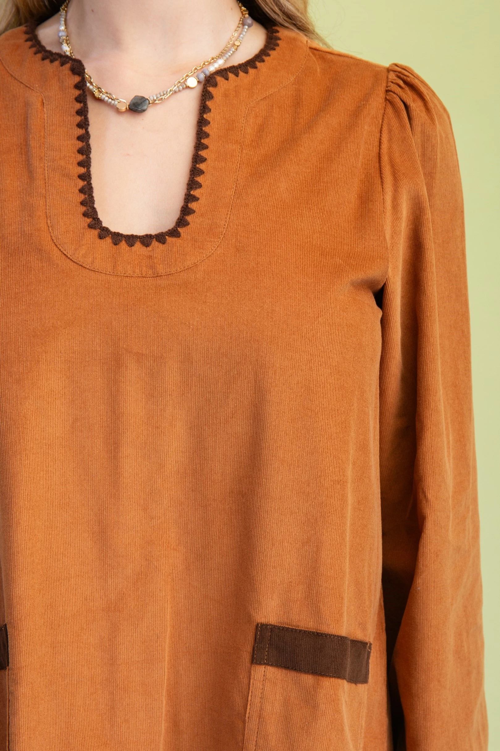Corduroy U-Neck Dress with Decorative Stitching Details