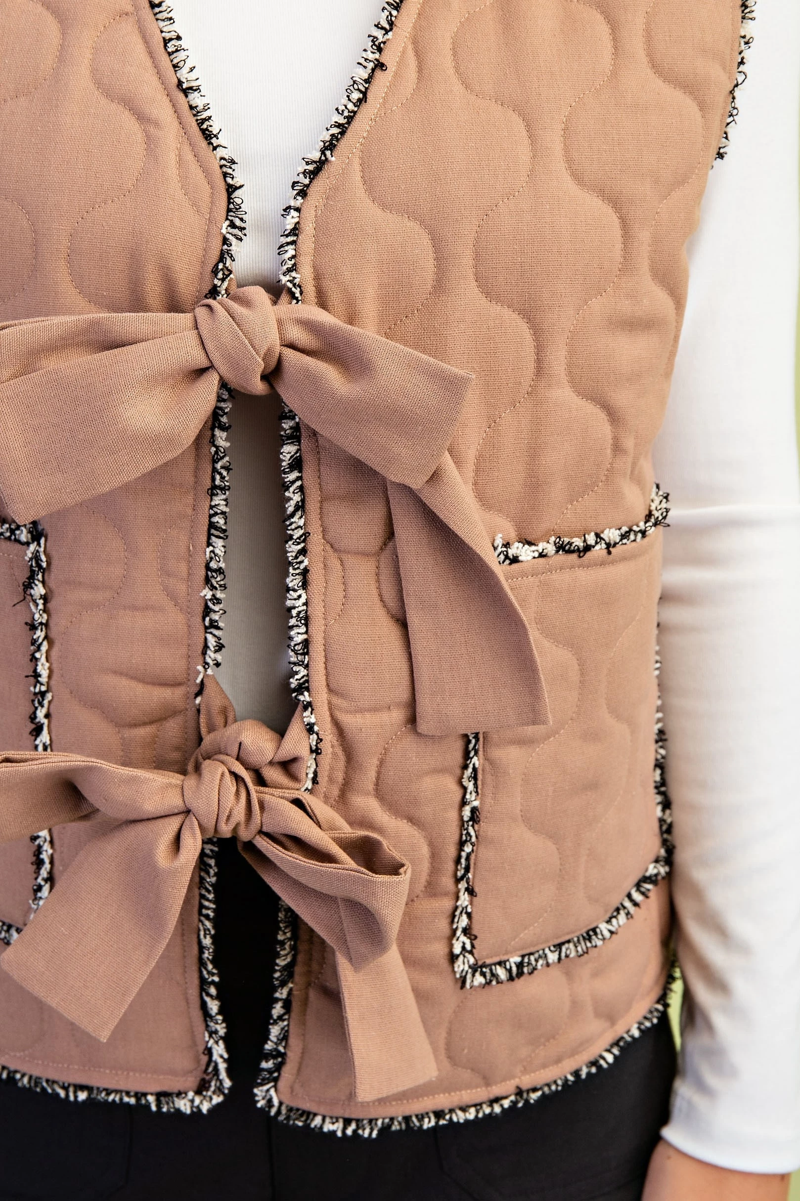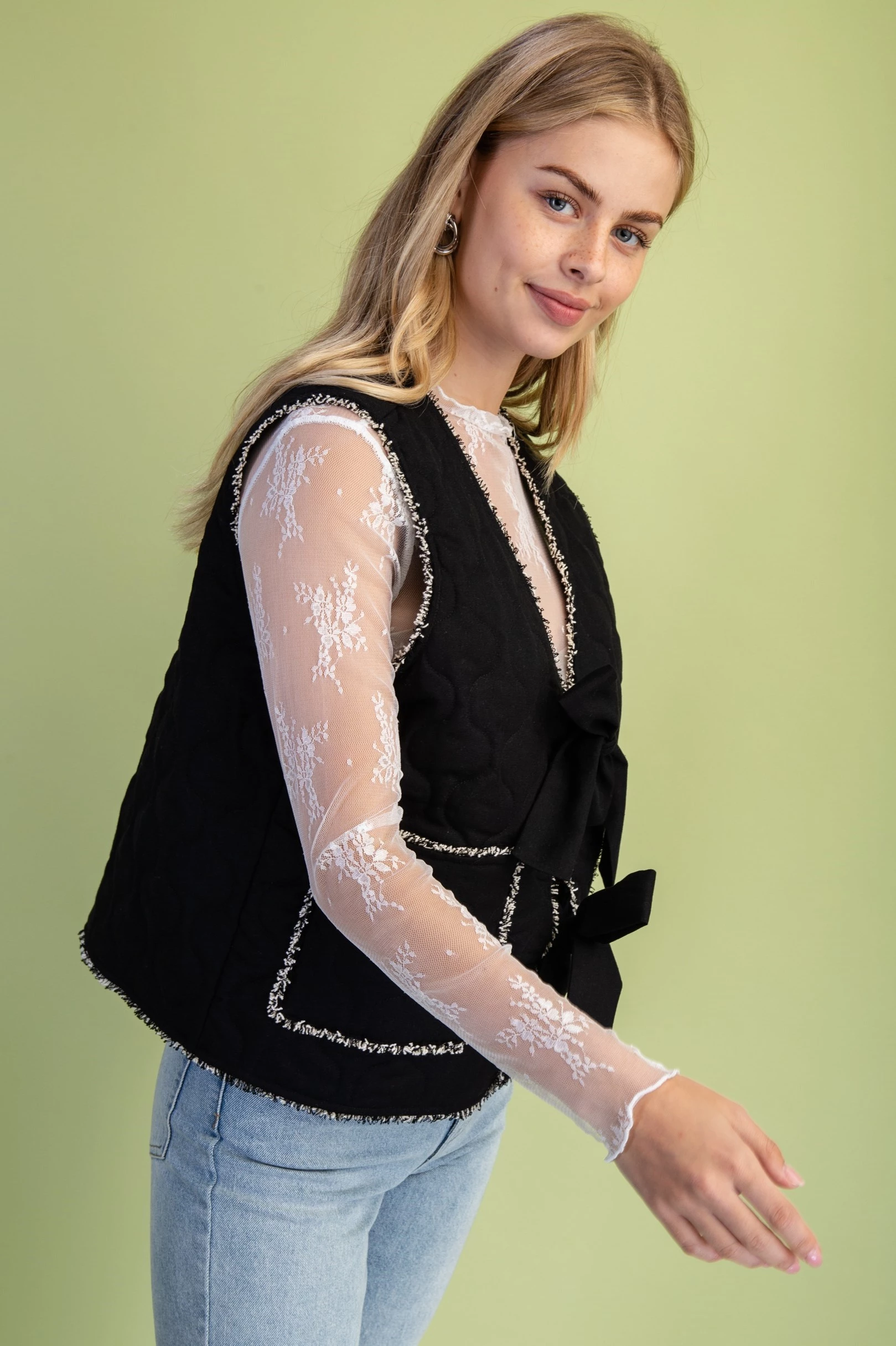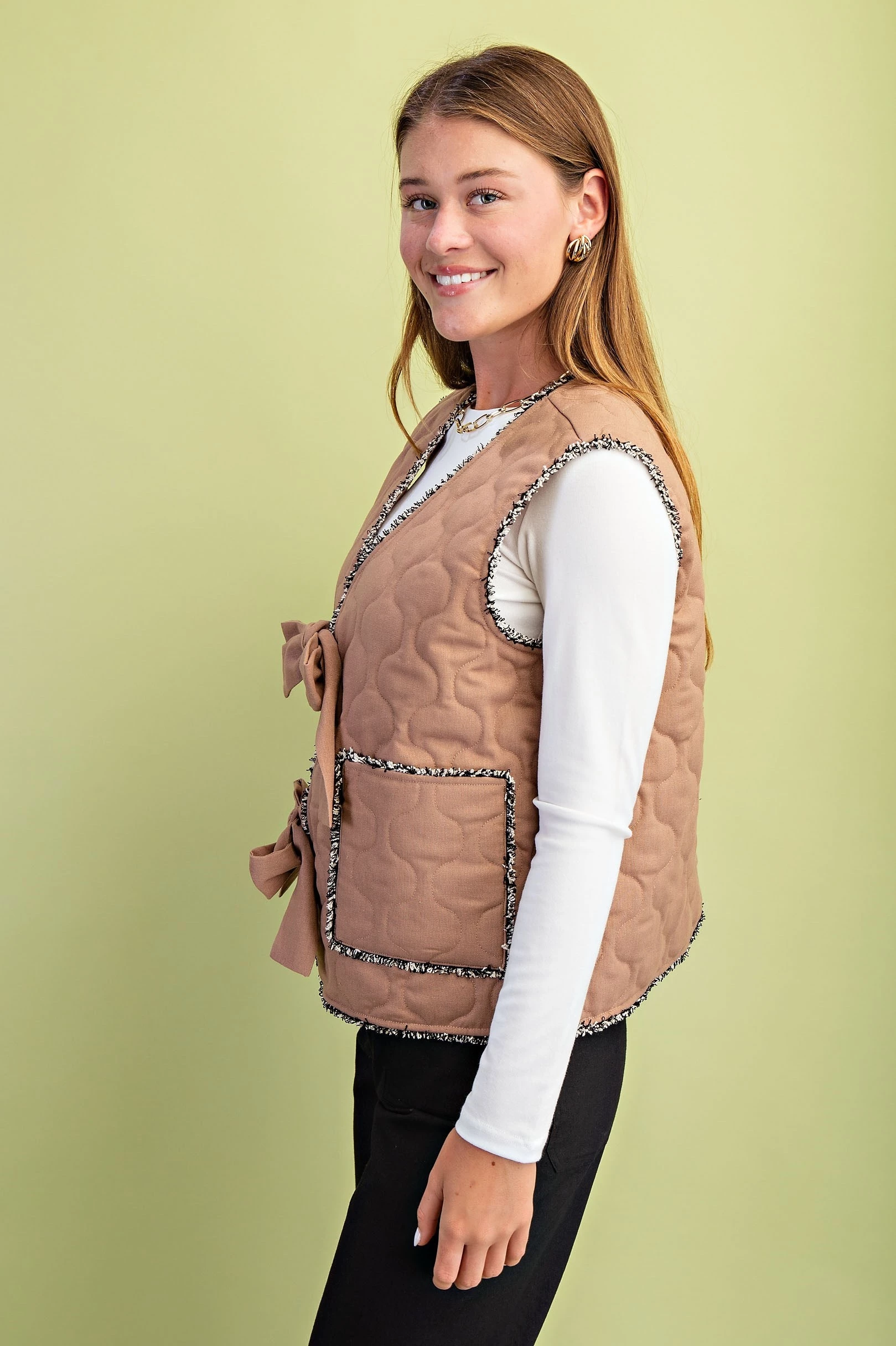 Quilted Button Up Vest with Frayed Fringe Details and Front Ties