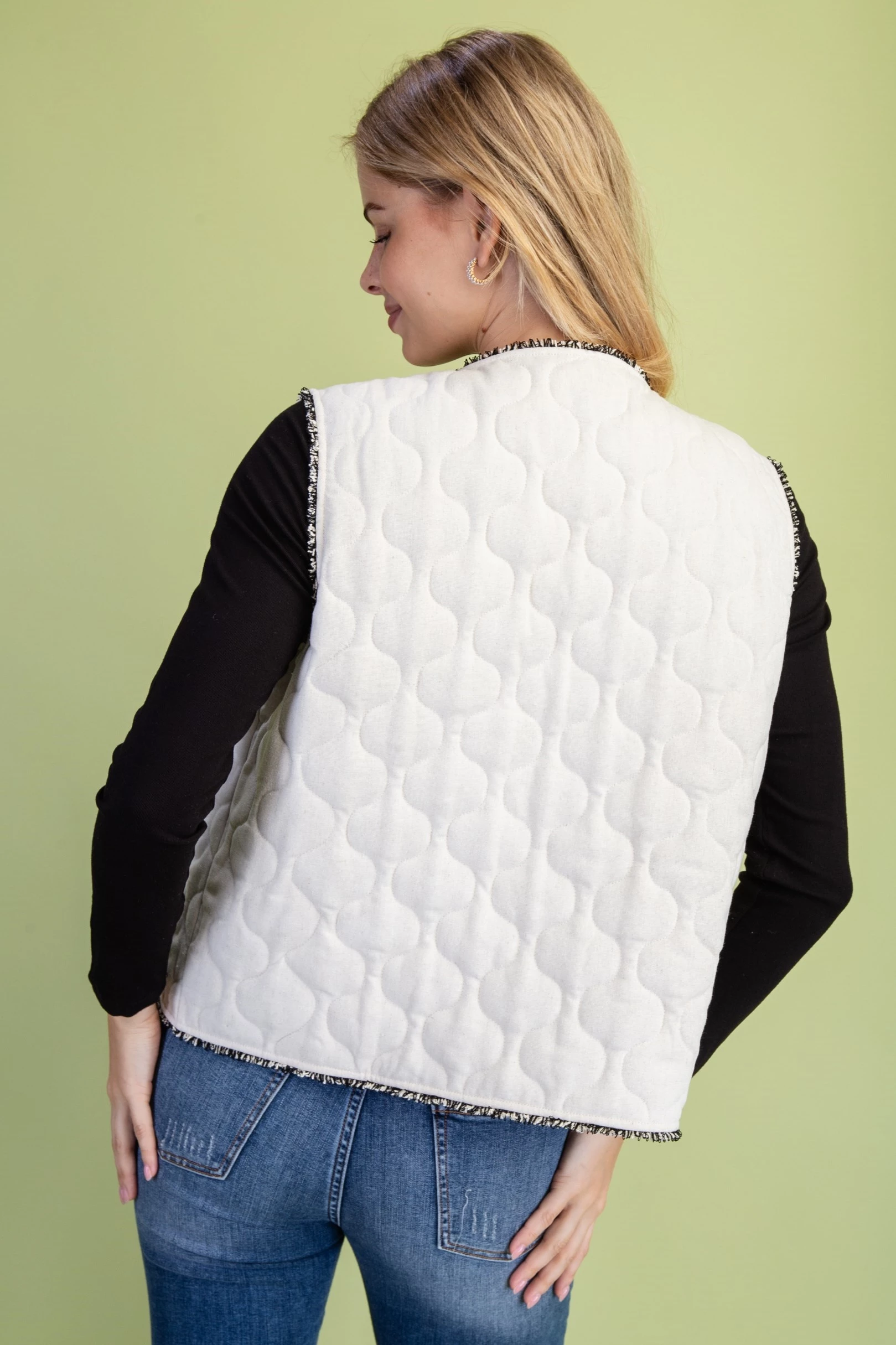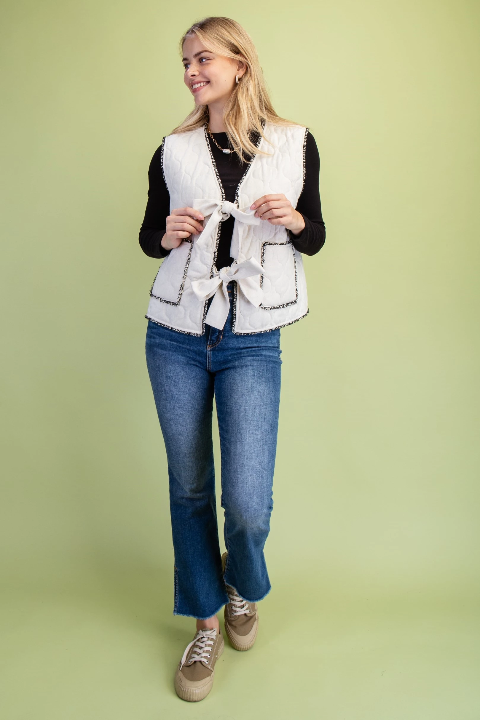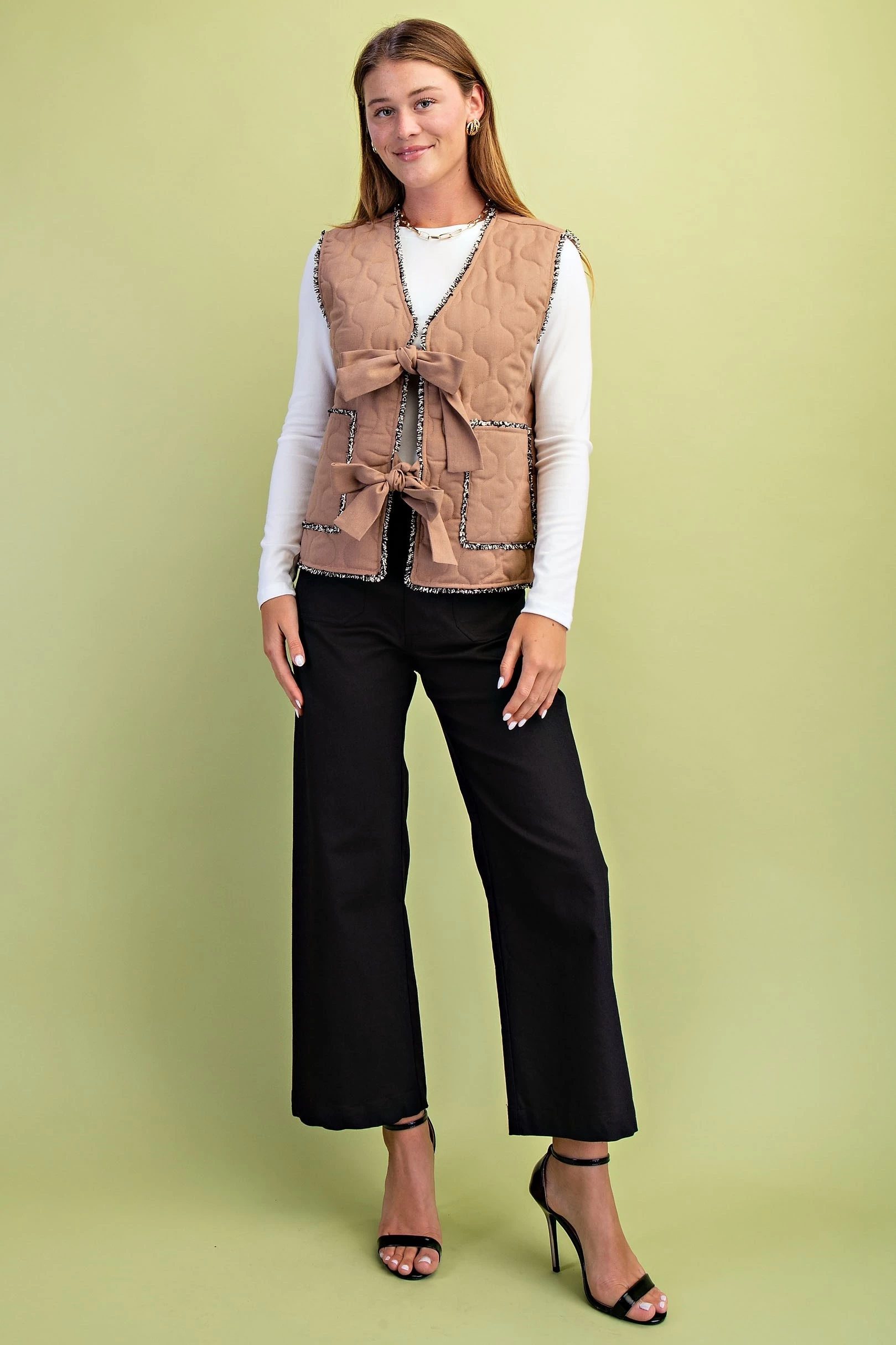 Quilted Button Up Vest with Frayed Fringe Details and Front Ties