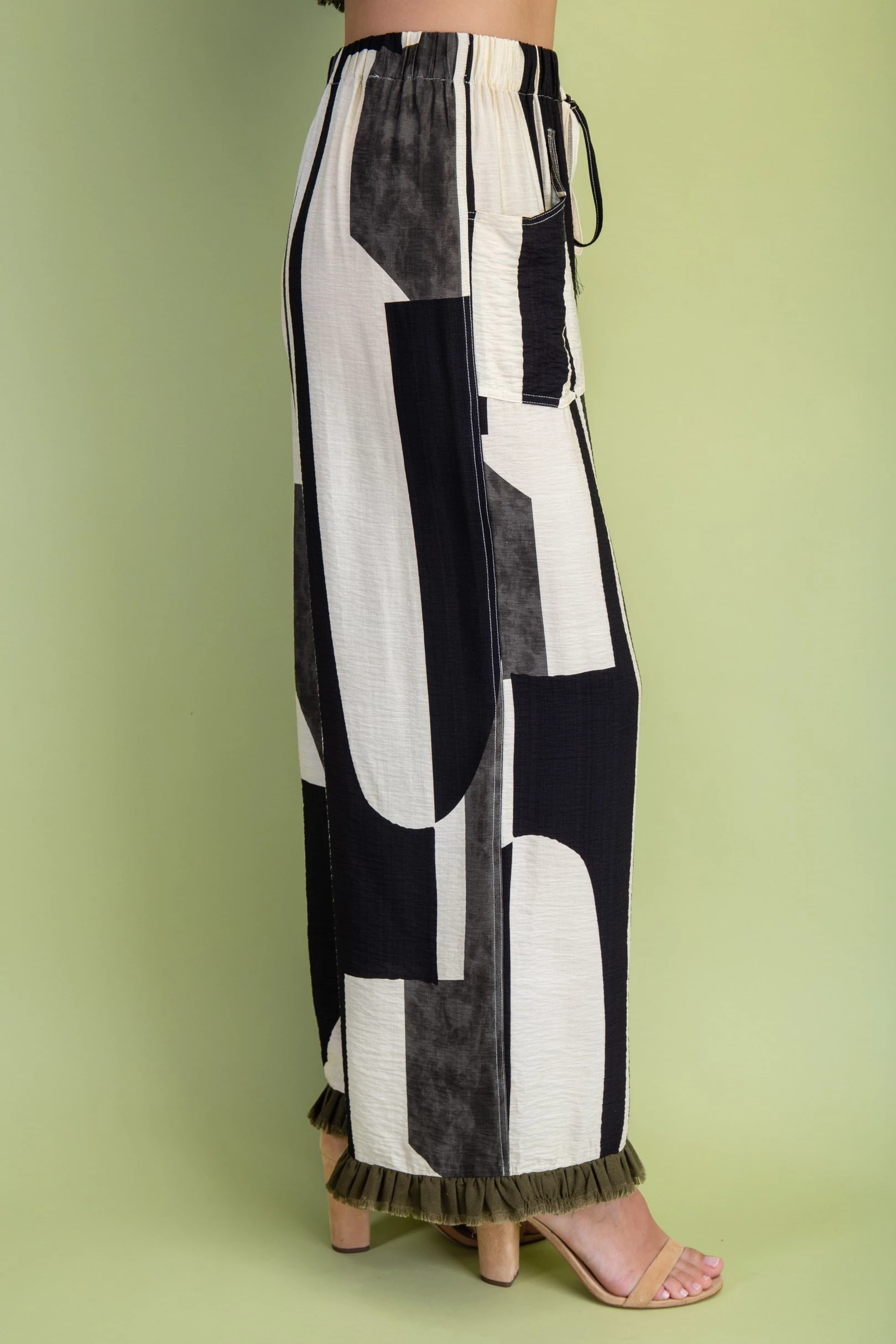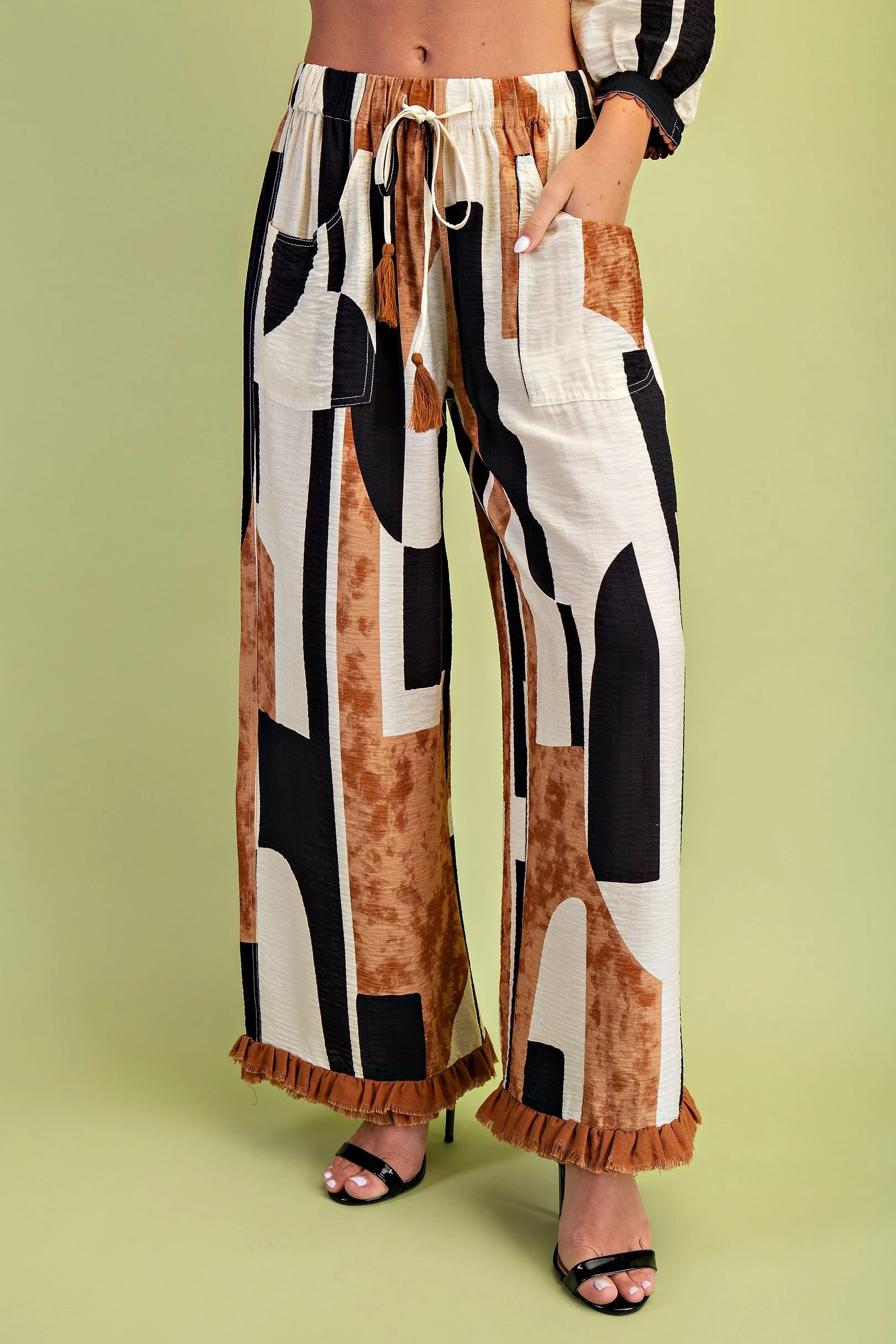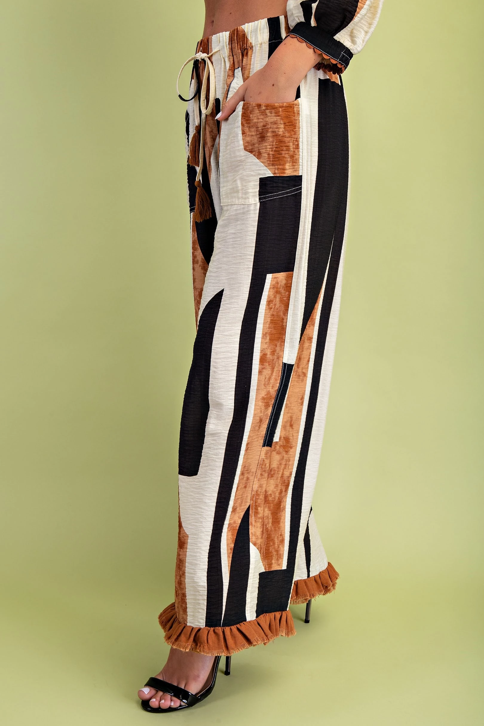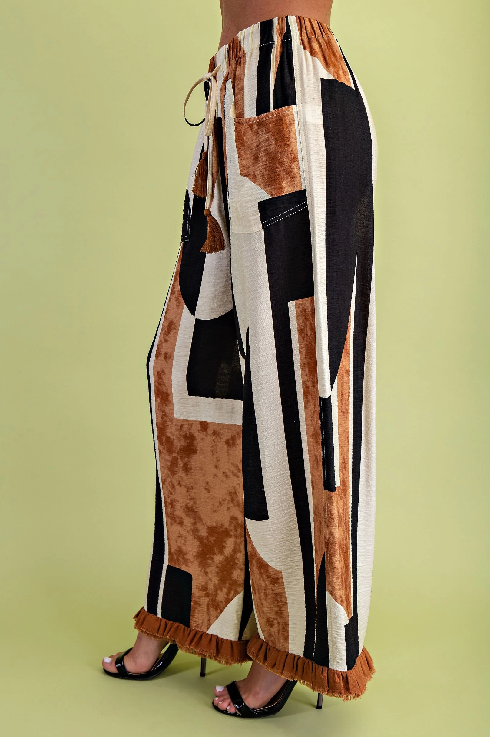 Abstract Print Relaxed Fit Pants with a Frayed Hem and Tassel Drawstring