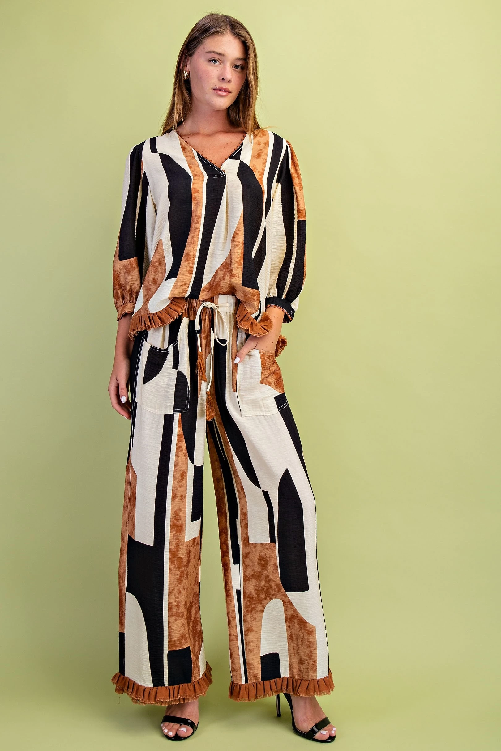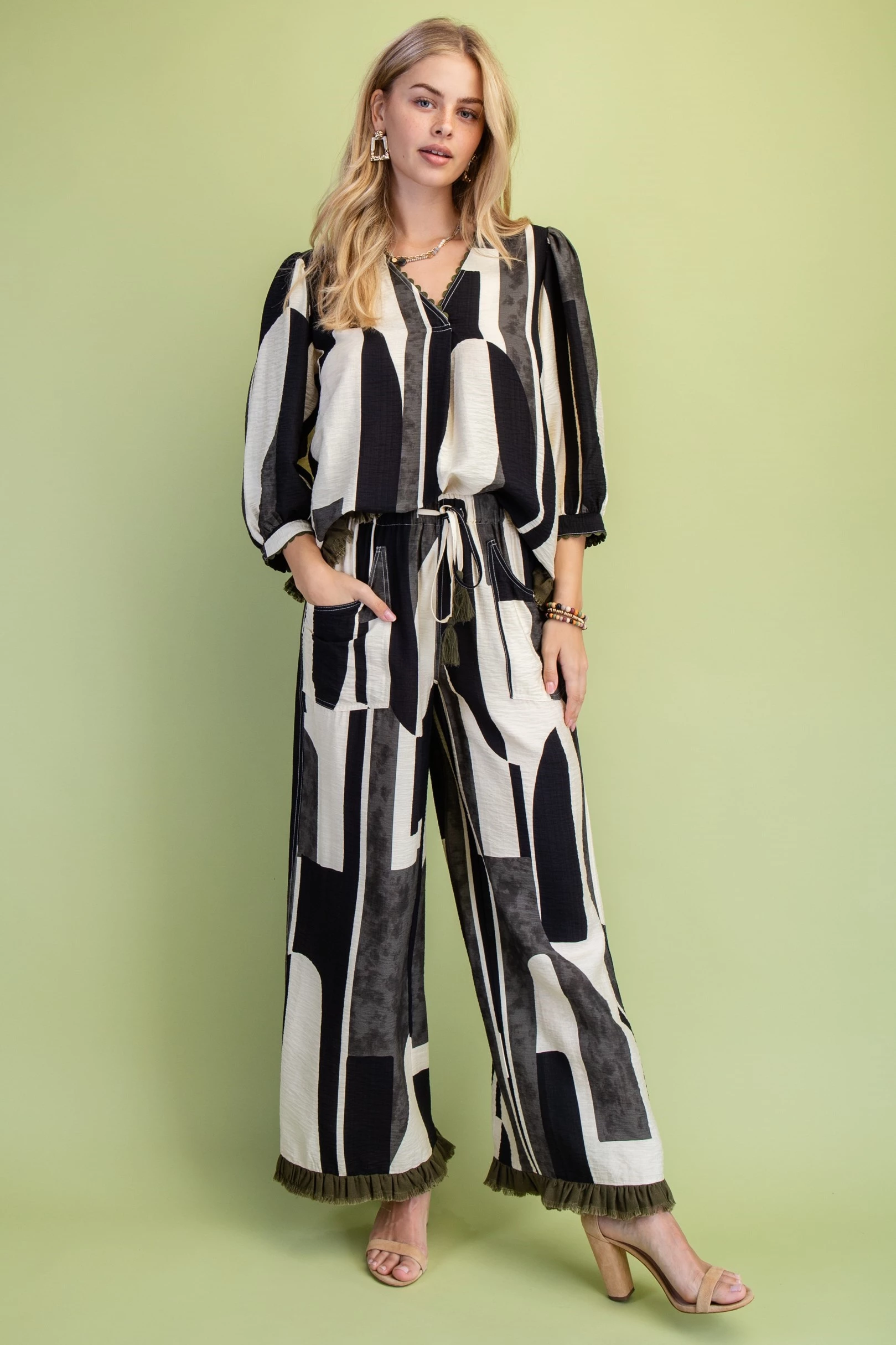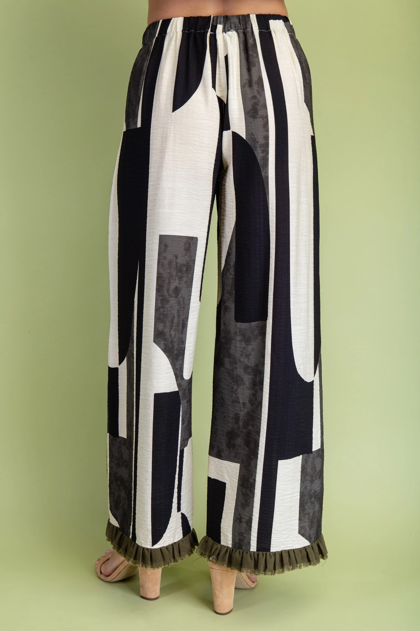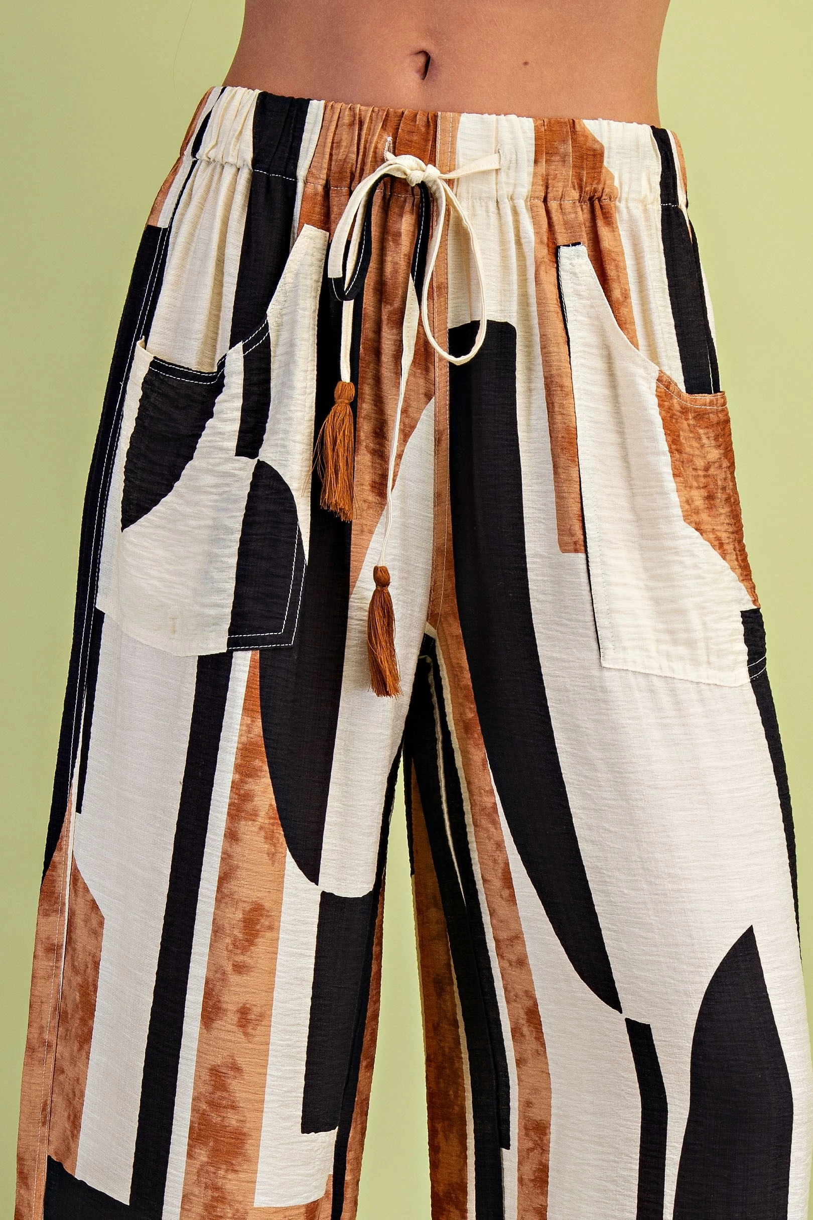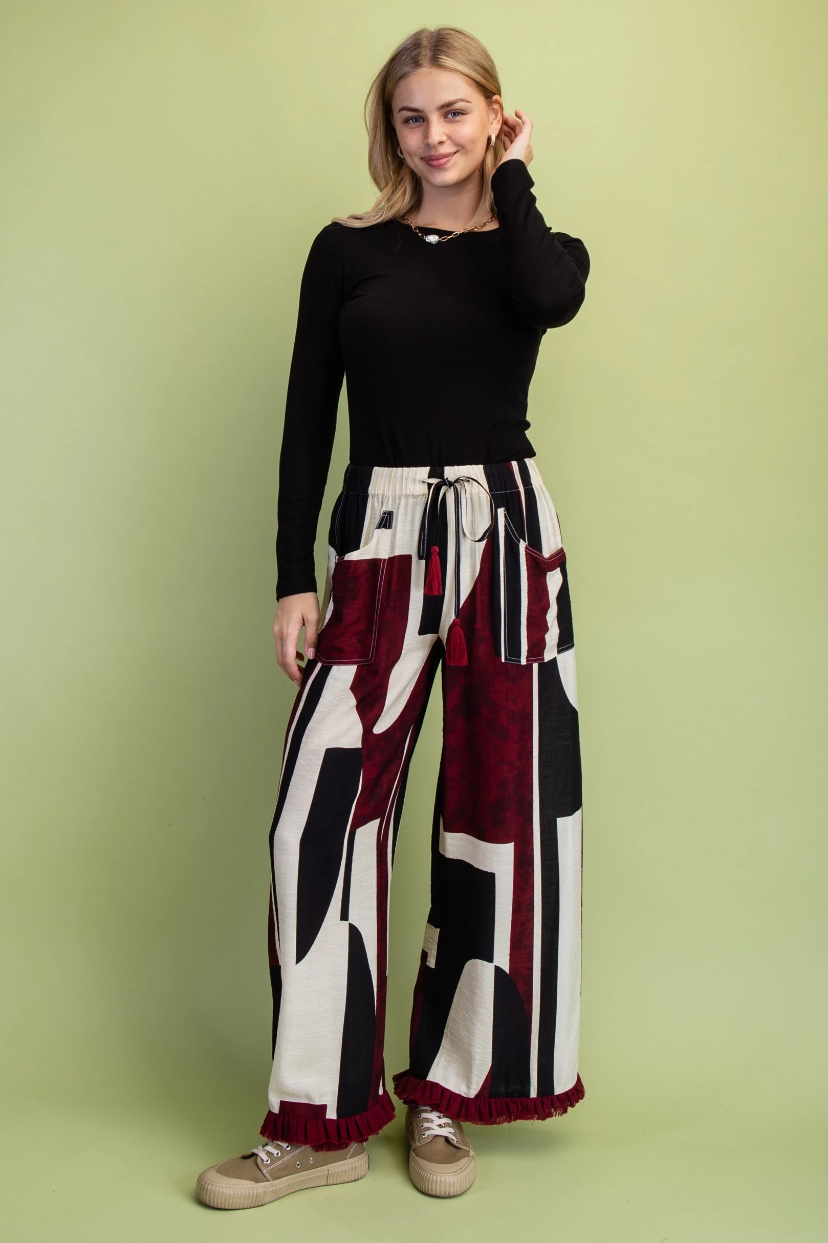 Abstract Print Relaxed Fit Pants with a Frayed Hem and Tassel Drawstring