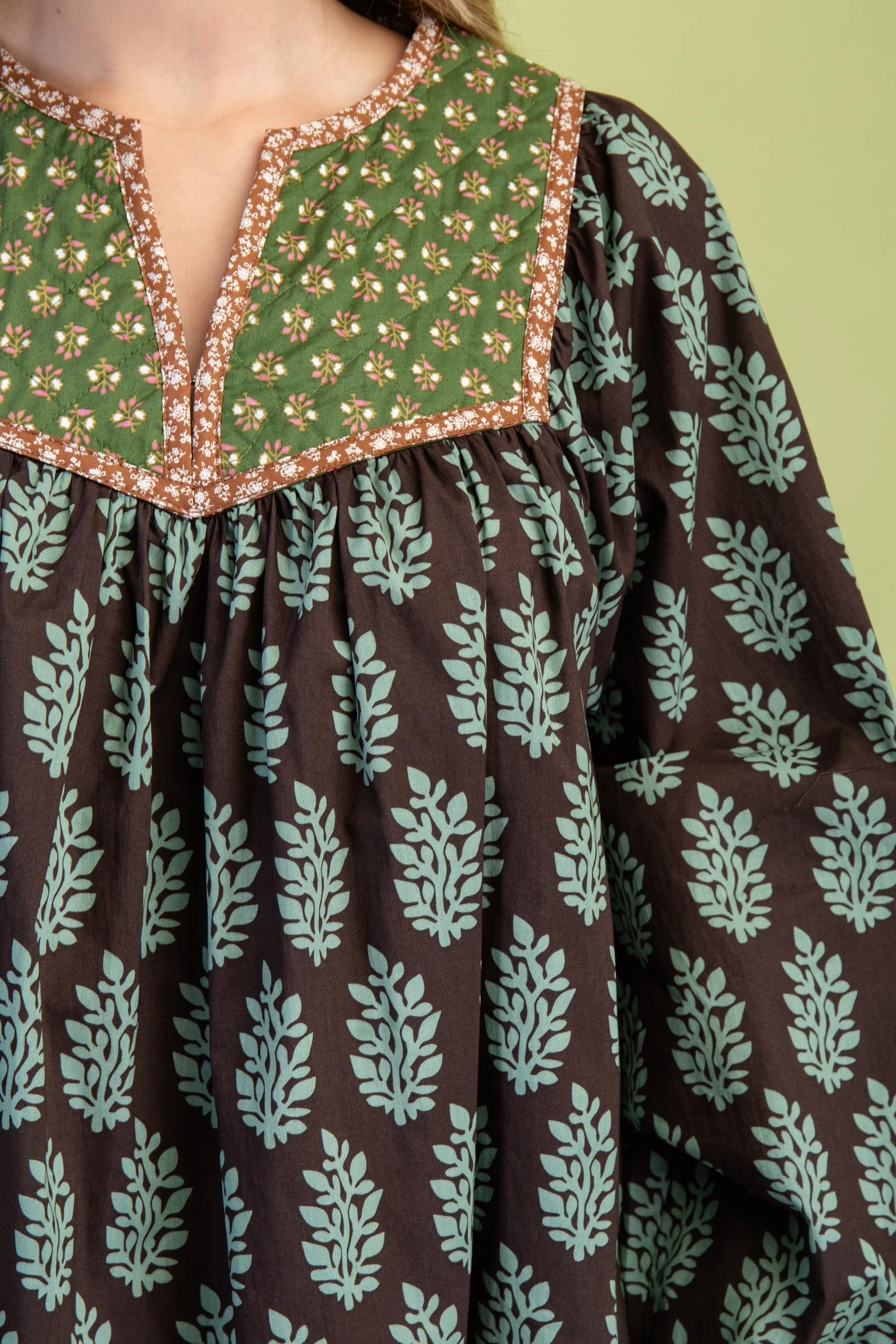 Printed Balloon Sleeve Dress with a Contrasting Floral Print Quilted Yoke. The Skirt is Lined