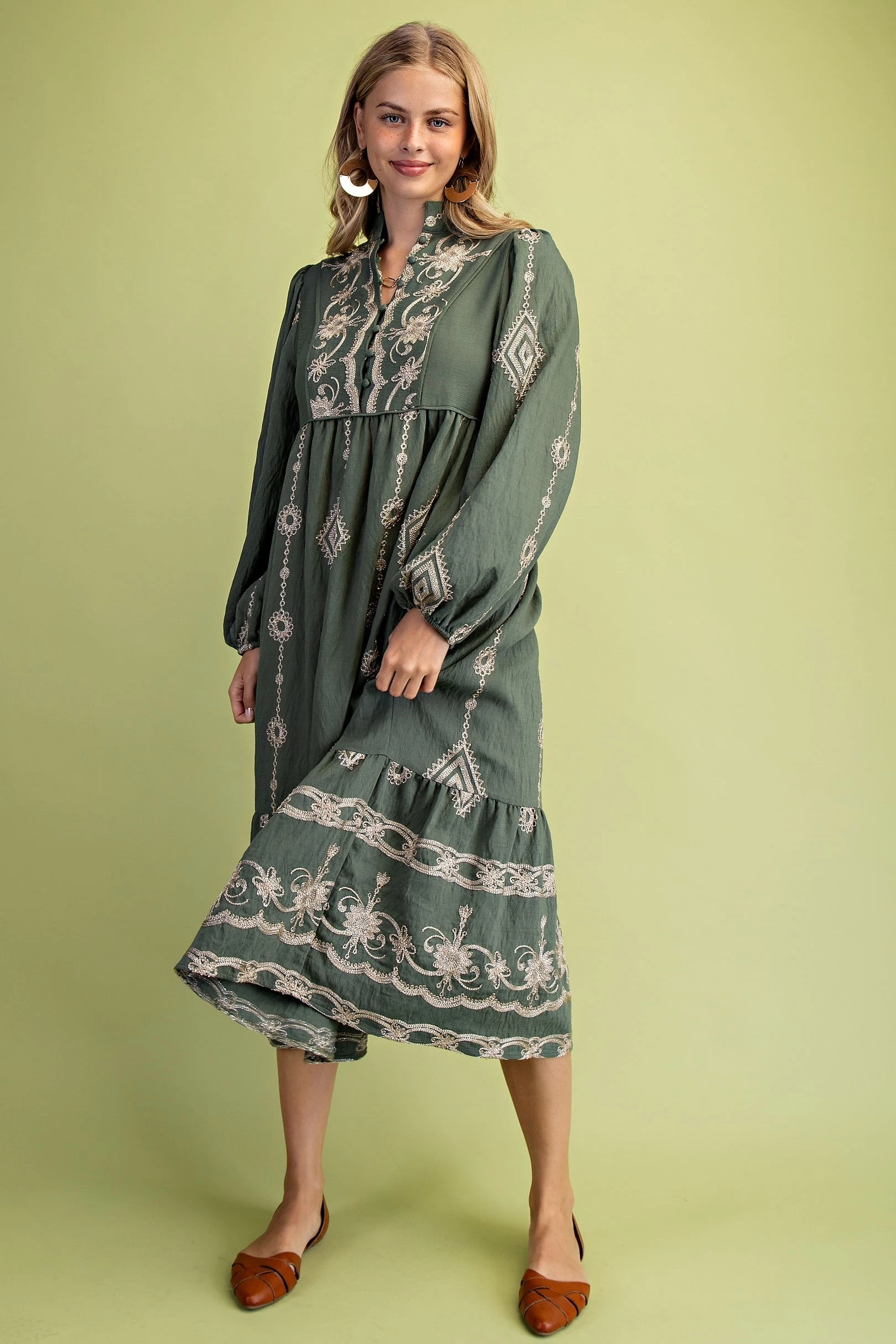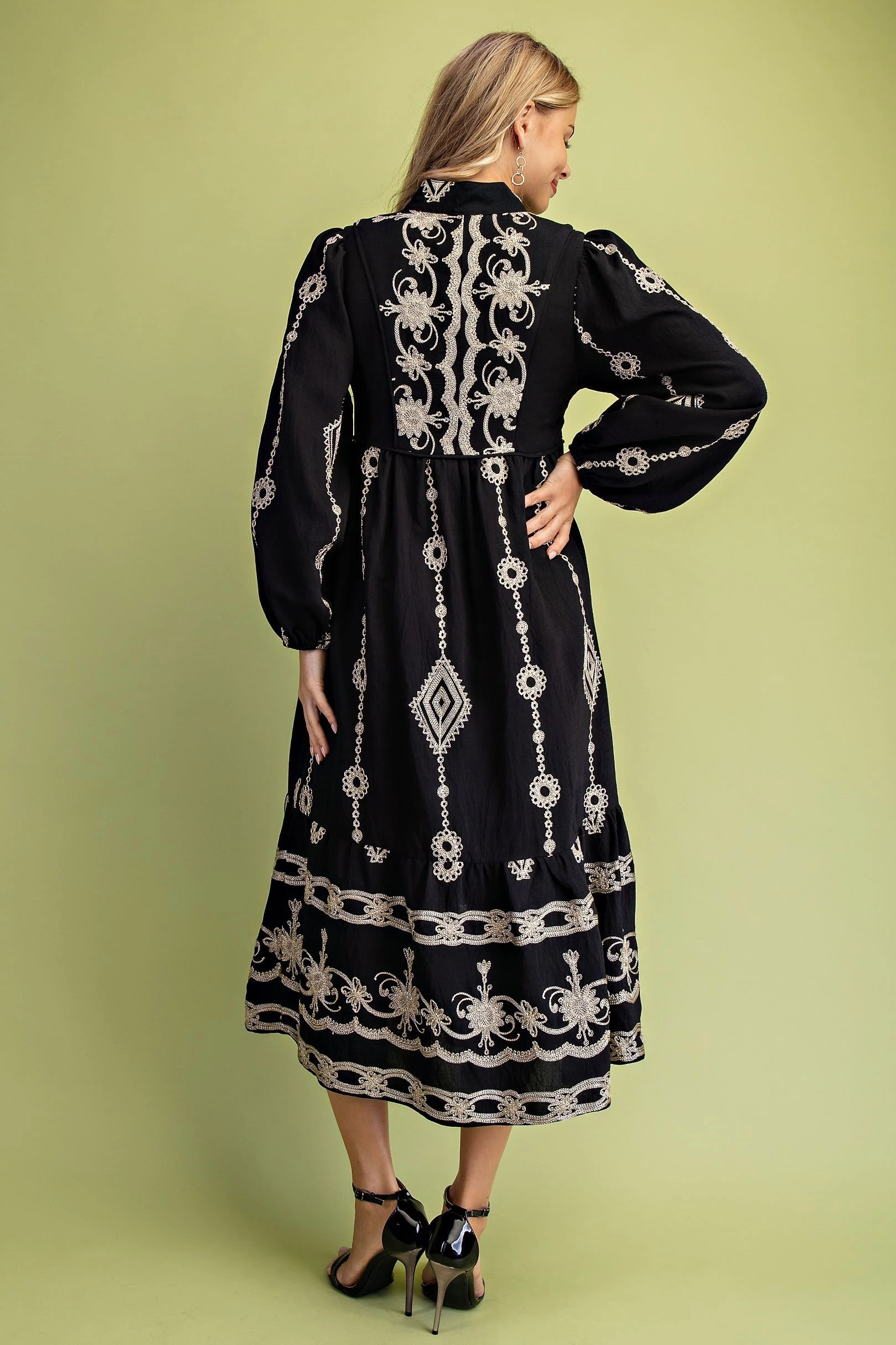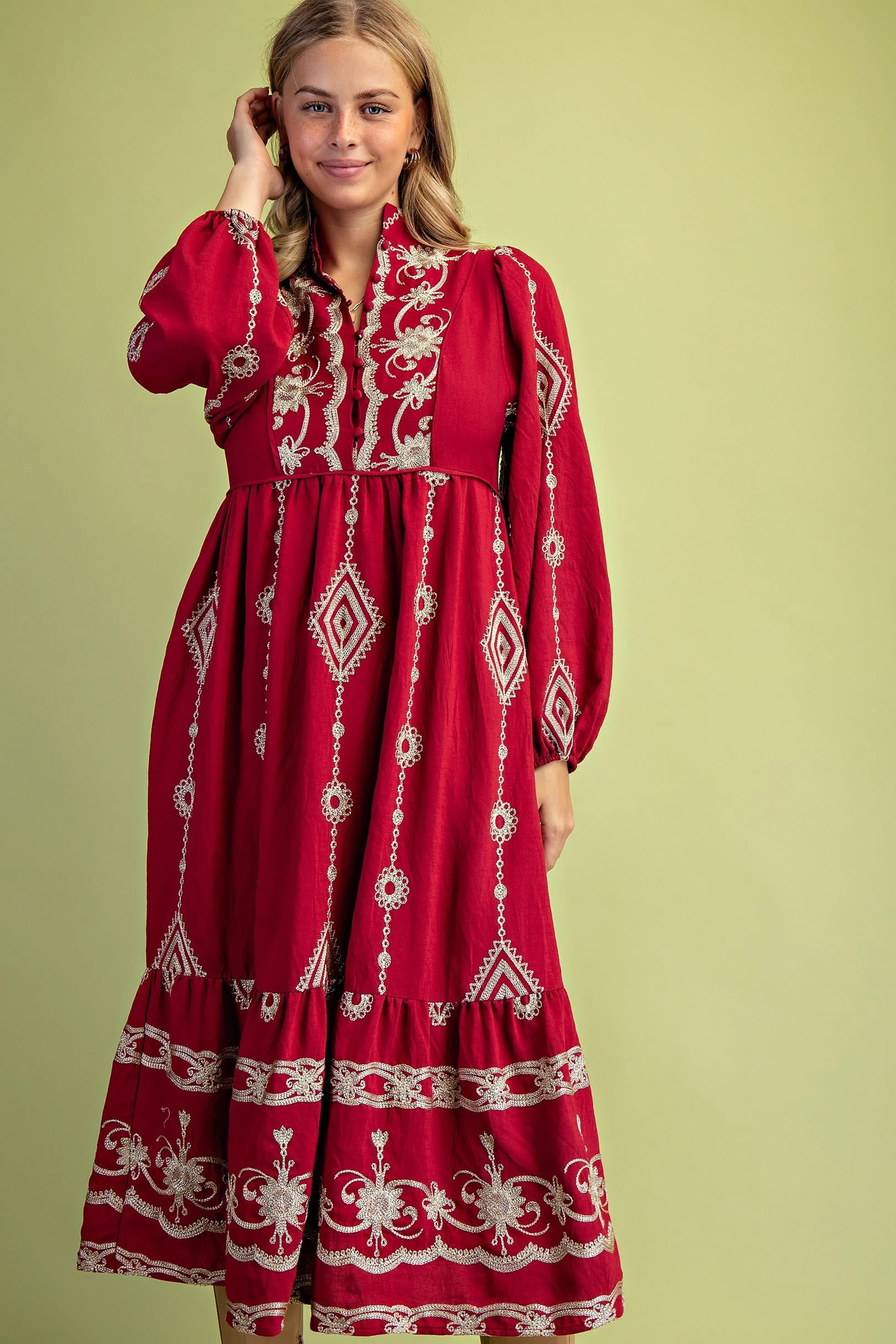Buttoned V-Neck Midi Dress with Metallic Embroidery. The Skirt is Lined