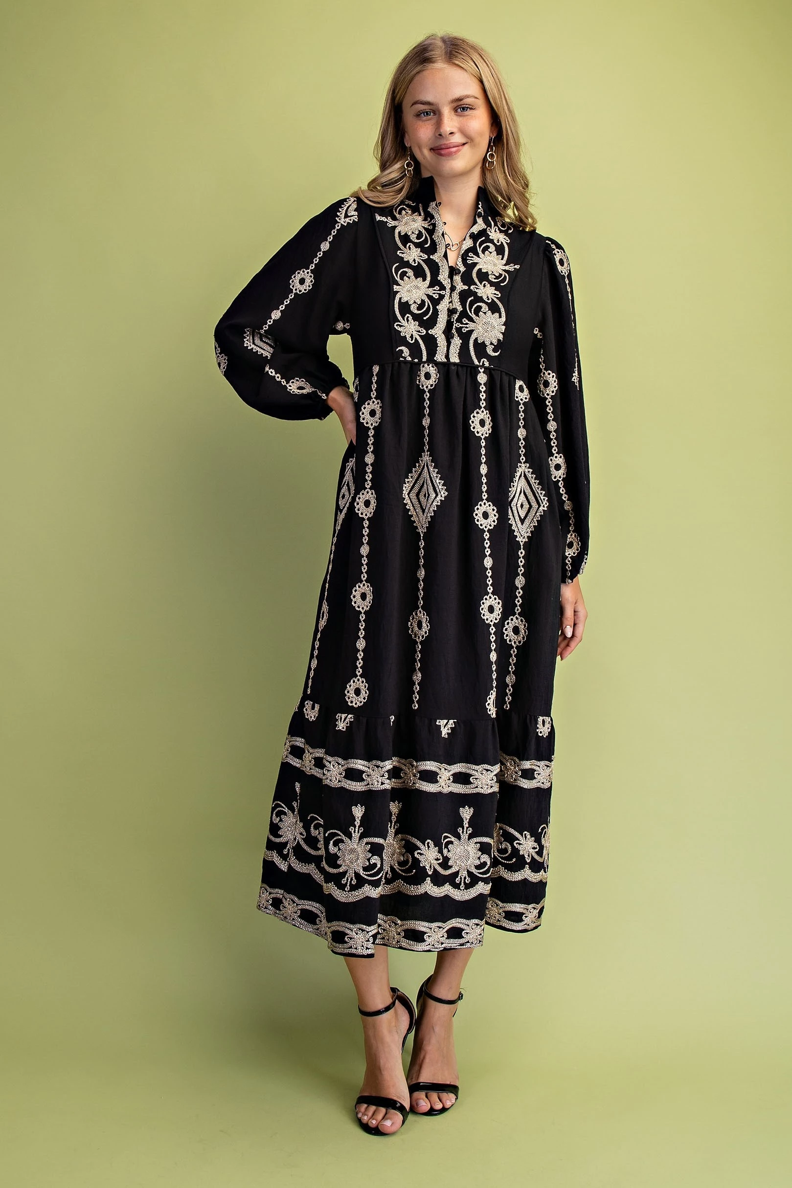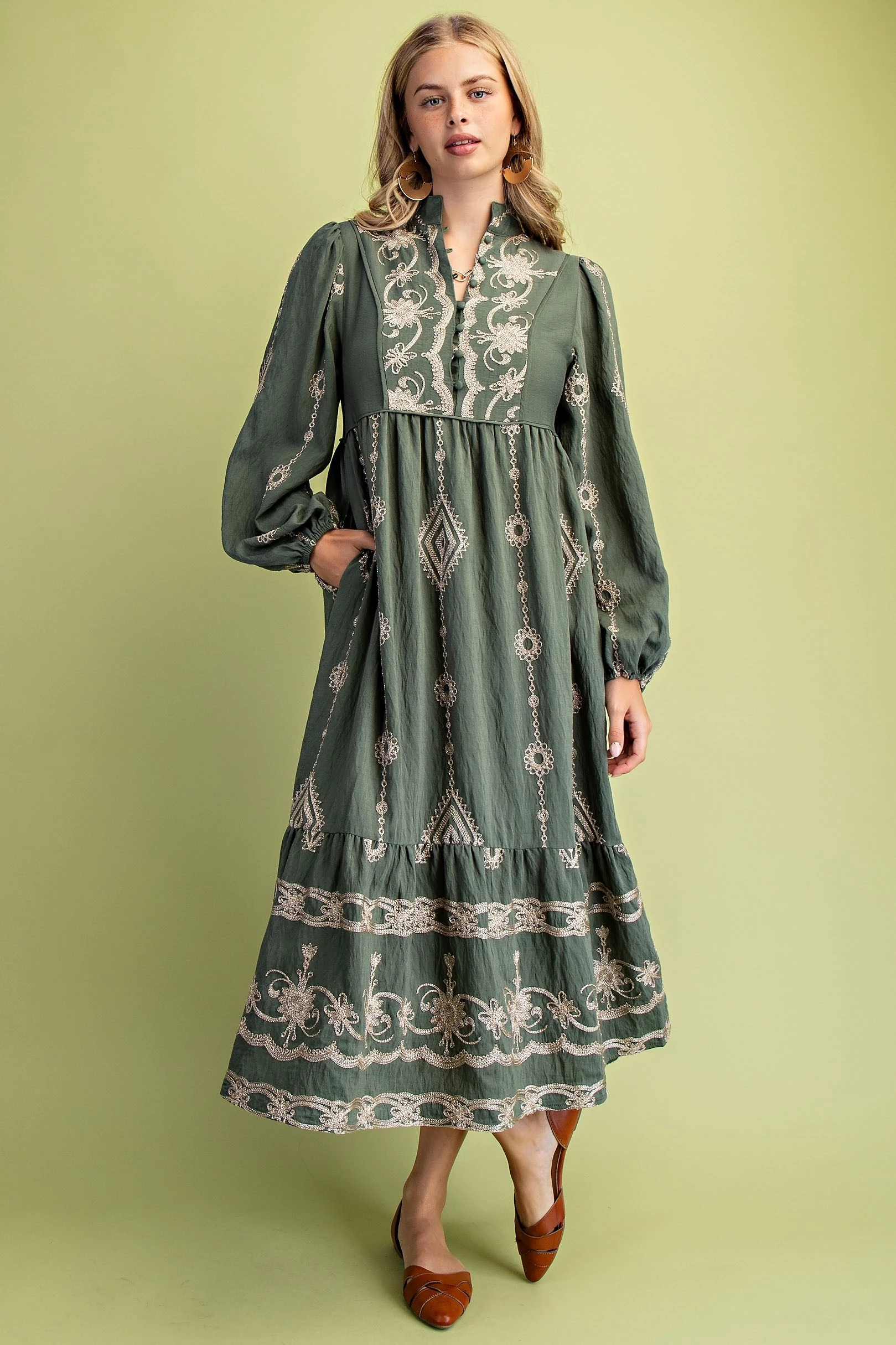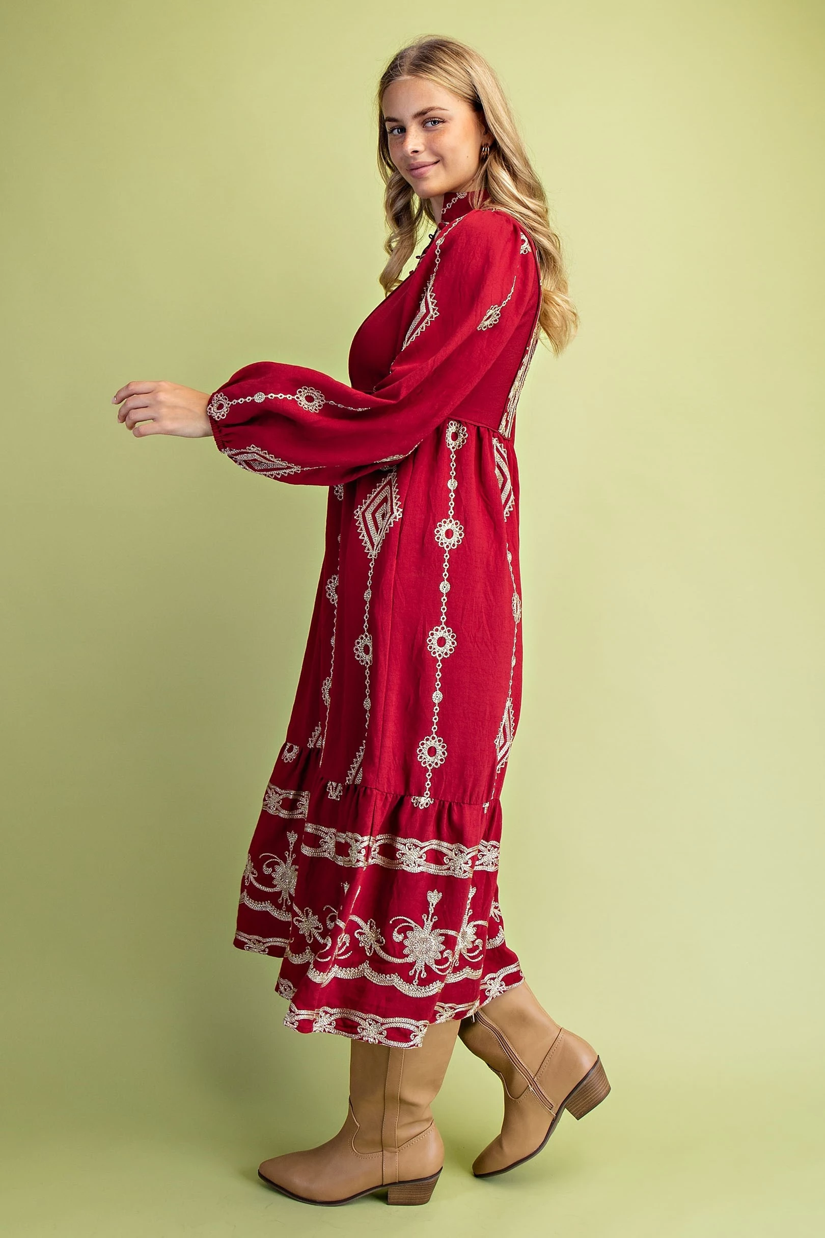 Buttoned V-Neck Midi Dress with Metallic Embroidery. The Skirt is Lined