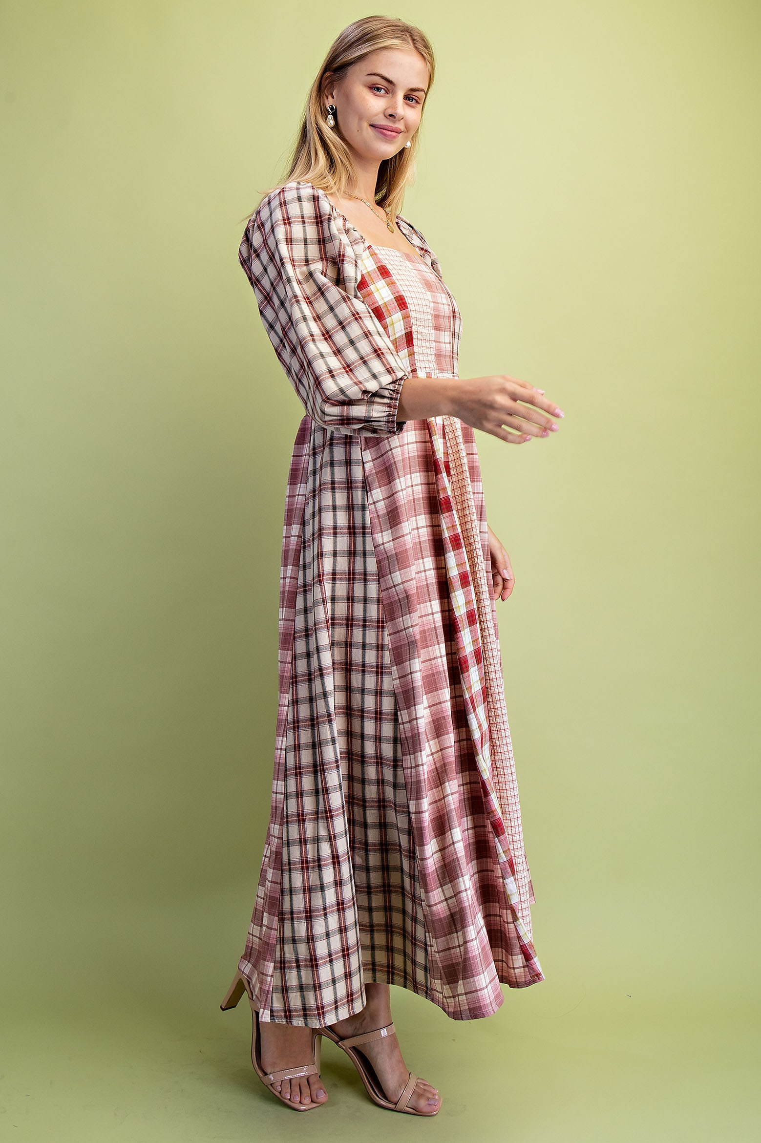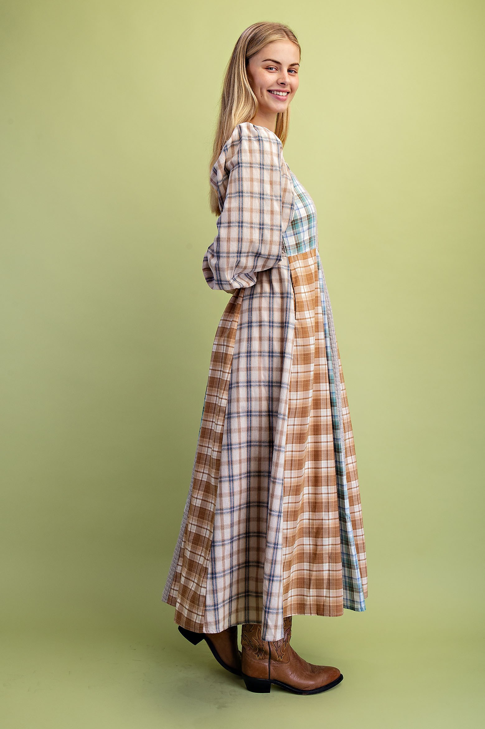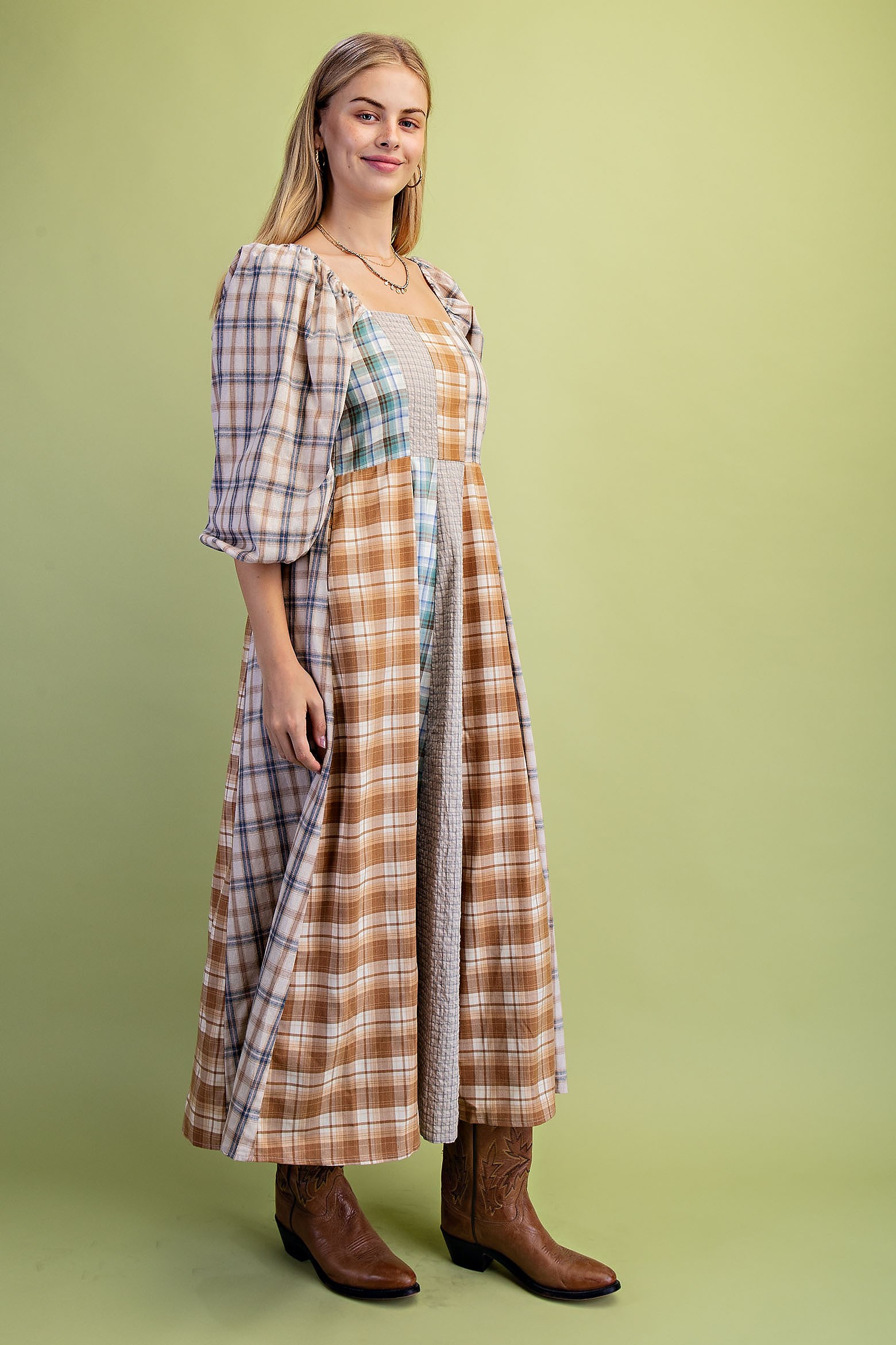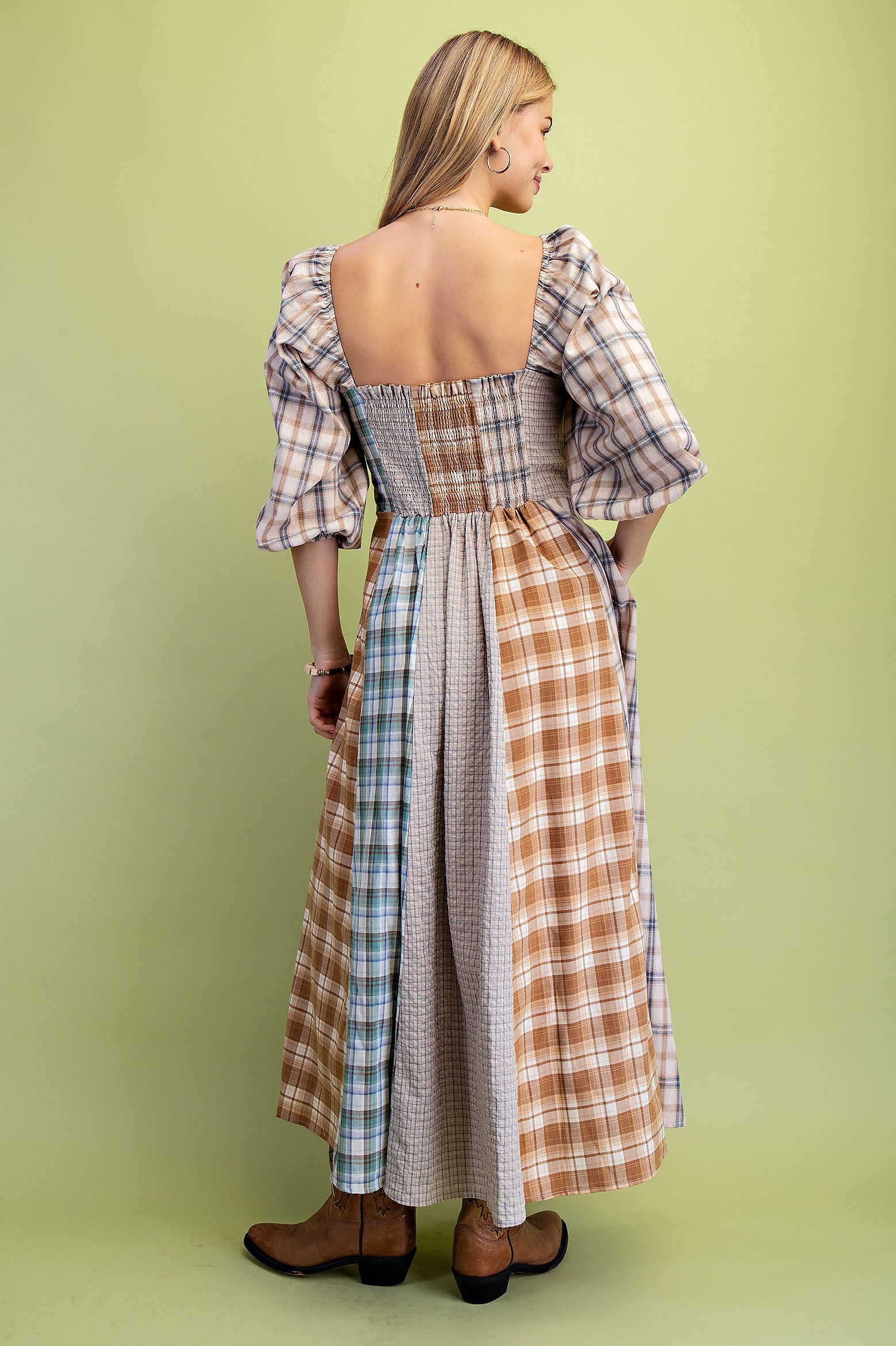 Western Mixed Plaid Midi Dress with a Smocked Back. The Dress is Lined