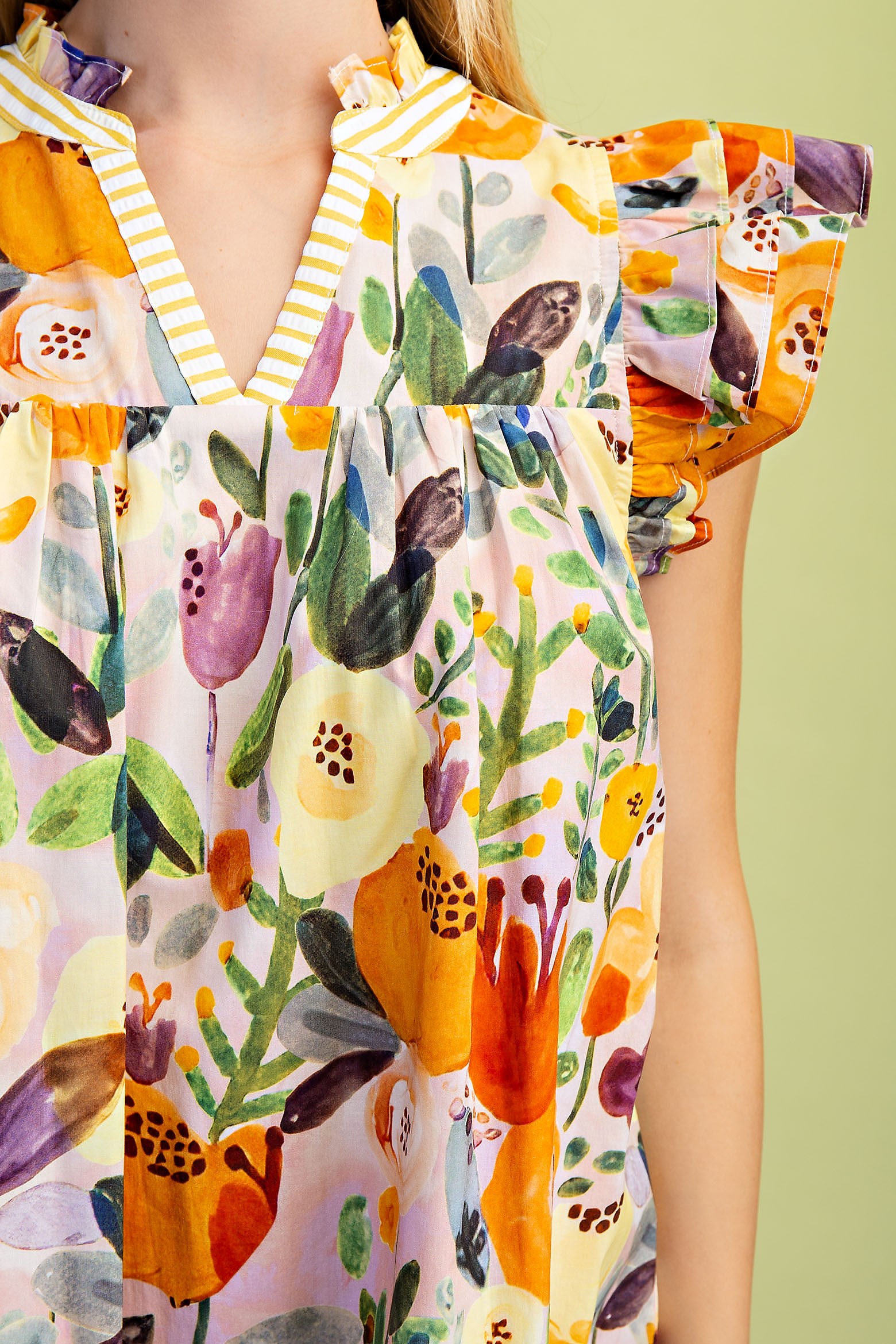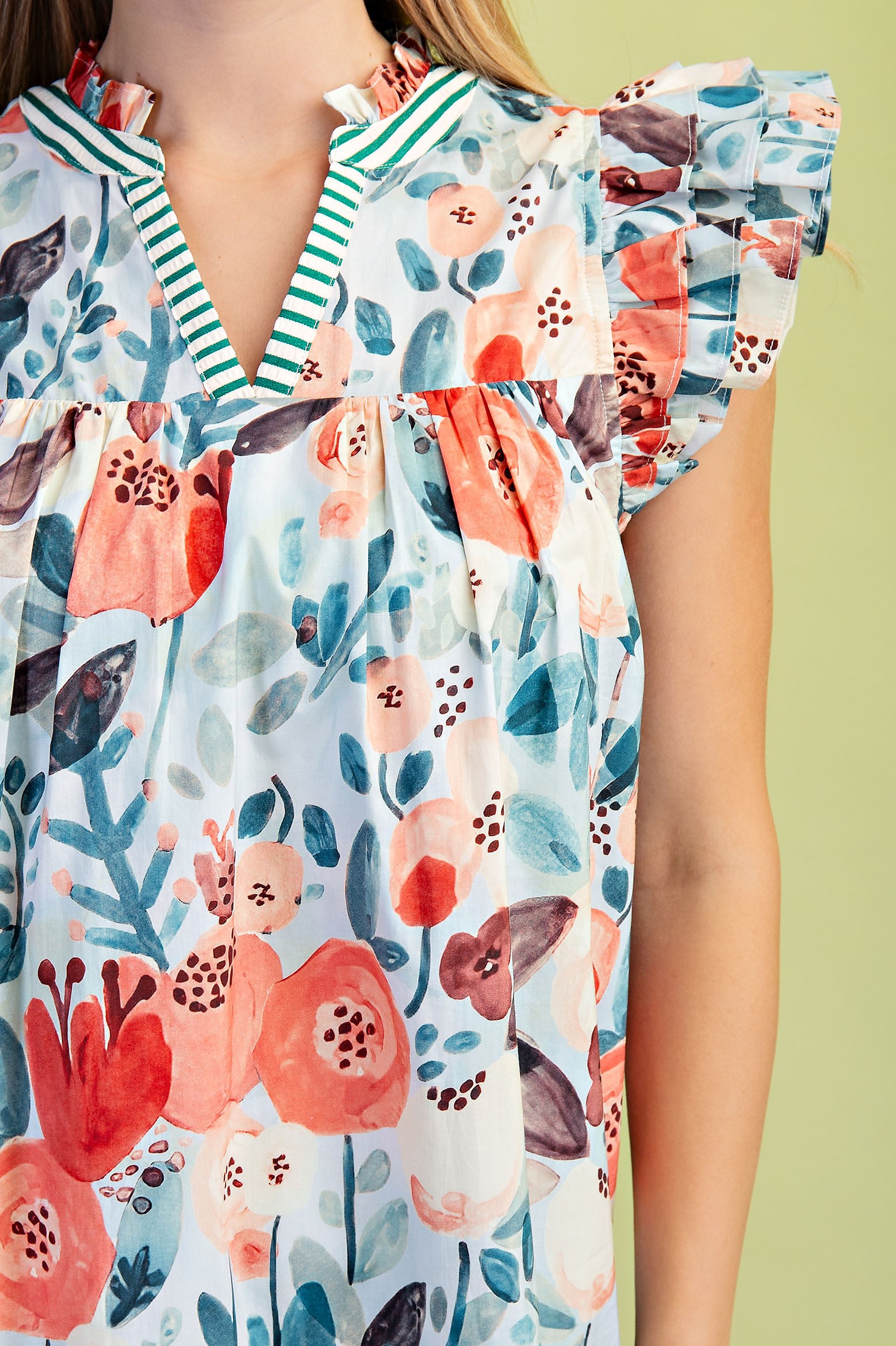 Lightweight Floral Button Up Top with Ruffled Sleeves