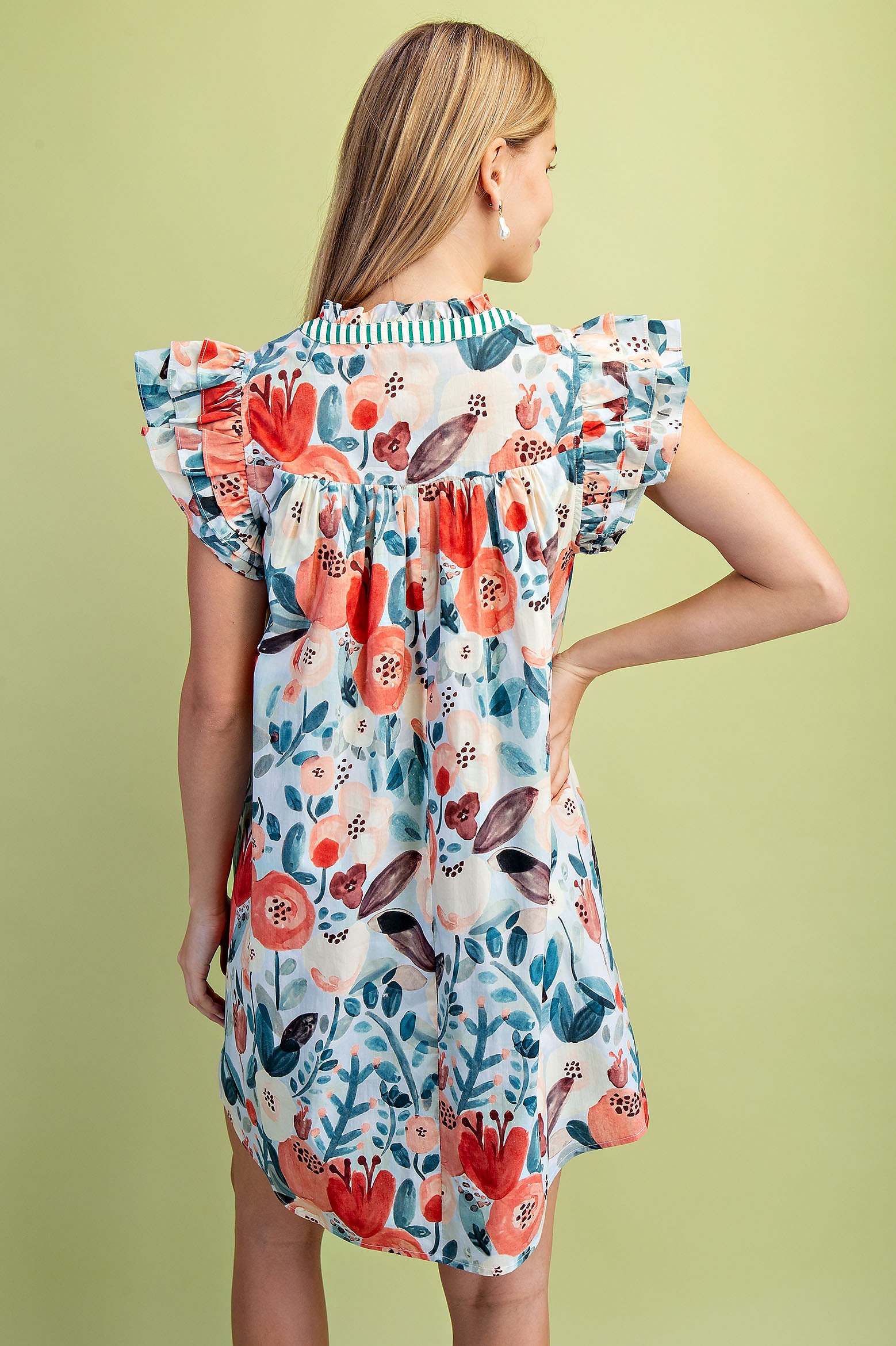 Printed V-Neck Mini Dress with a Ruffled Neck and Short Puff Sleeves. The Dress is Lined