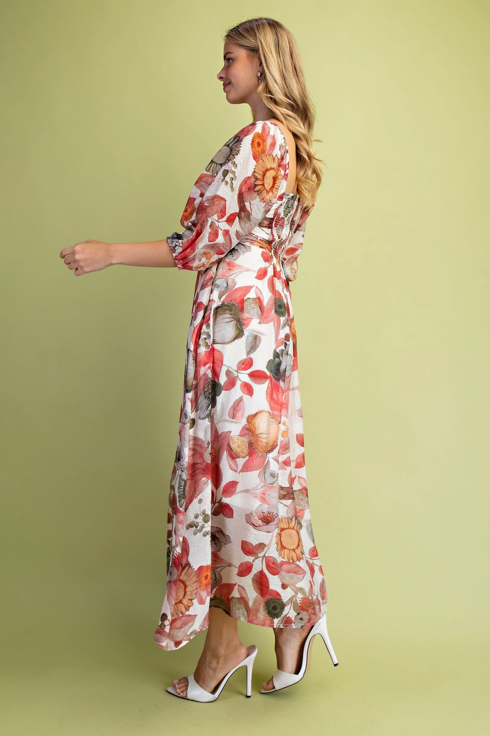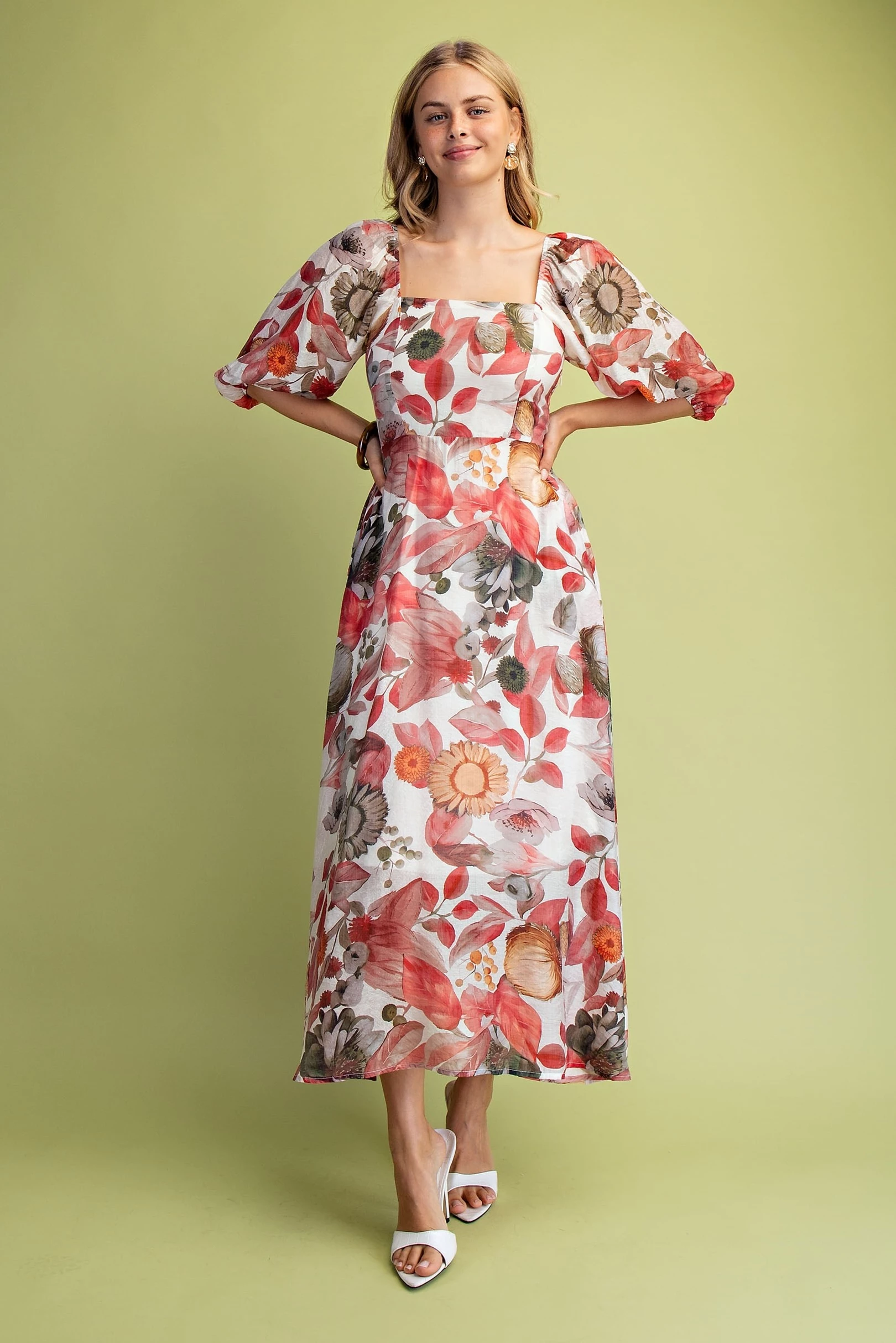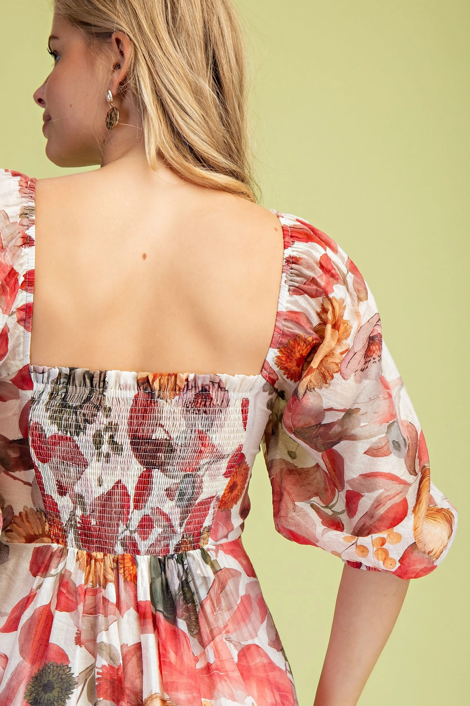 Floral Print Midi Dress with a Smocked Back and Elastic Banded Arm. The Dress is Lined