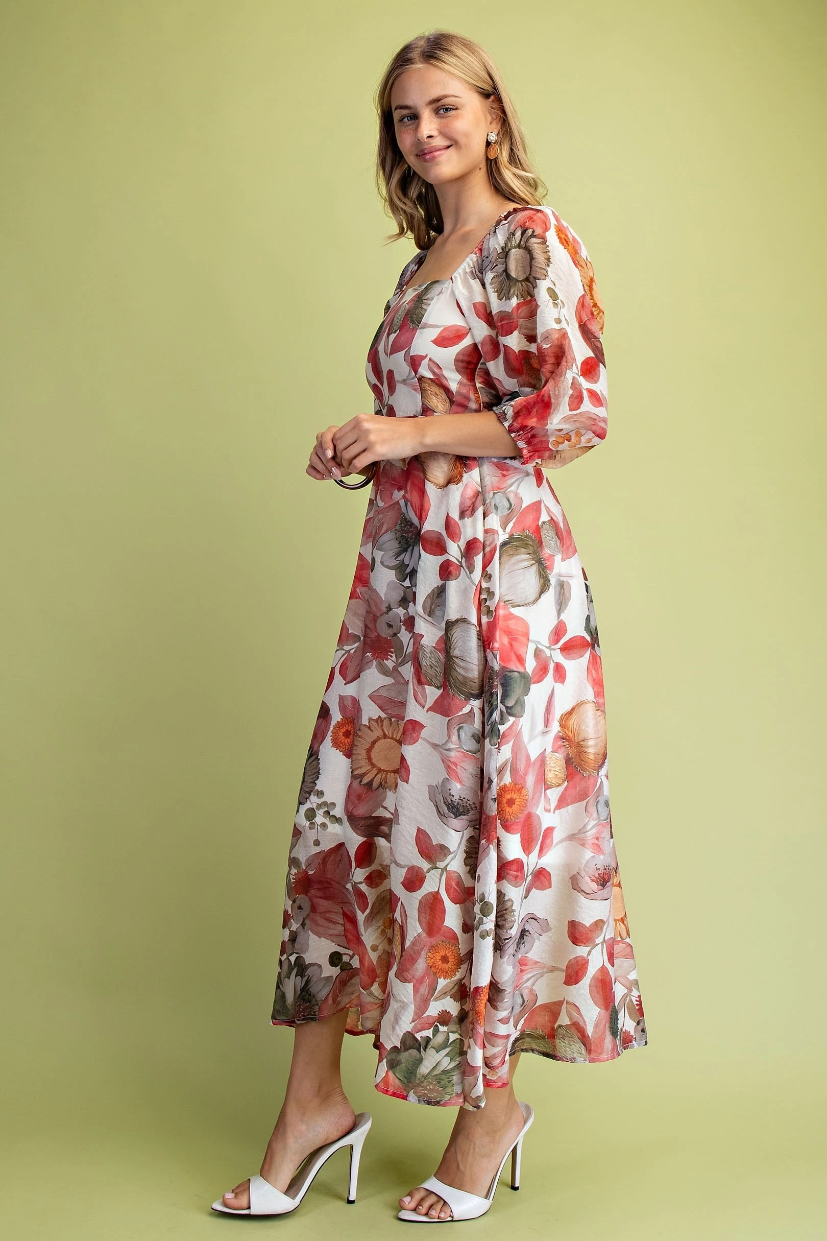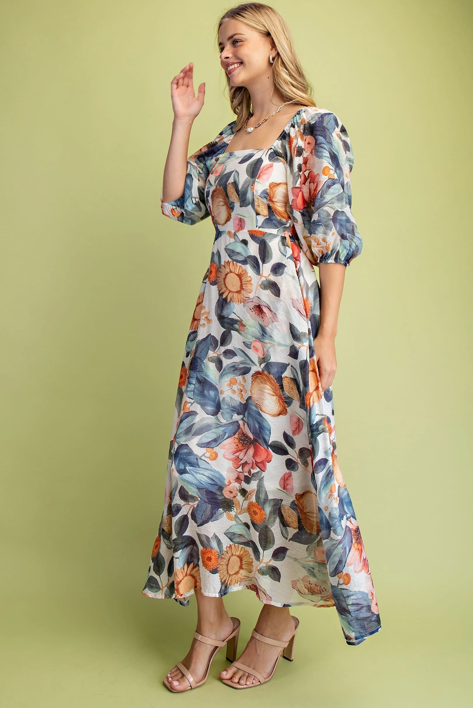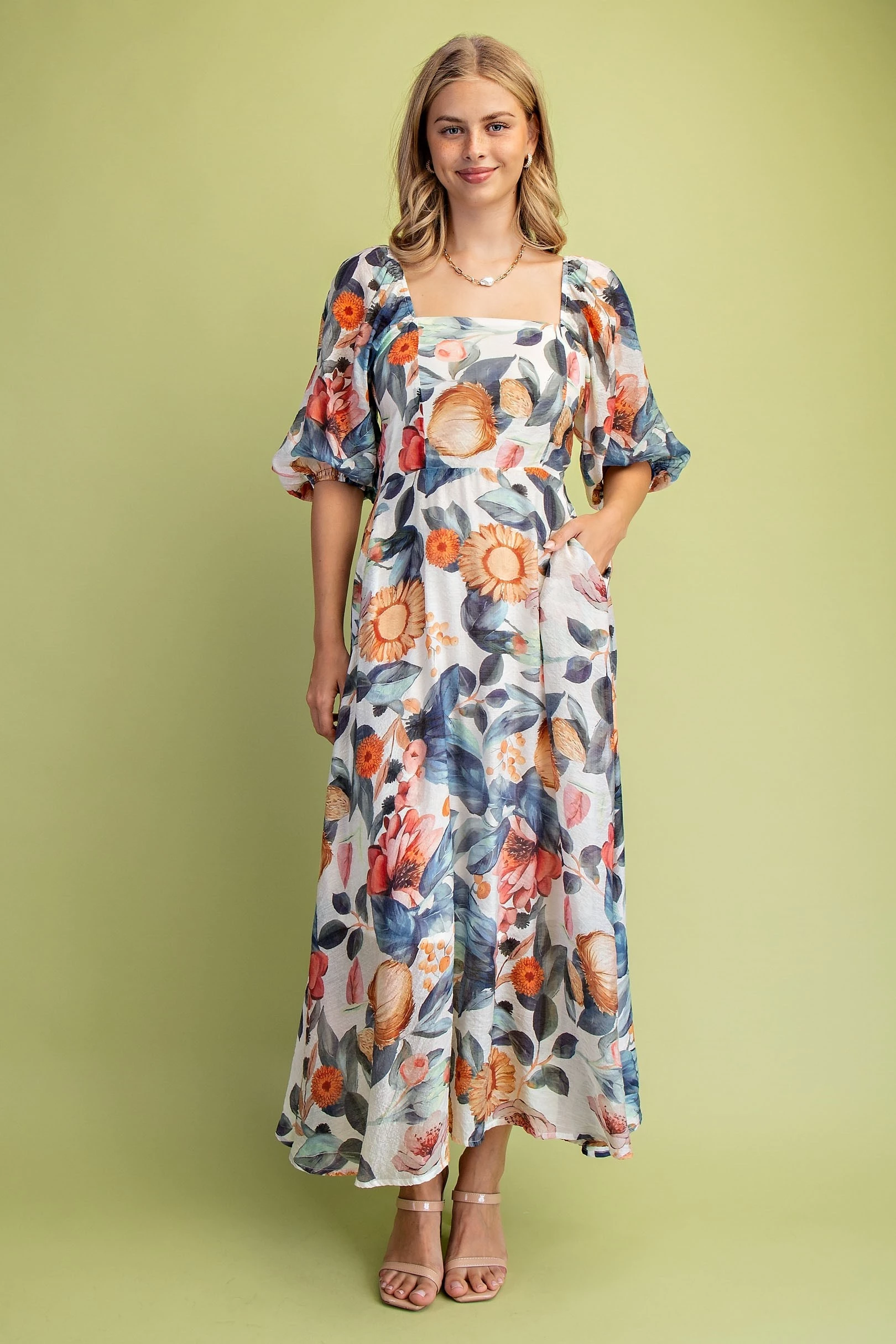 Floral Print Midi Dress with a Smocked Back and Elastic Banded Arm. The Dress is Lined