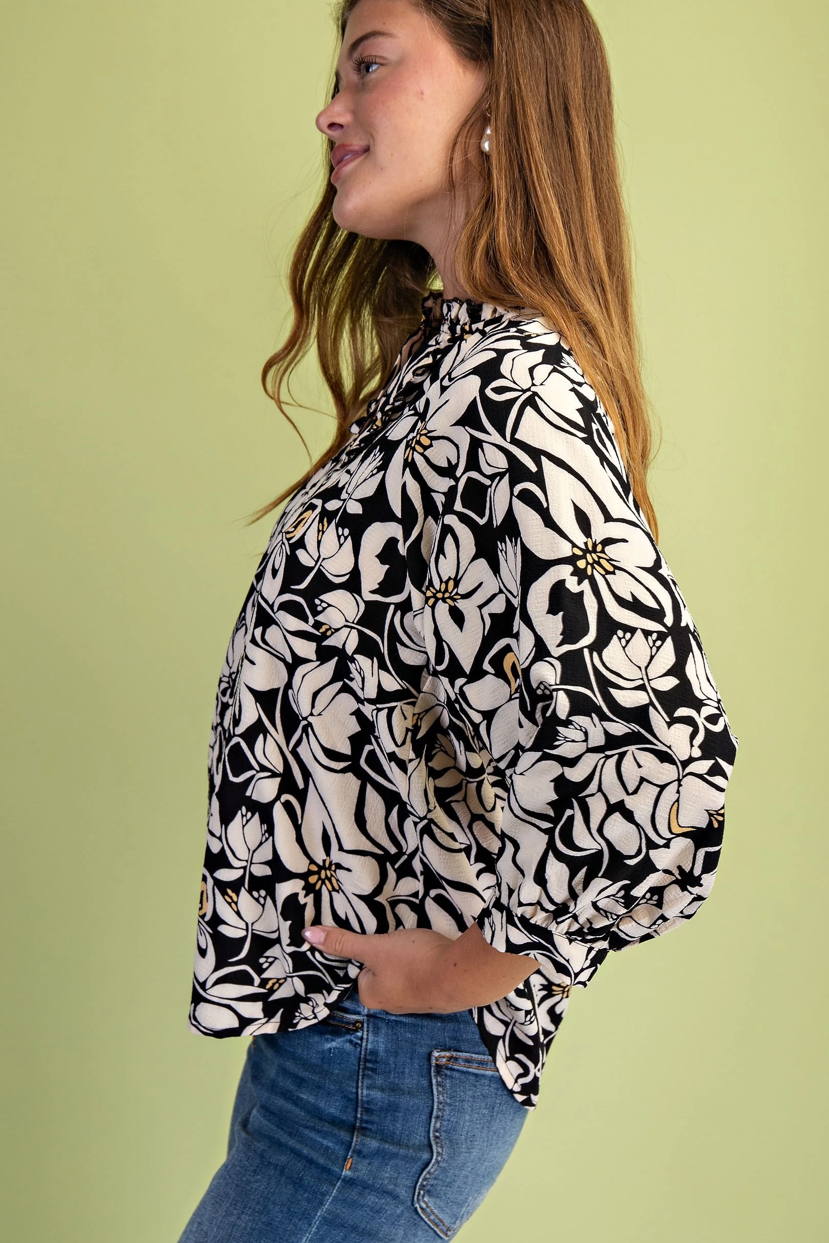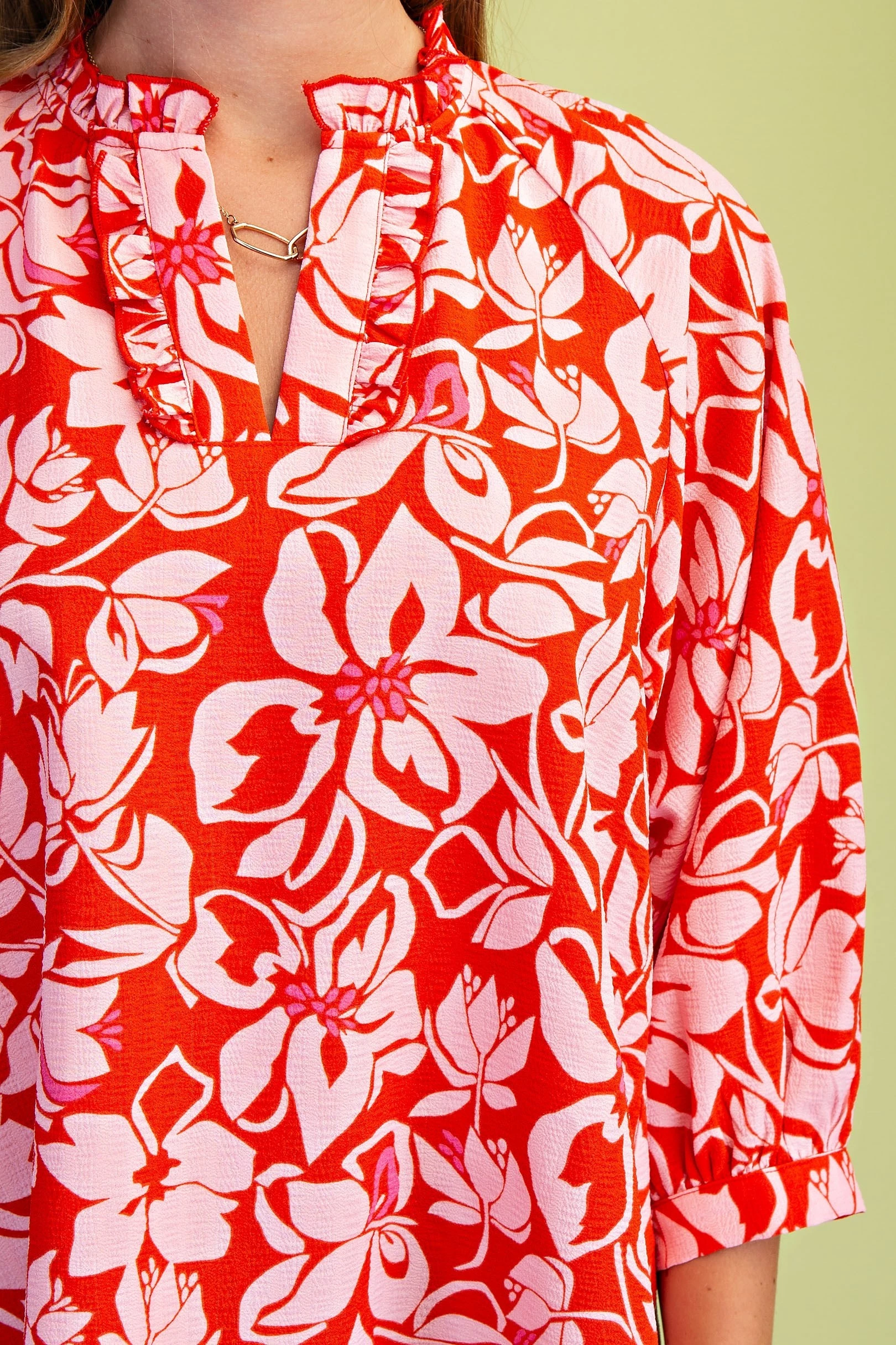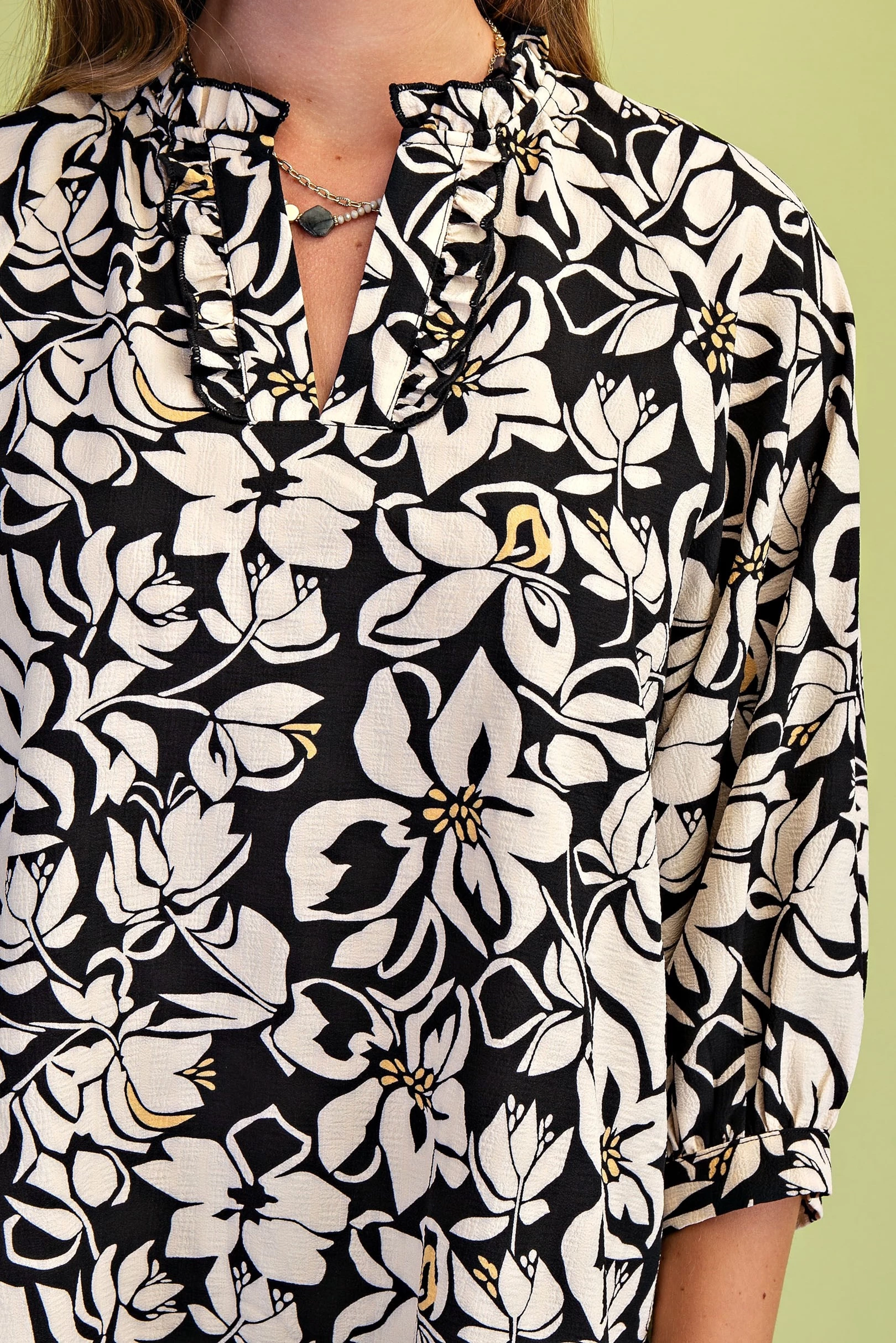 Floral Print Textured Top with 3/4 Length Sleeves and a Ruffled Neck