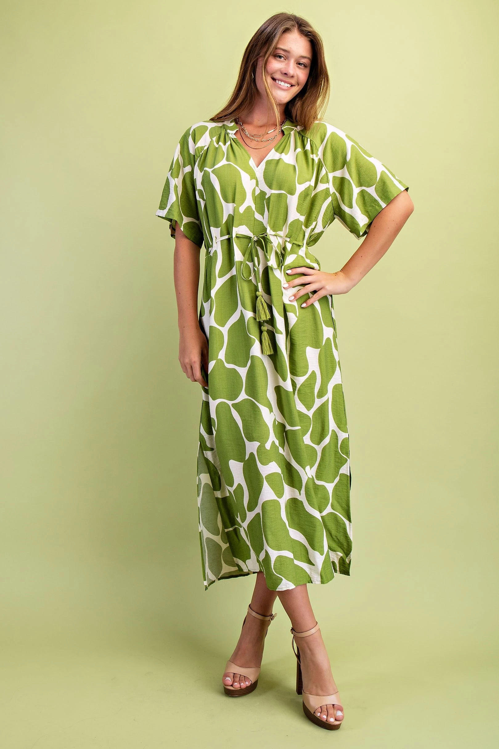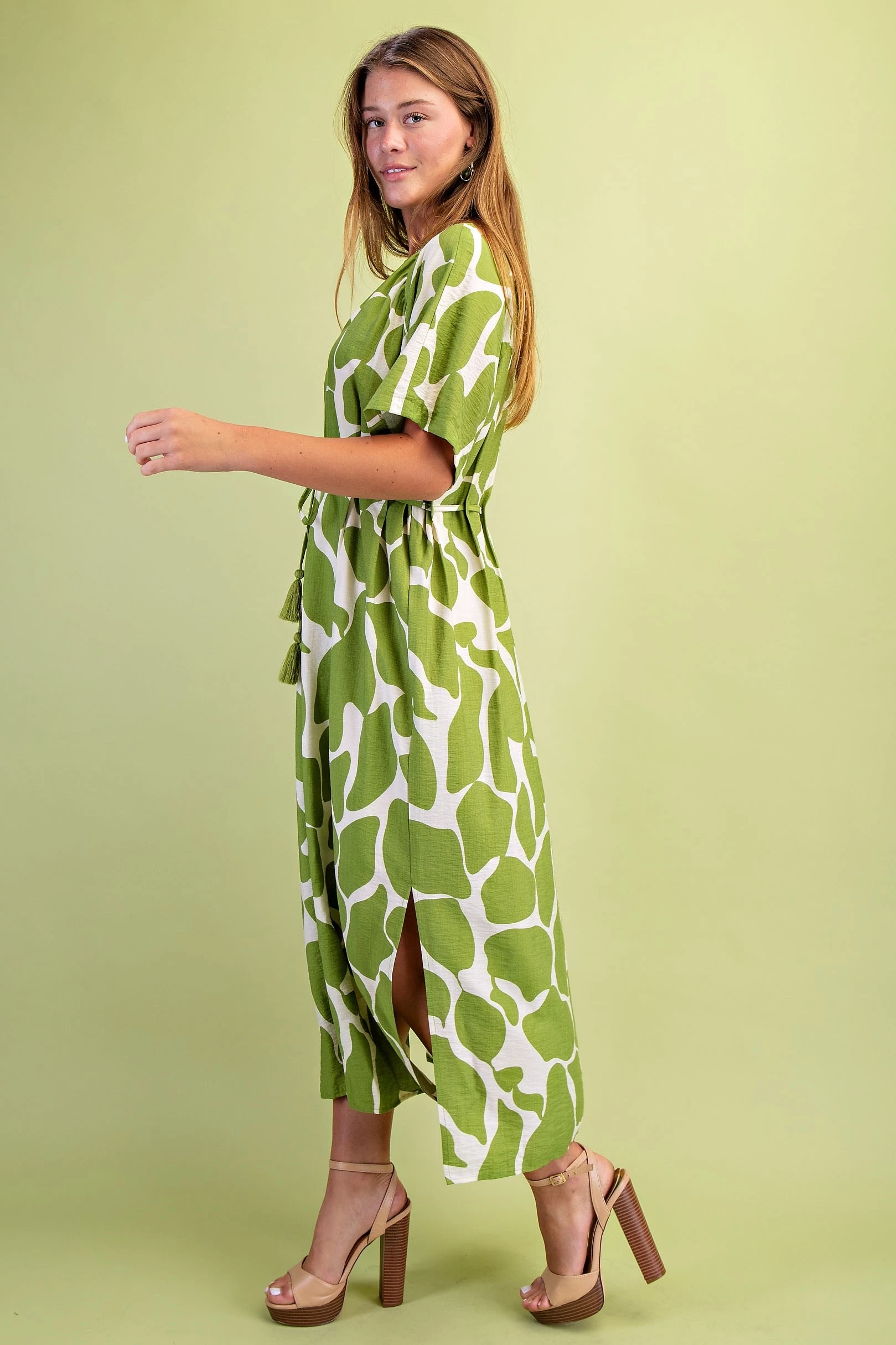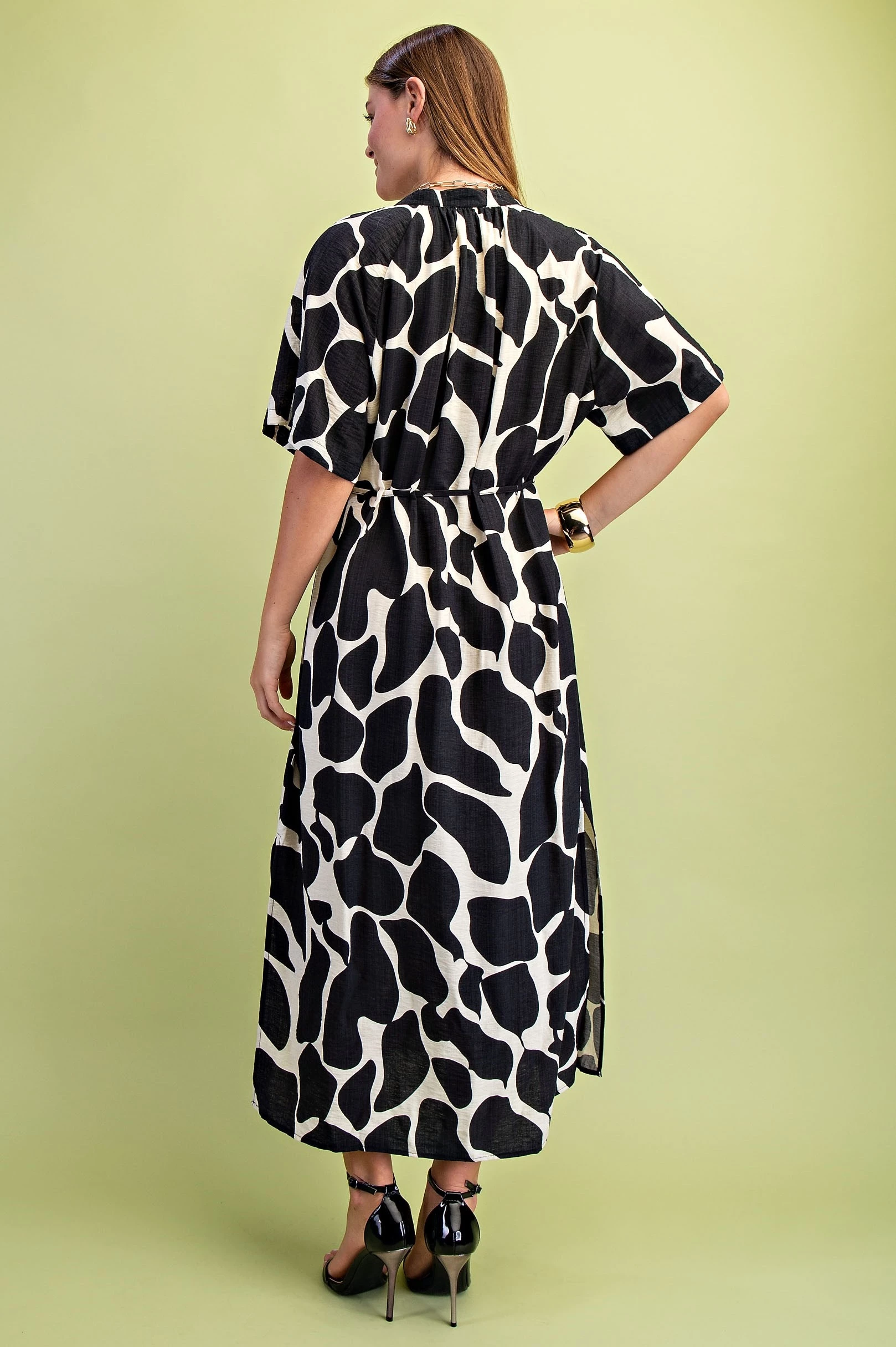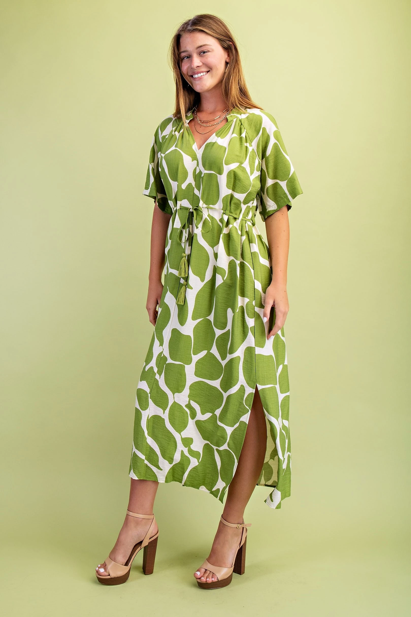 Giraffe Print Midi Dress with a Tassel Belt. The Dress is Lined