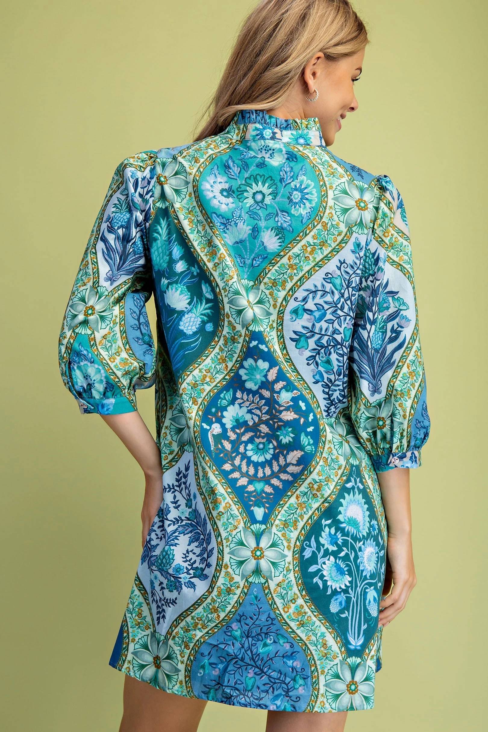 Printed Mini Shirt Dress with a Pleated Waist. The Dress is Lined