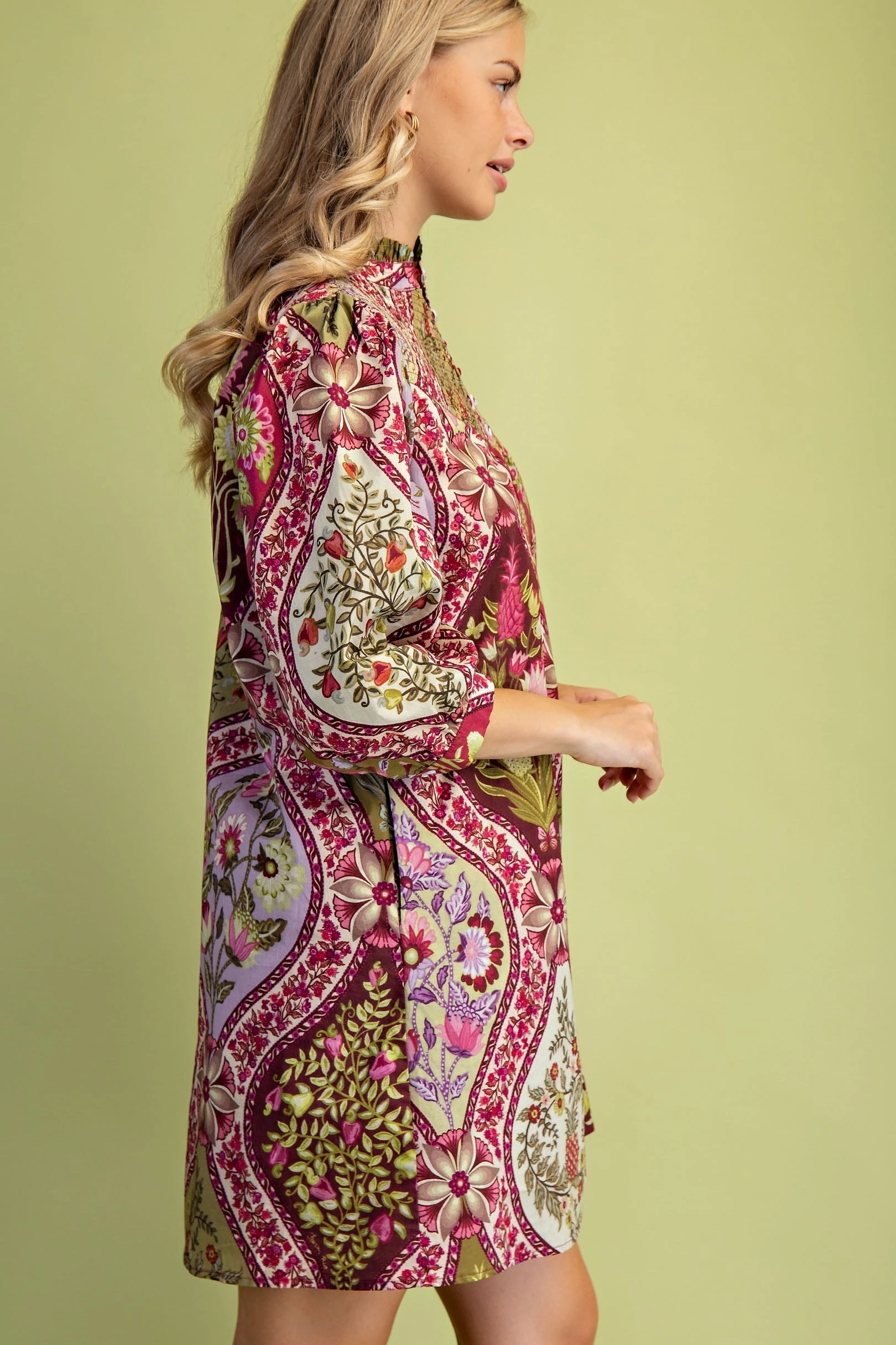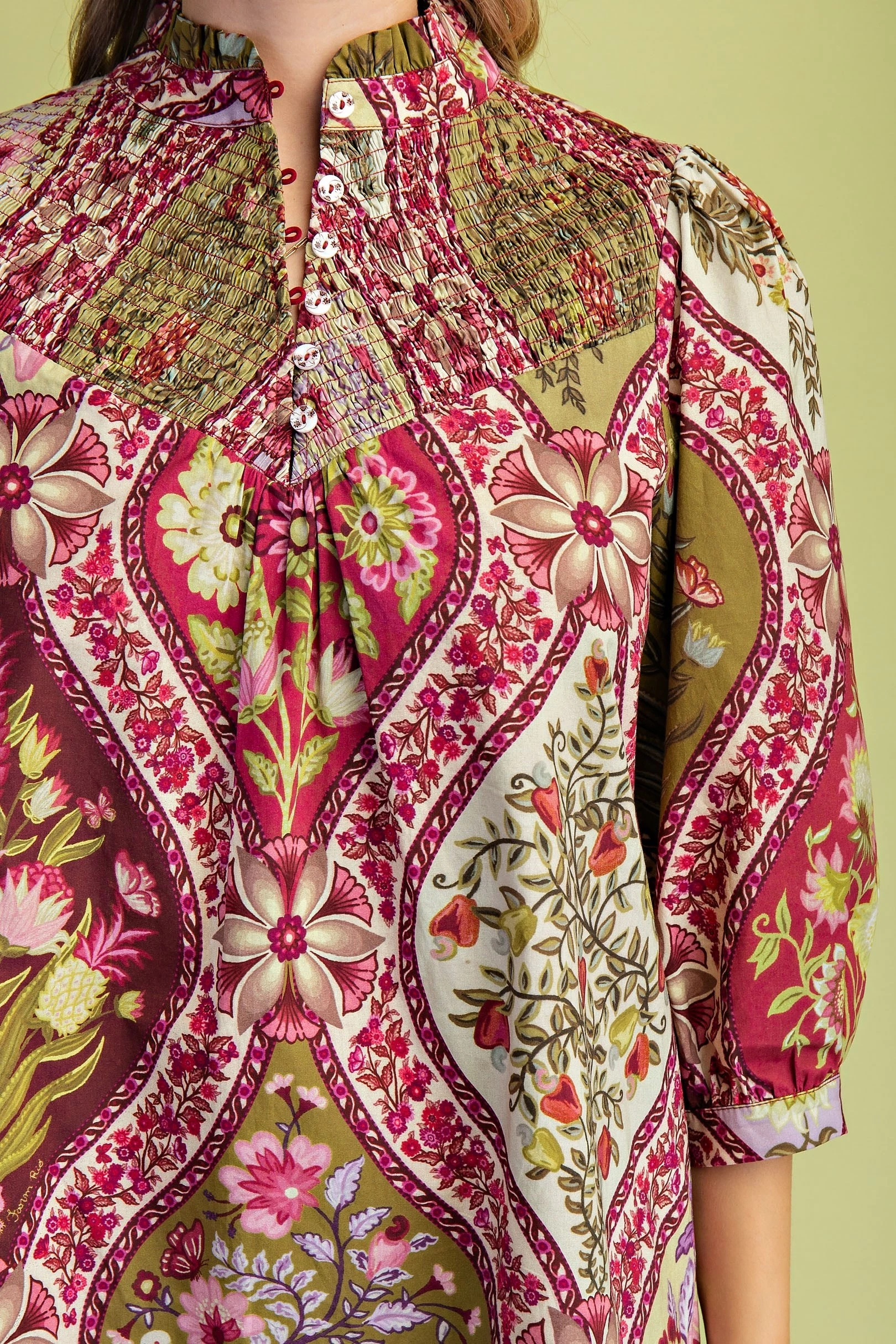 Floral Print Button Down Top with 3/4 Length Gathered Balloon Sleeves