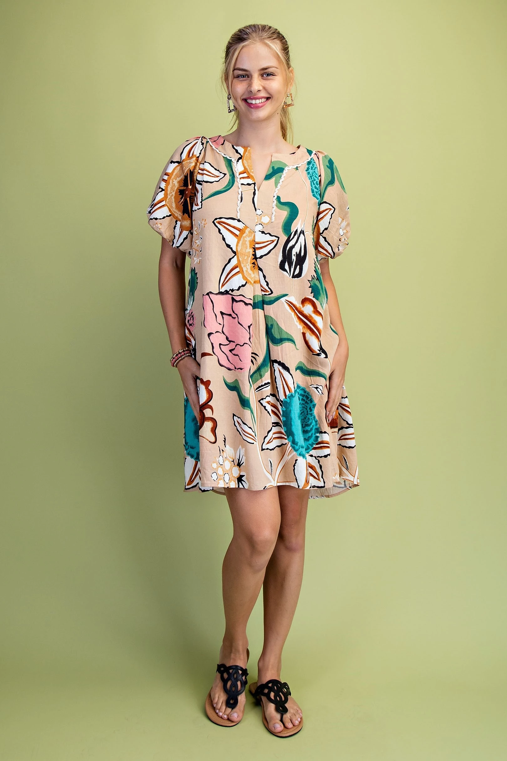 Linen V-Neck Mini Dress with Contrasting and Embroidered Appliqué Design Details. The Dress is Lined