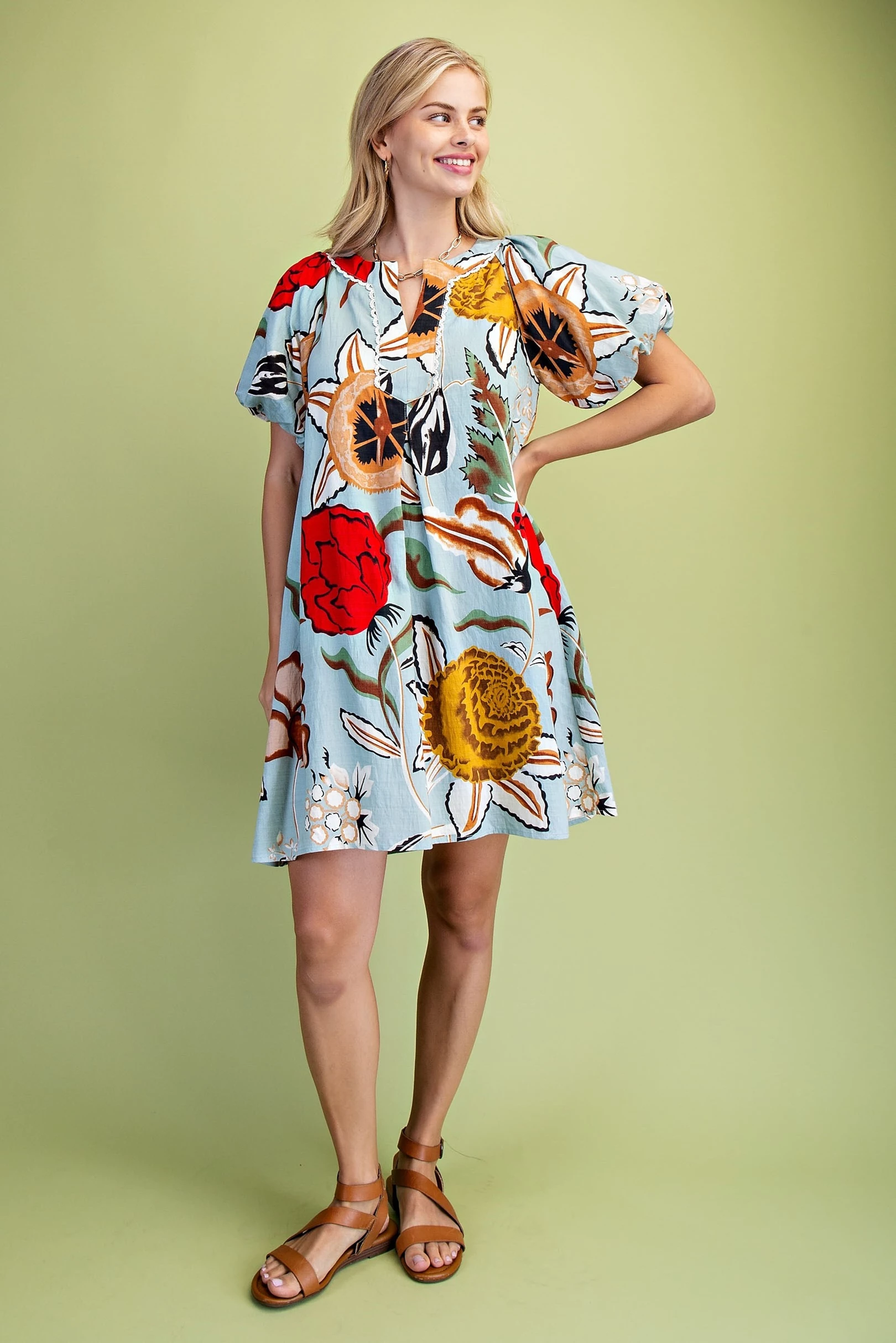 Floral Print Ruffled Neck Mini Dress with Contrasting Stripe Accents and Layered Ruffle Sleeves. The Skirt is Lined
