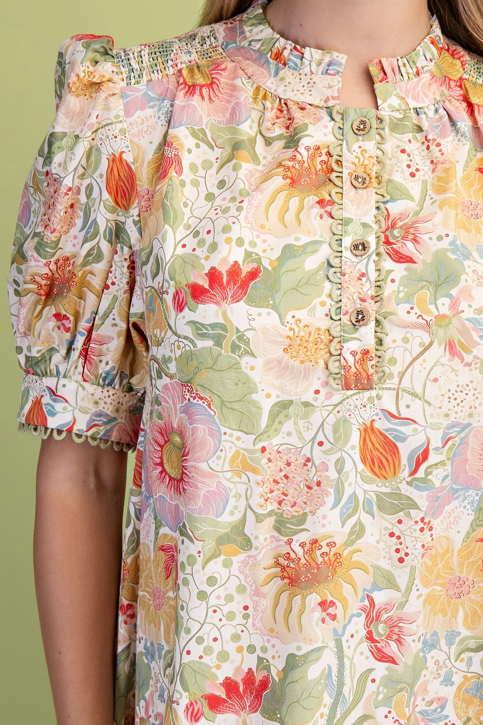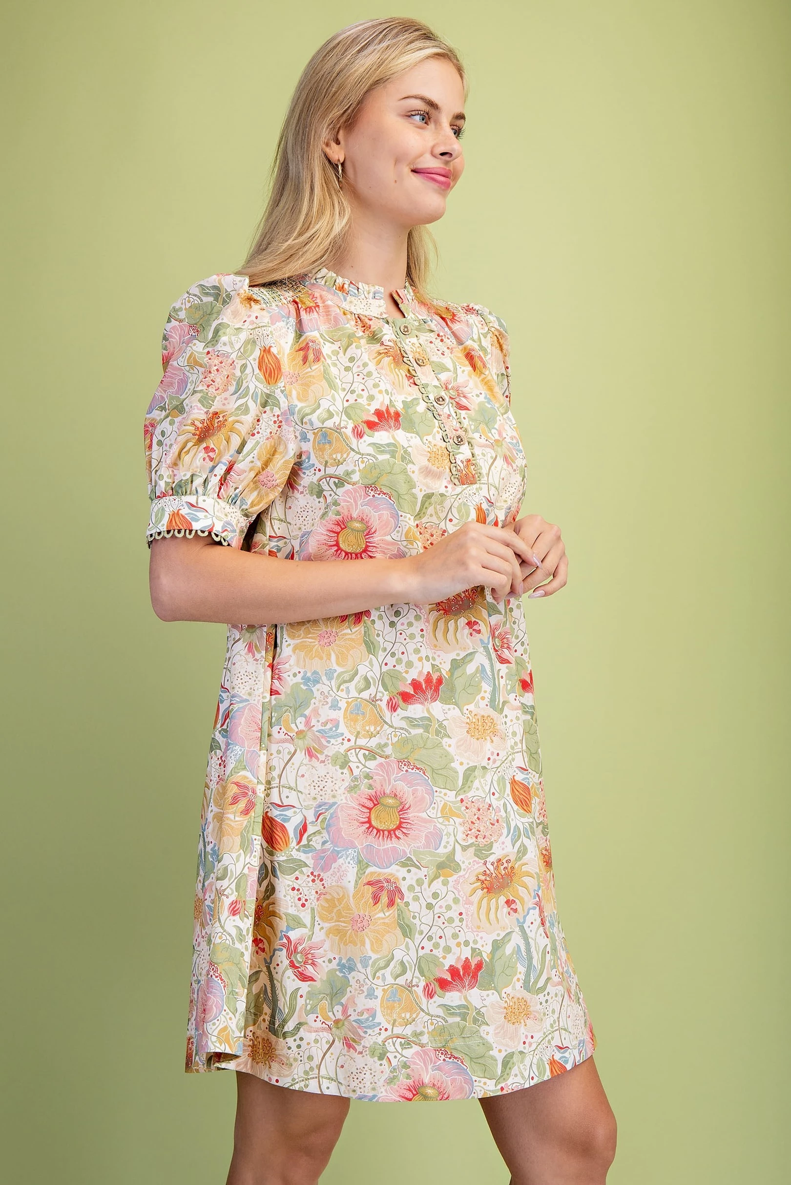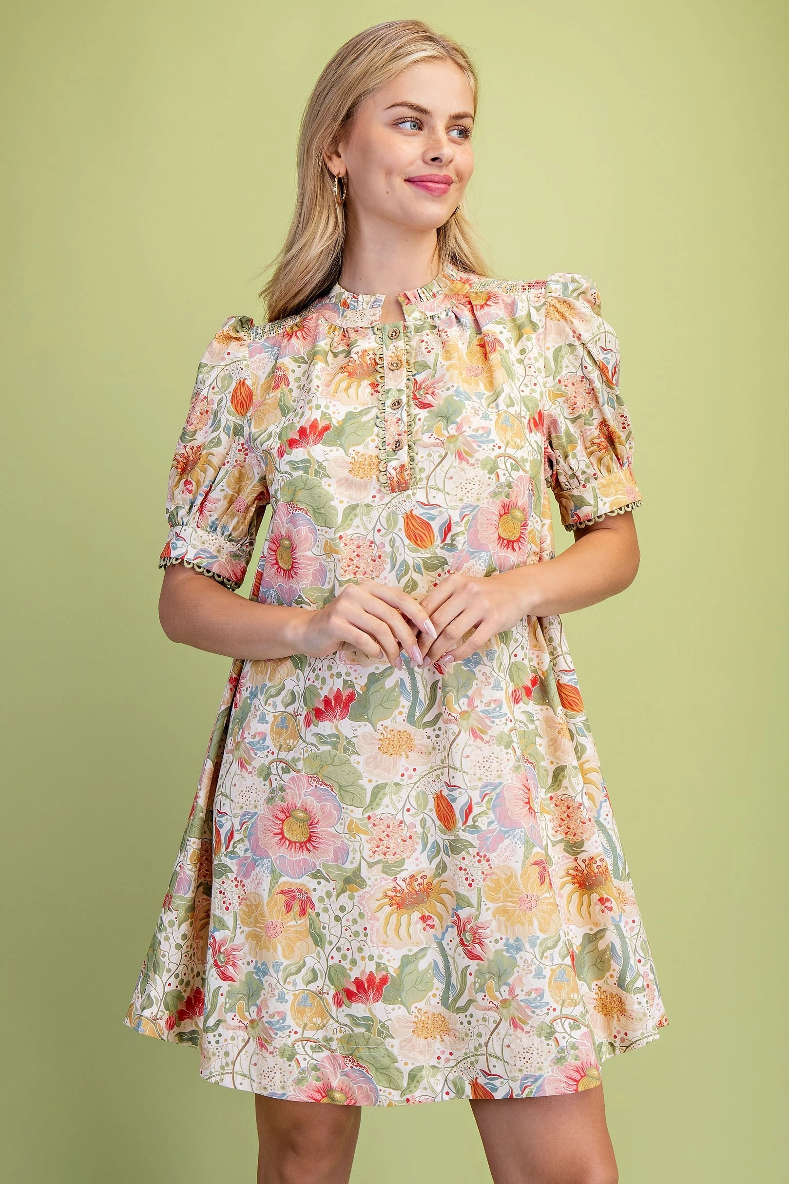 Muted Botanic Print Puff Sleeve Dress with Trim and Smocking Details. The Dress is Lined
