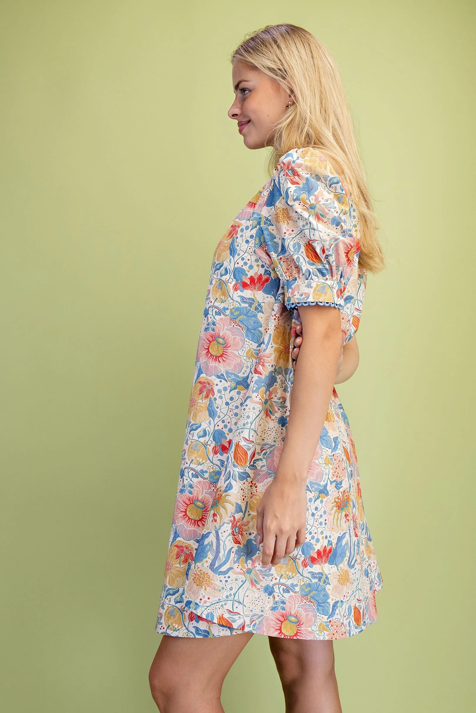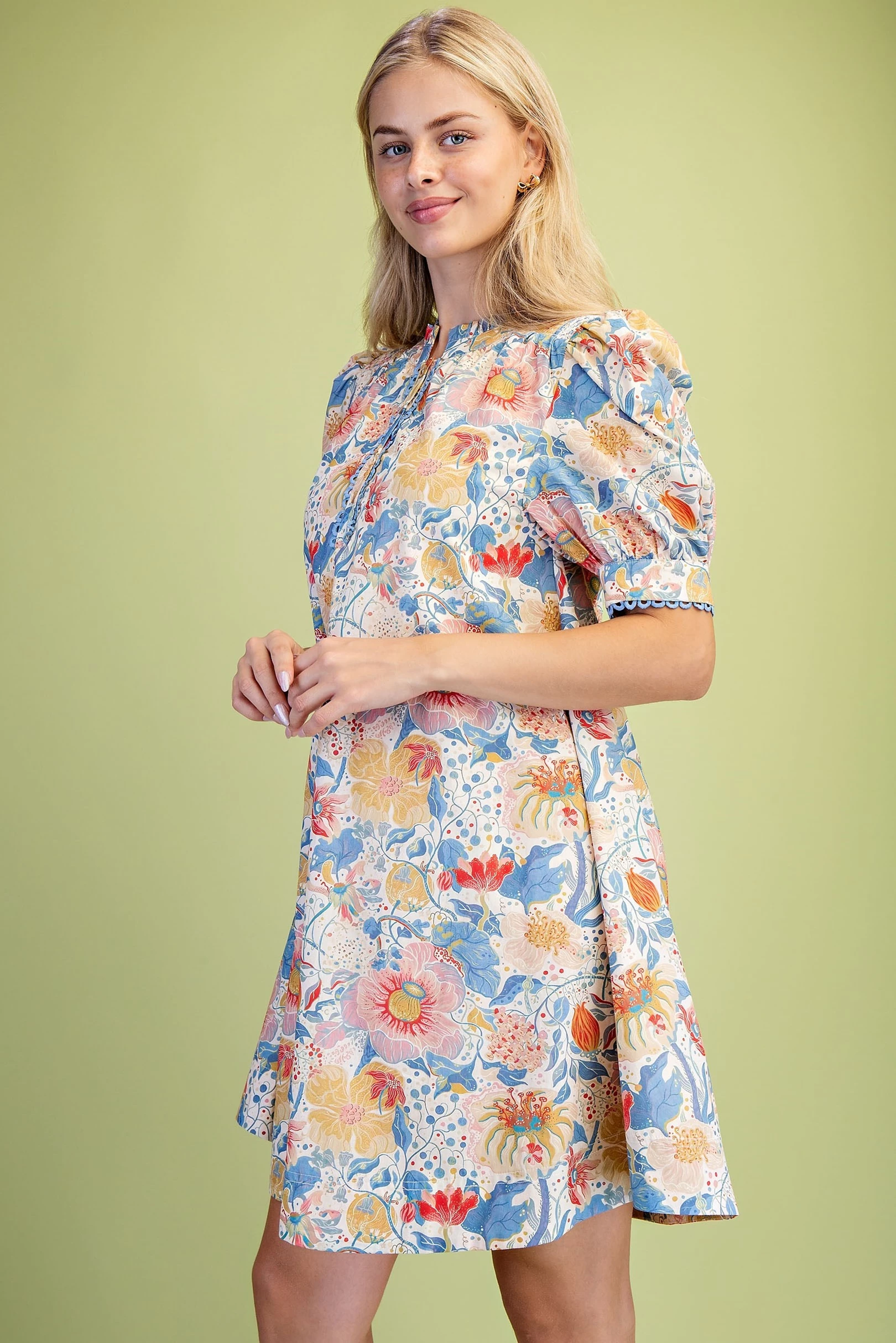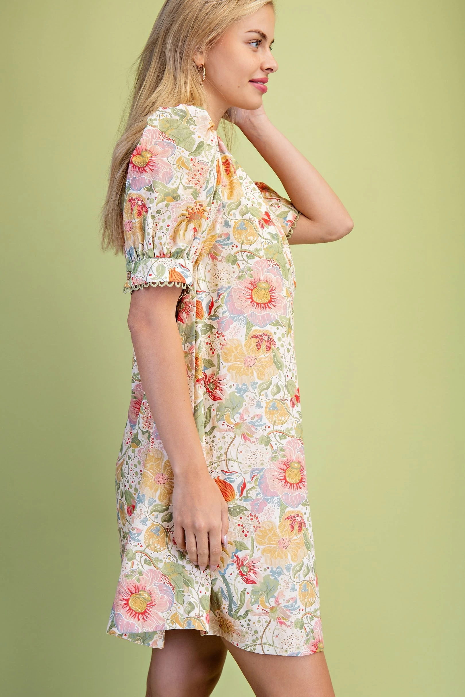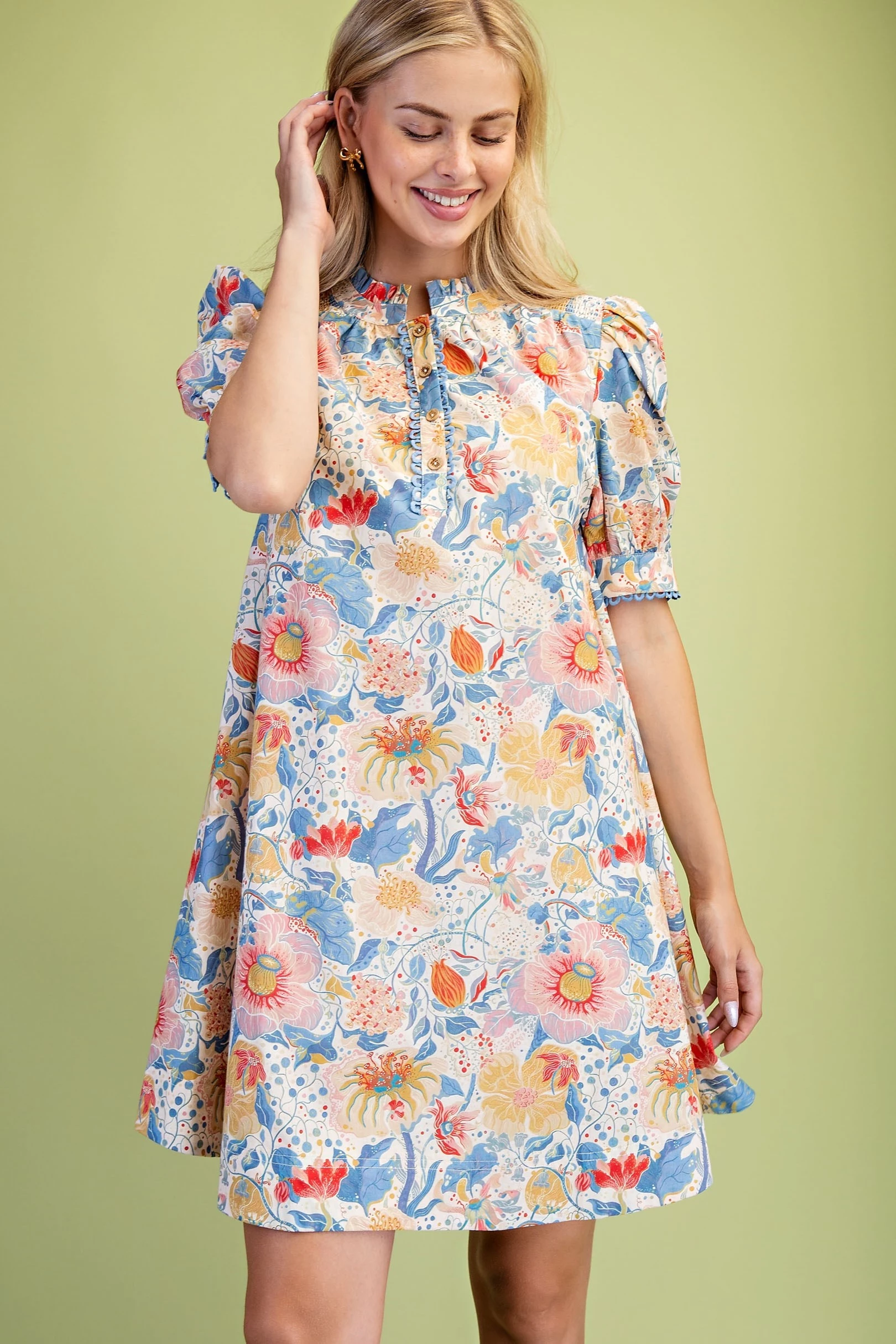Muted Botanic Print Puff Sleeve Dress with Trim and Smocking Details. The Dress is Lined