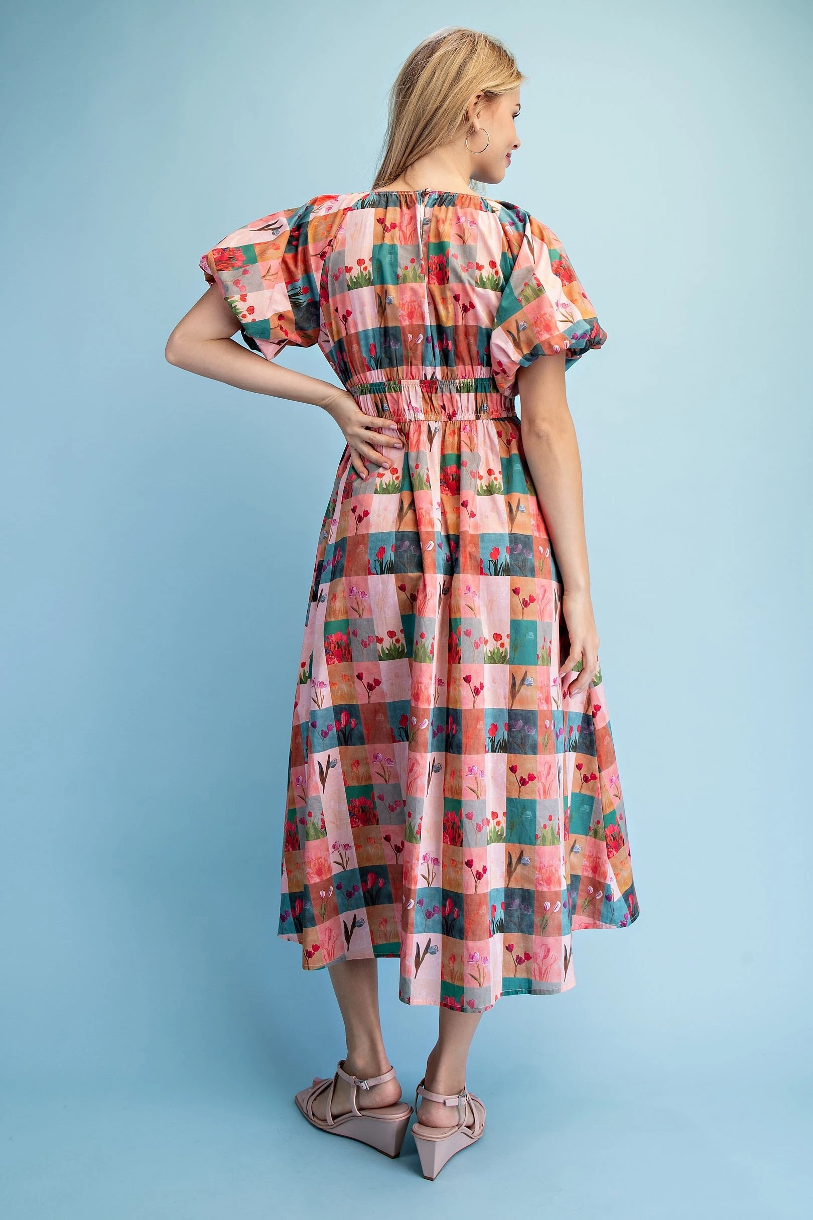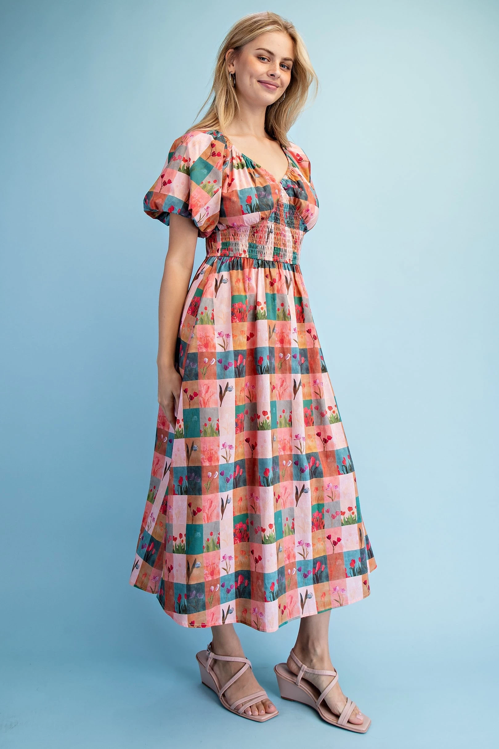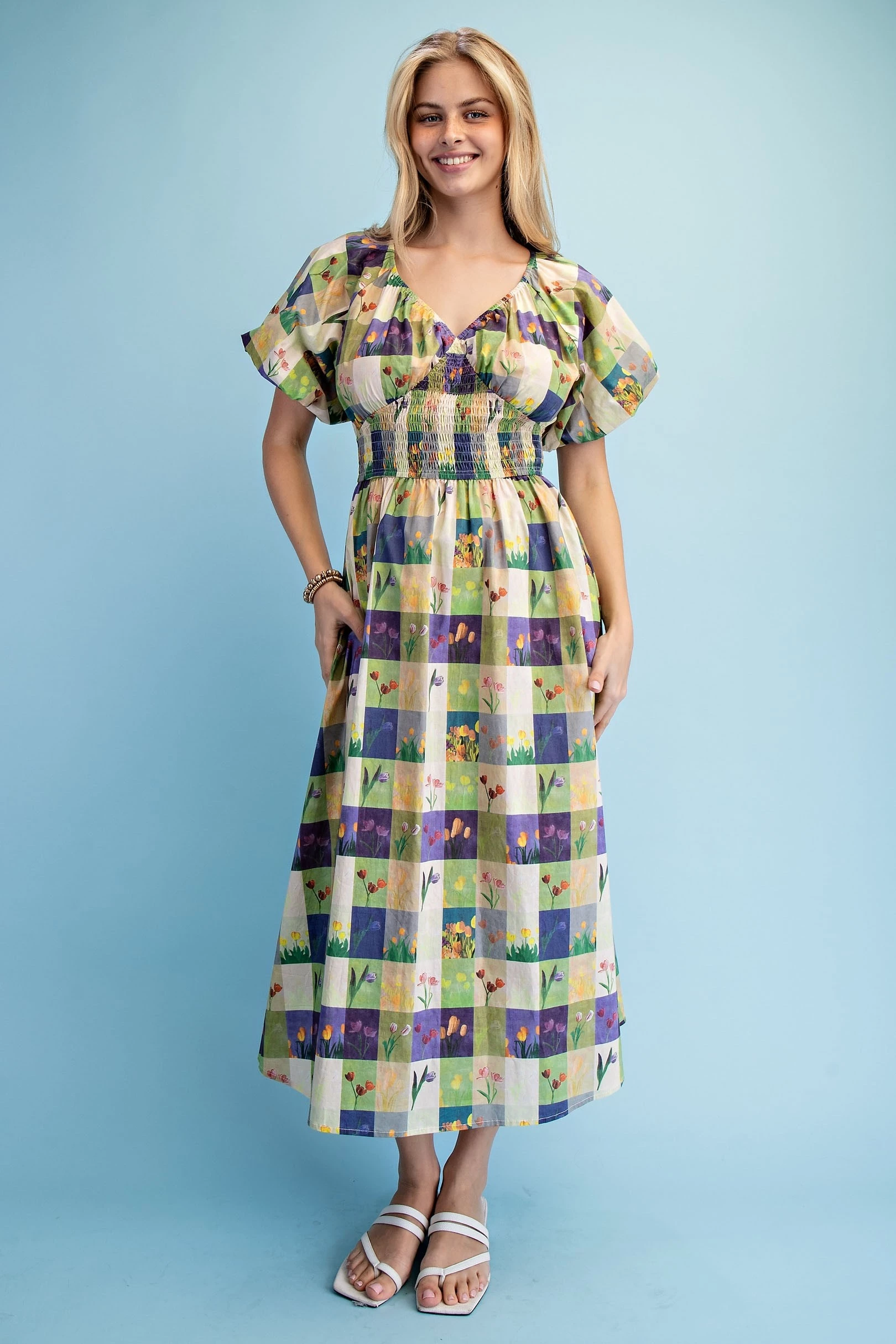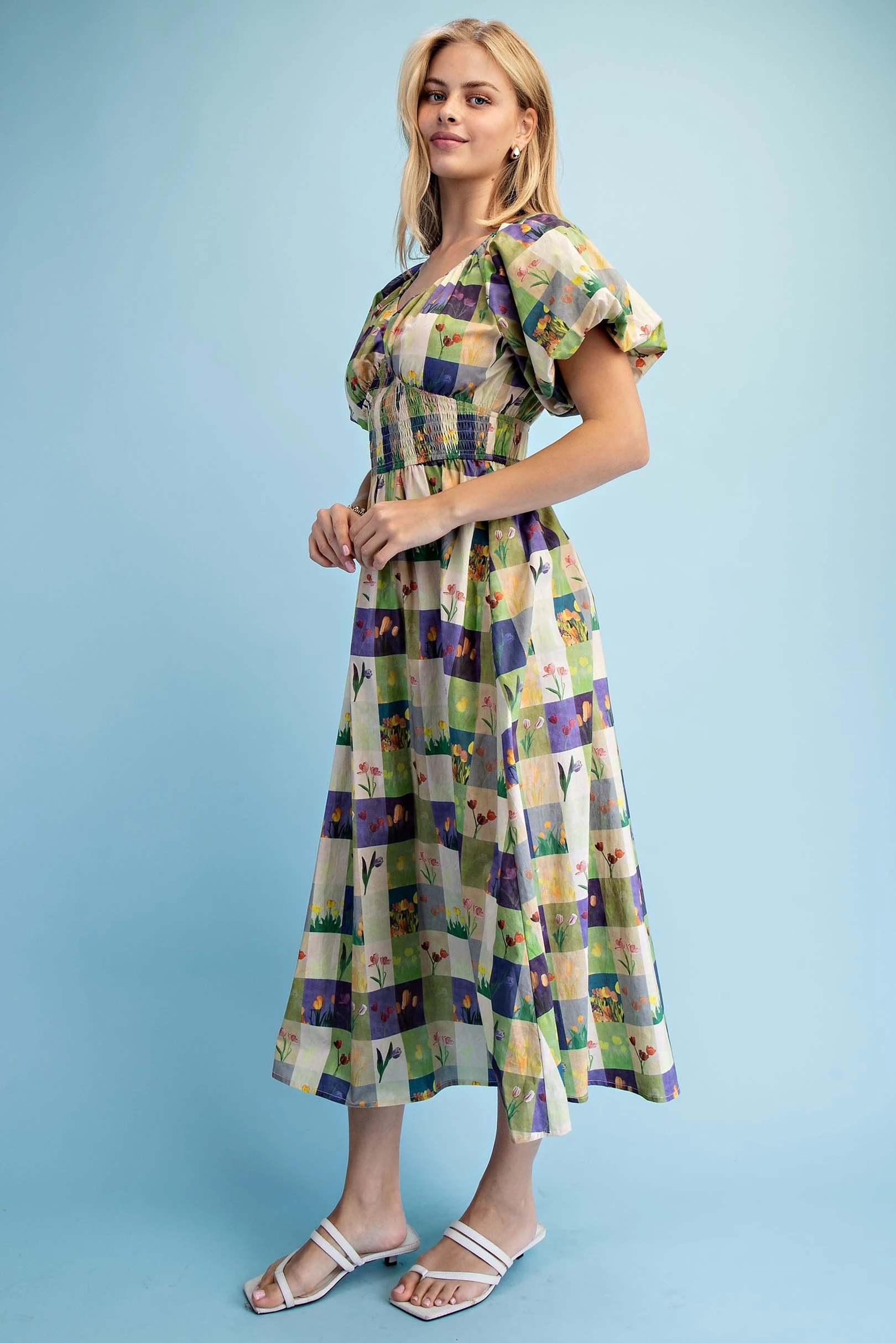 Printed V-Neck Midi Dress with Short Puff Sleeves and a Smocked Waist