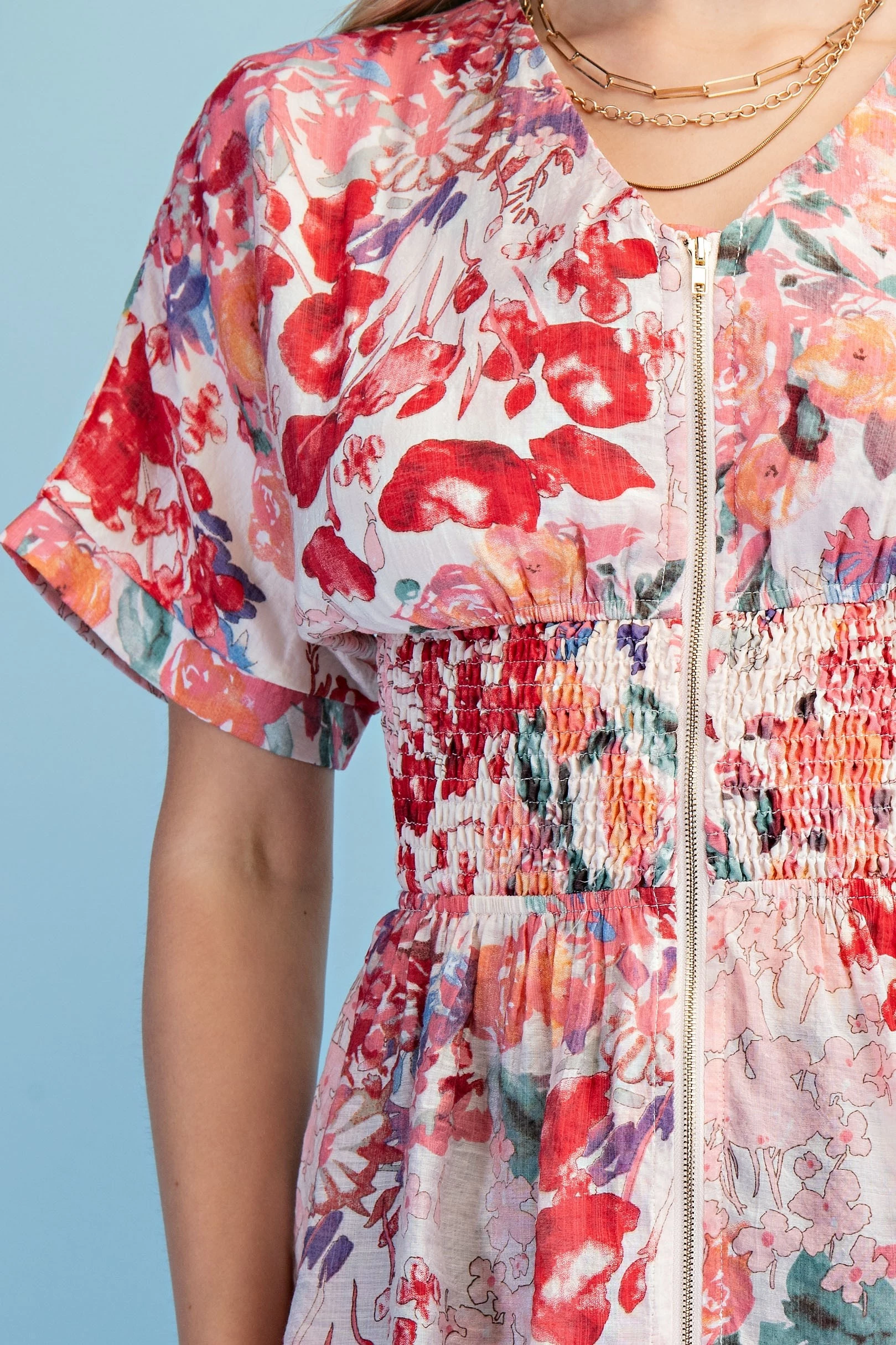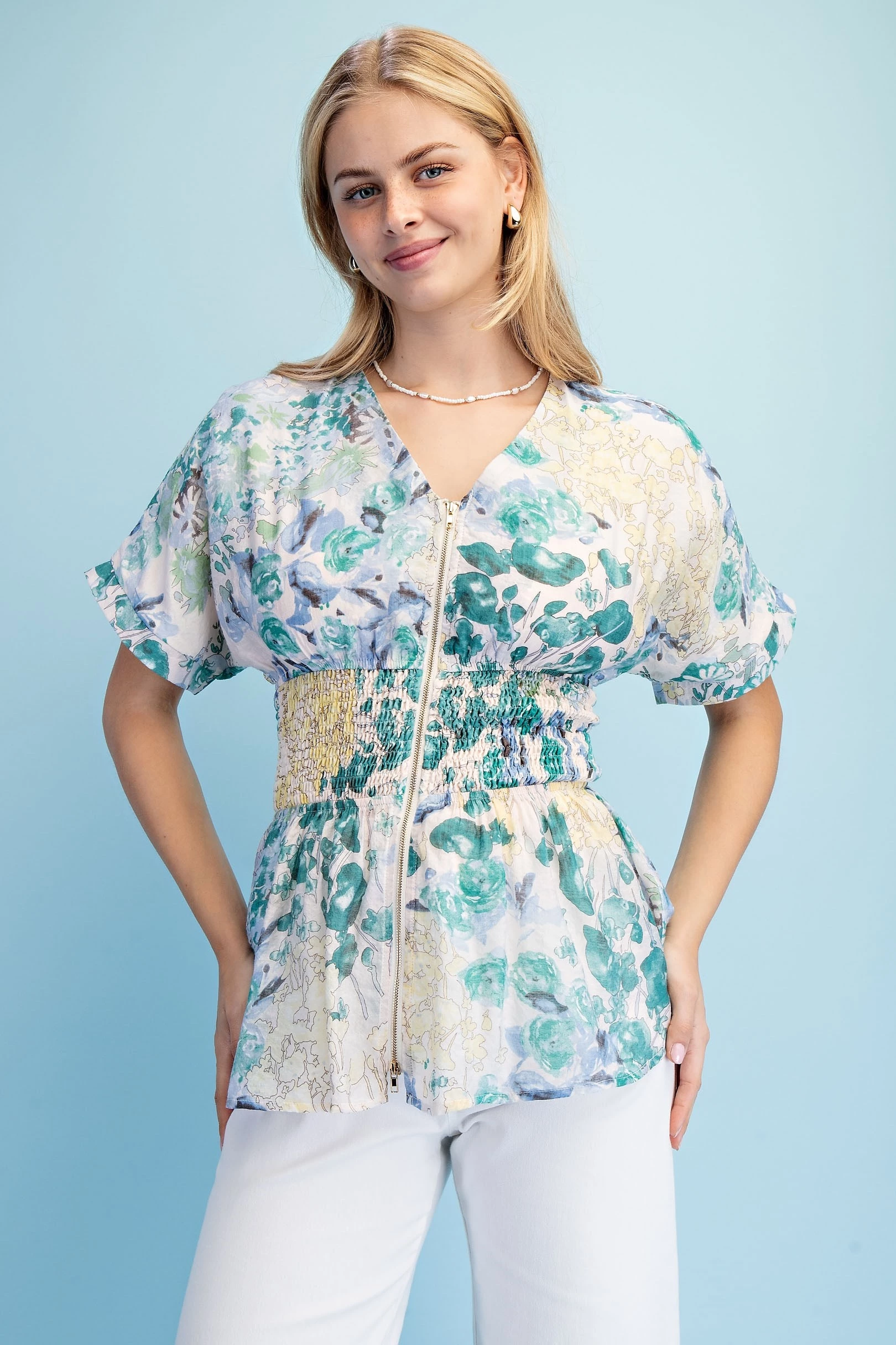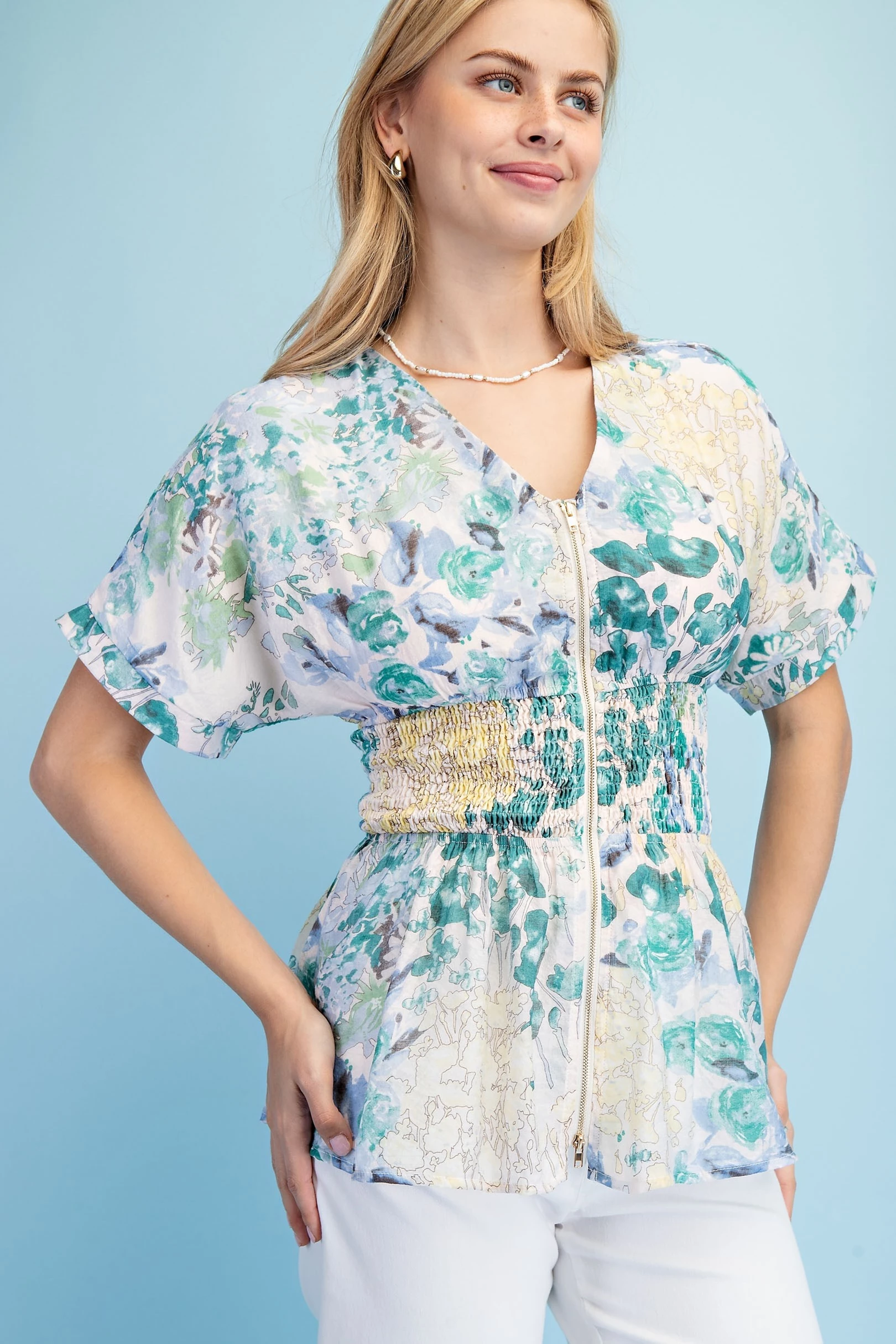 Floral Short Sleeve V-Neck Blouse with a Zipper Front and Smocked Waist. The Top is Lined