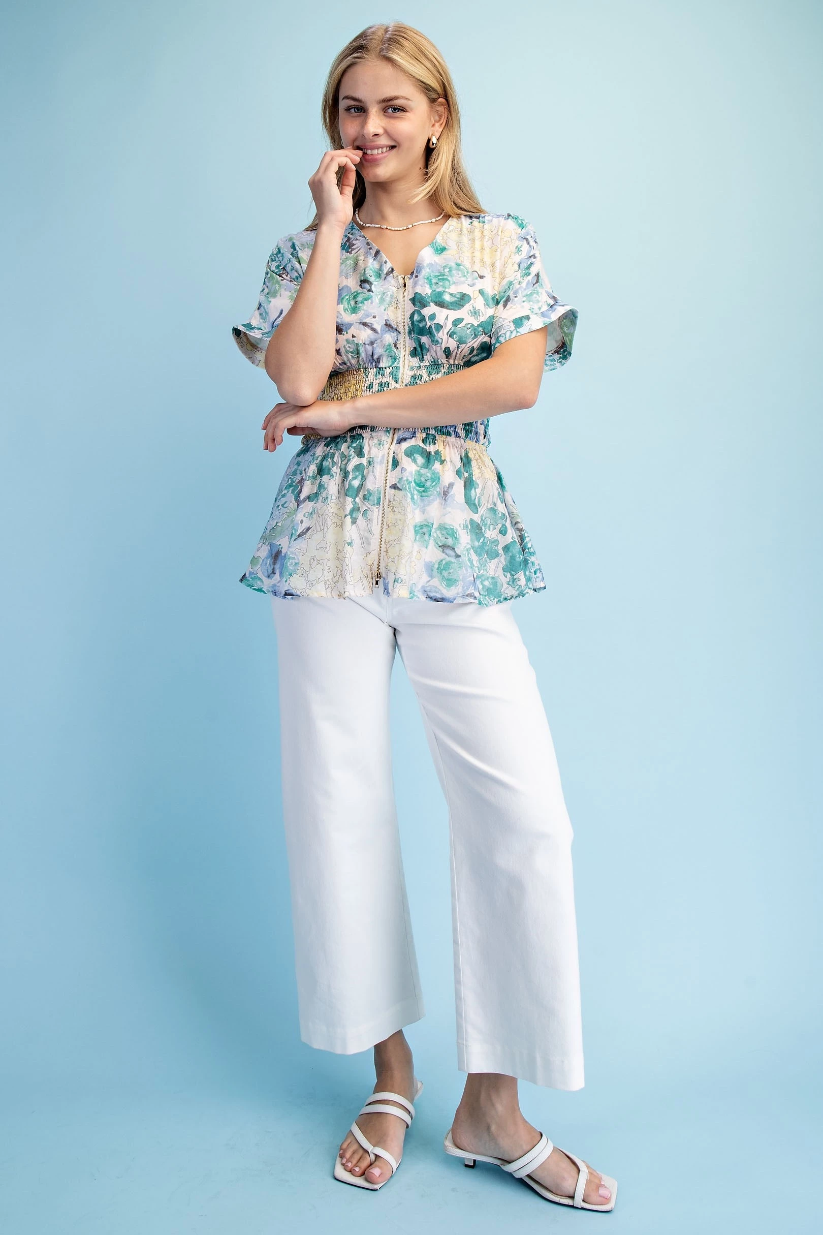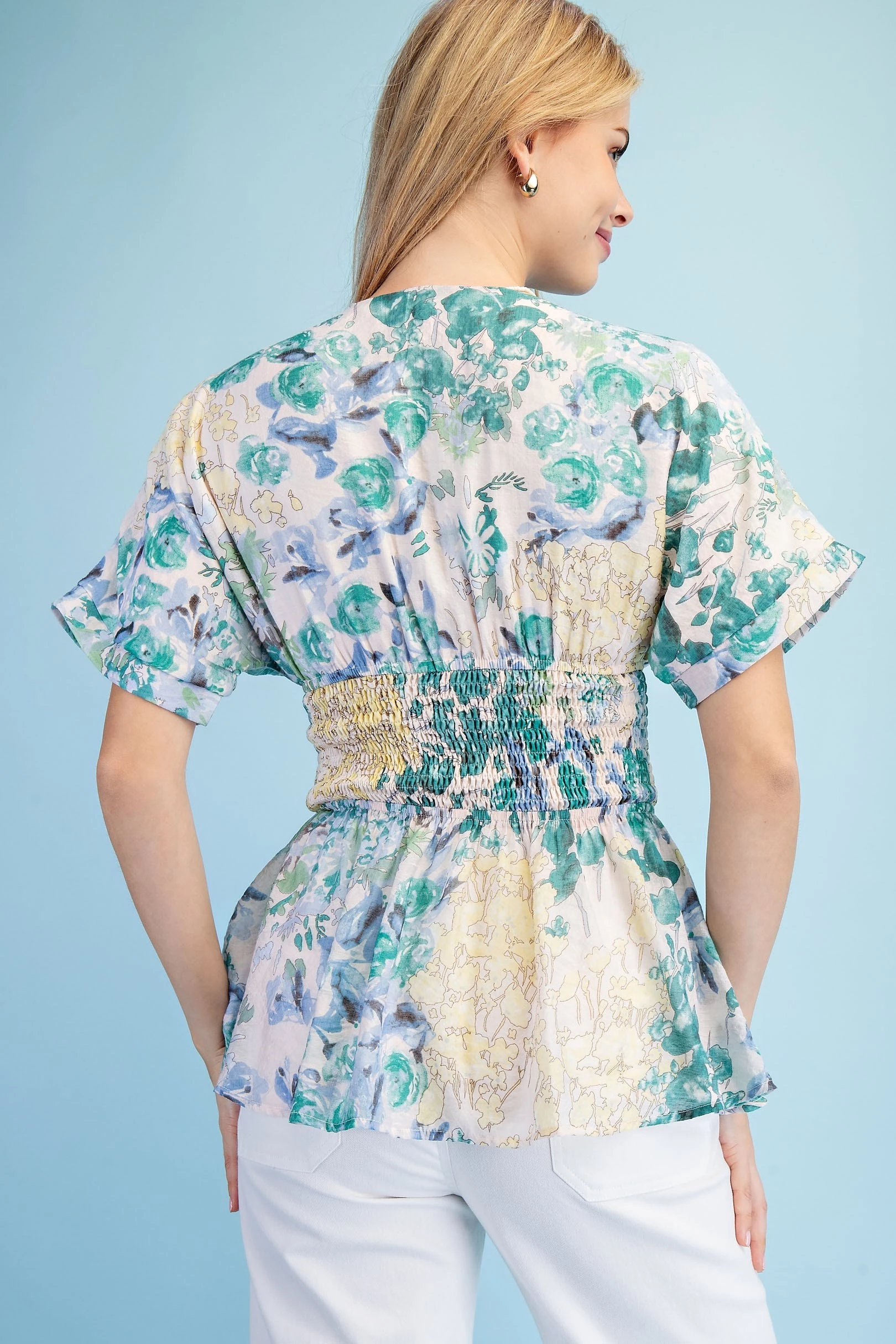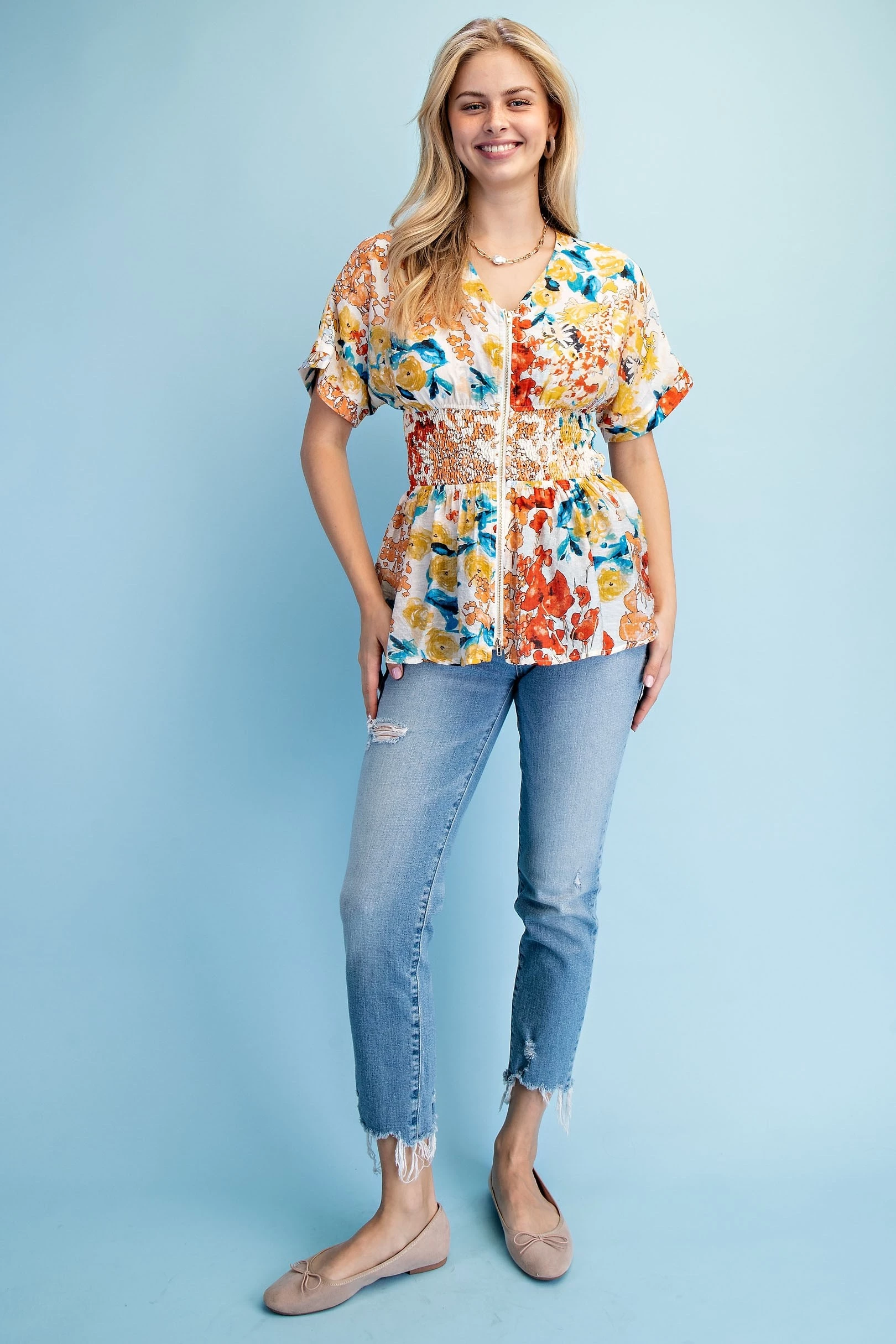 Floral Short Sleeve V-Neck Blouse with a Zipper Front and Smocked Waist. The Top is Lined