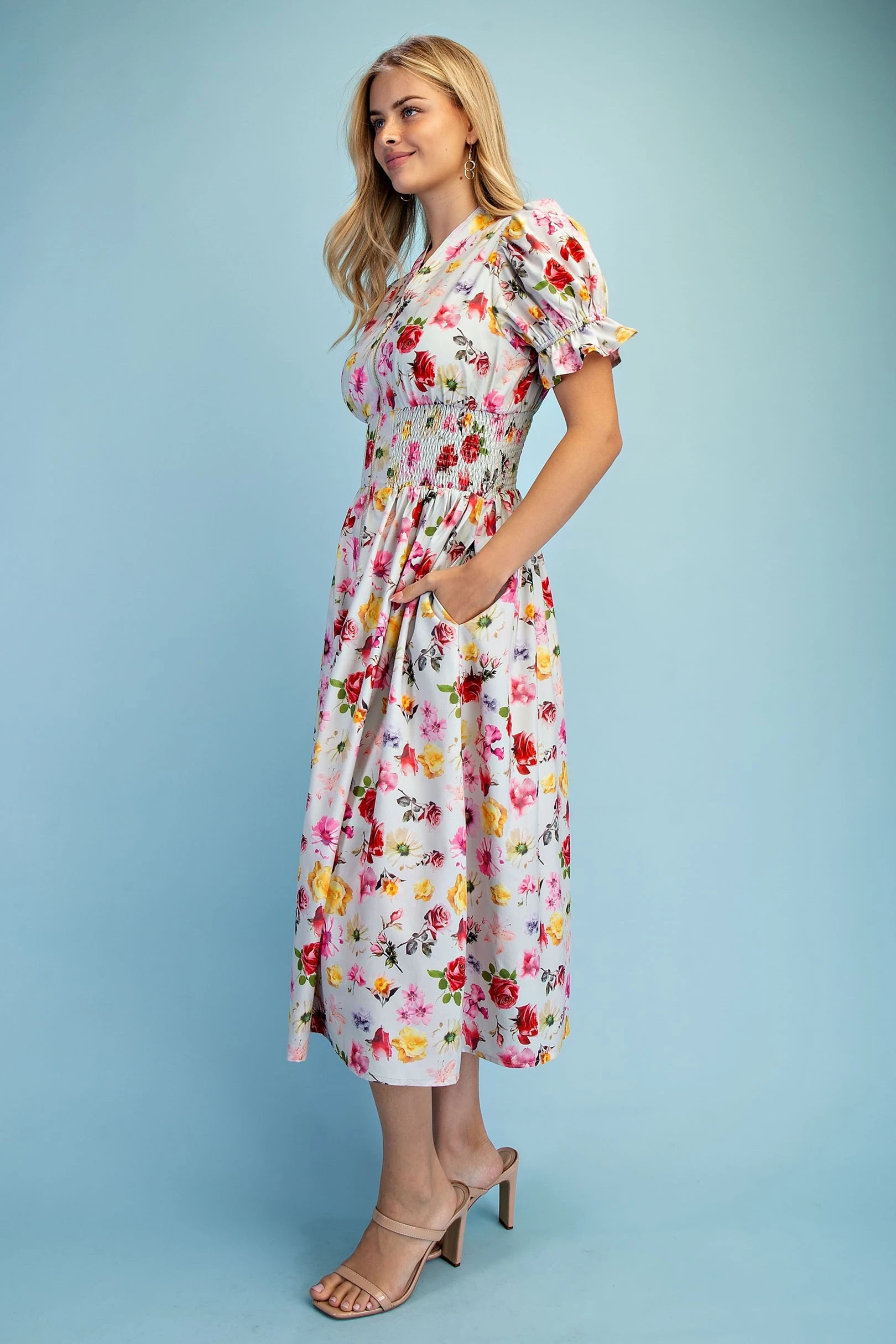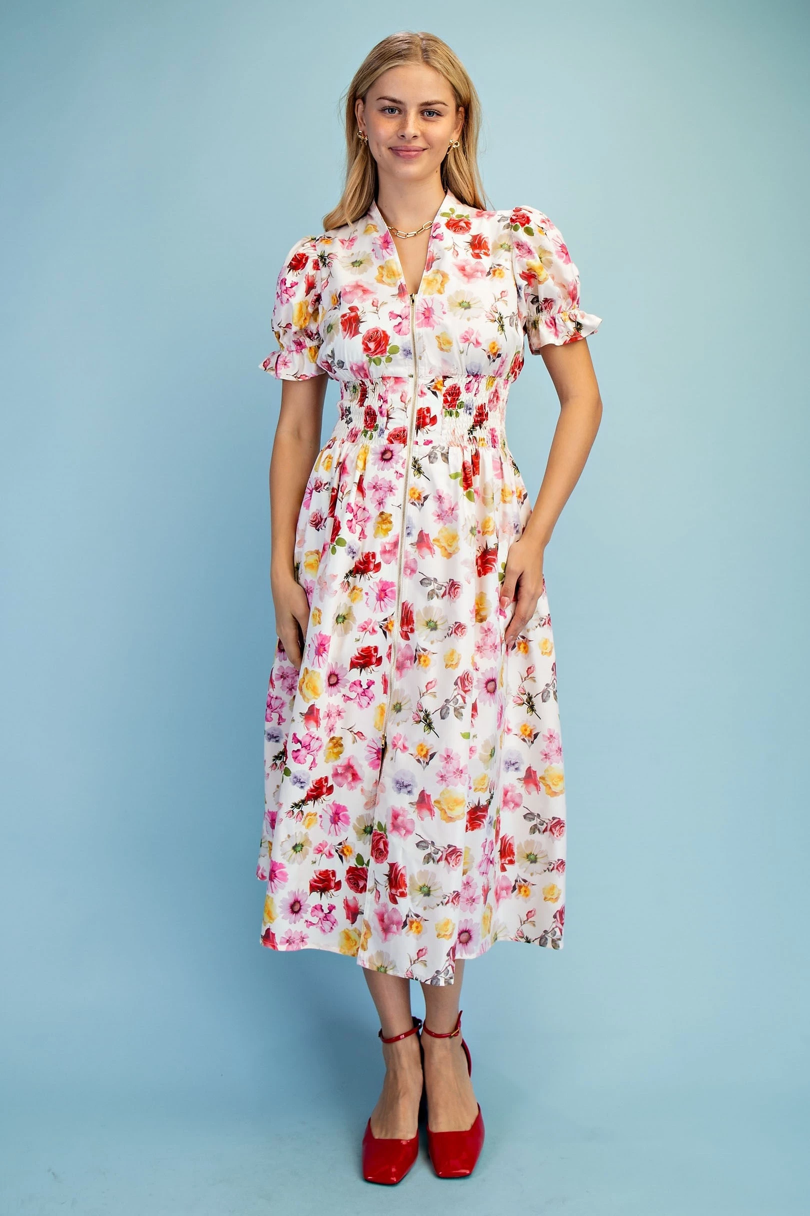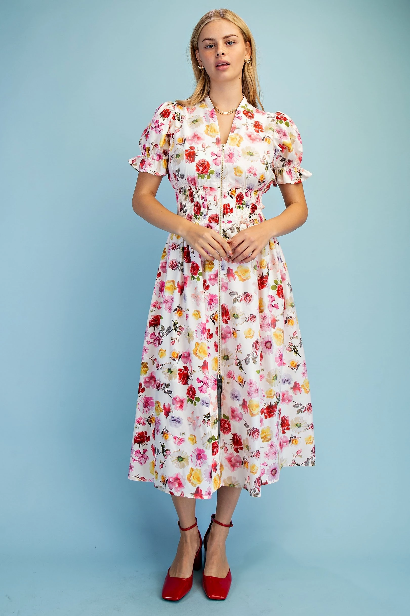 Floral Puff Sleeve Midi Dress with a Front Zipper and Smocked Waist. The Dress is Lined
