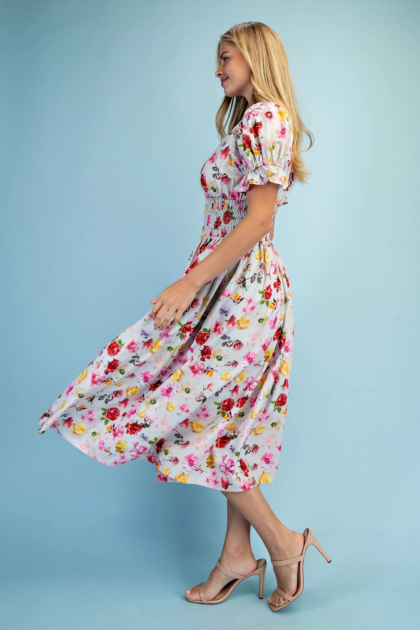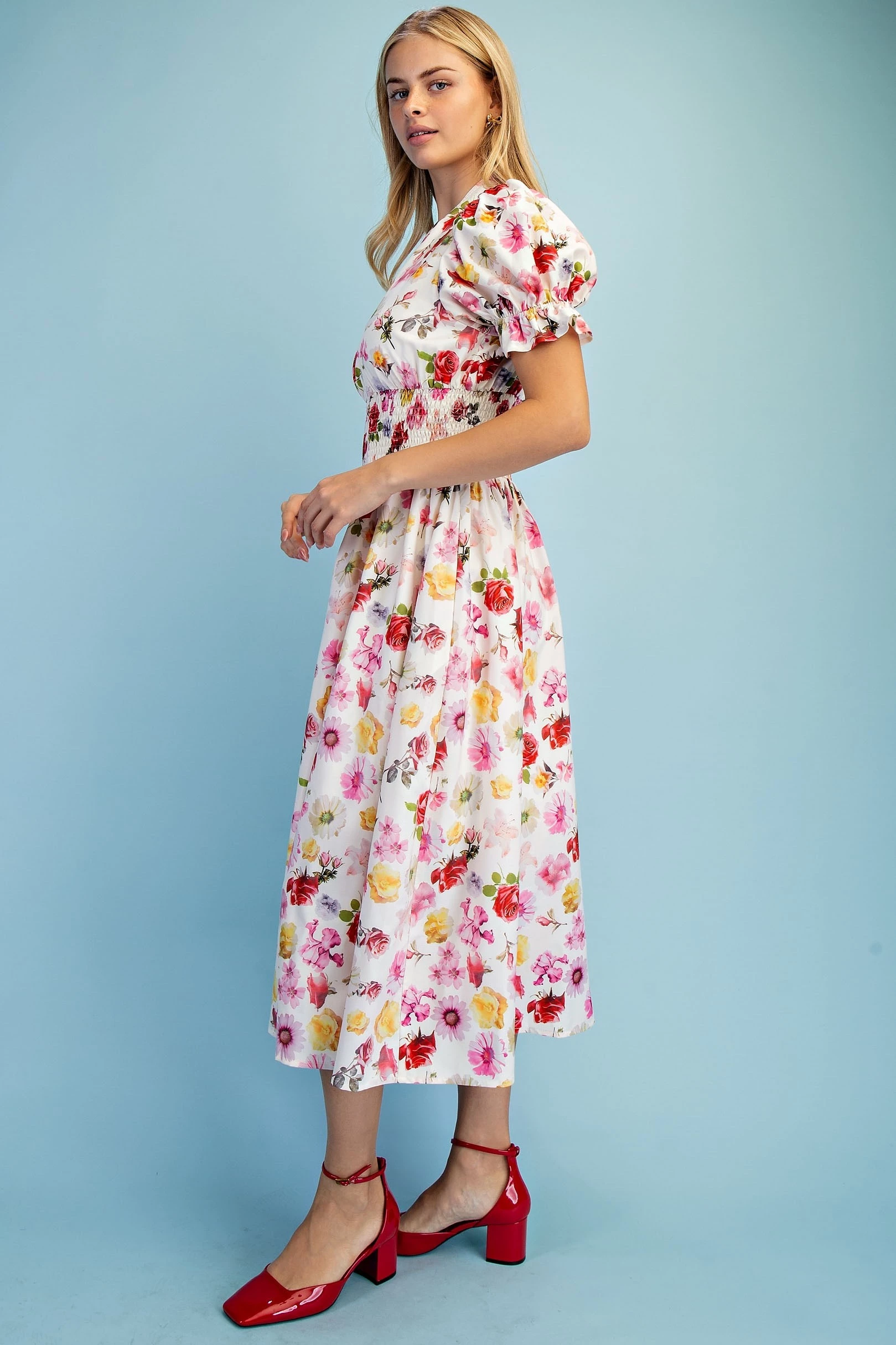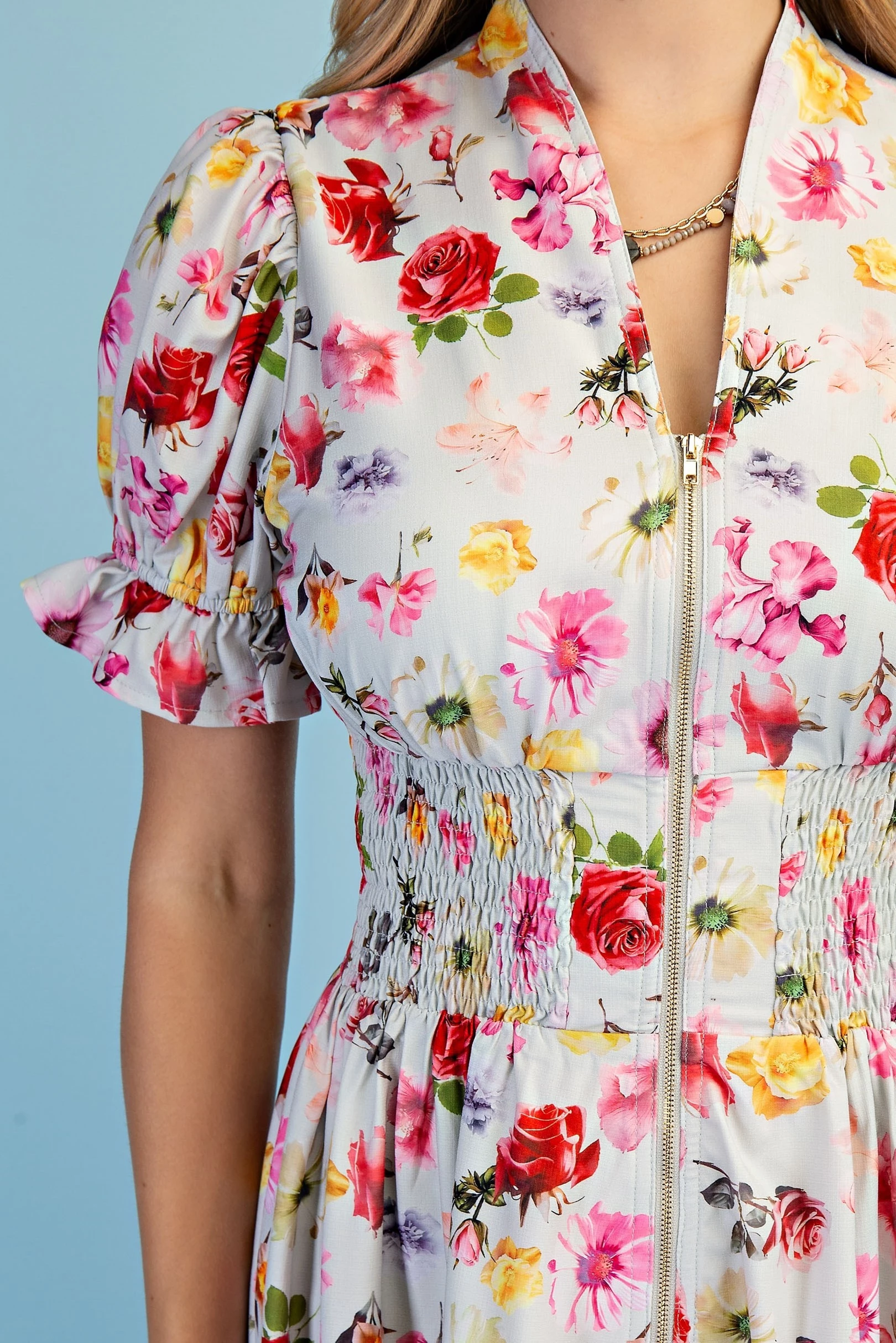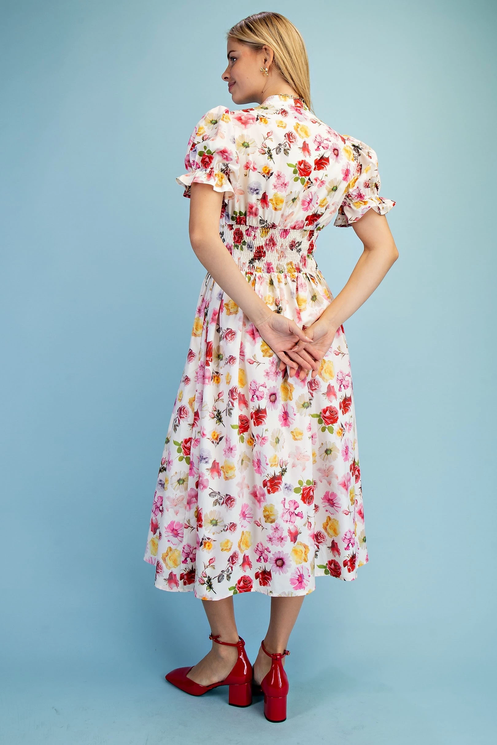 Floral Puff Sleeve Midi Dress with a Front Zipper and Smocked Waist. The Dress is Lined