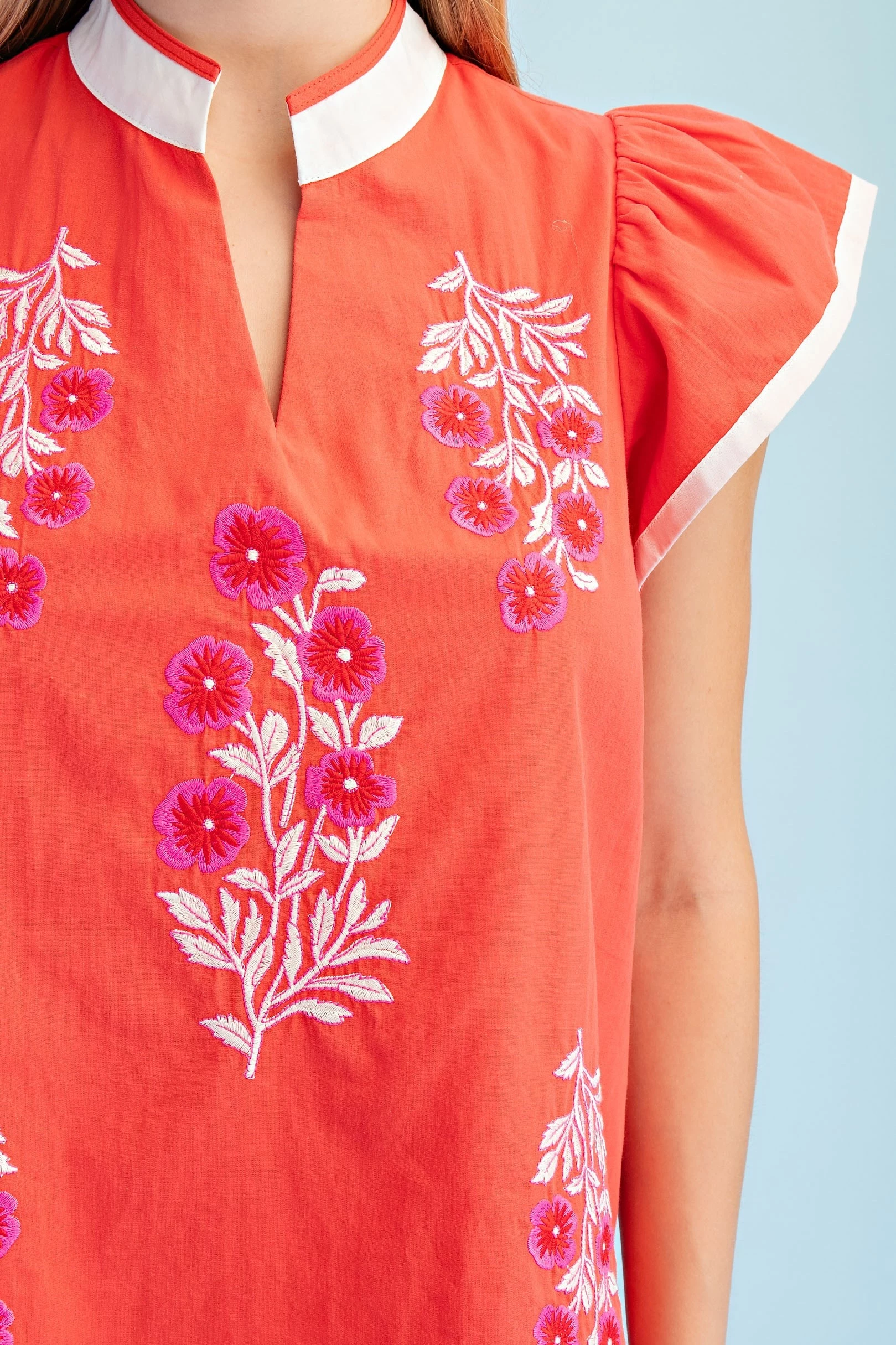 Linen V-Neck Dress with Embroidered AppliquΓ© Design Details. The Dress is Lined