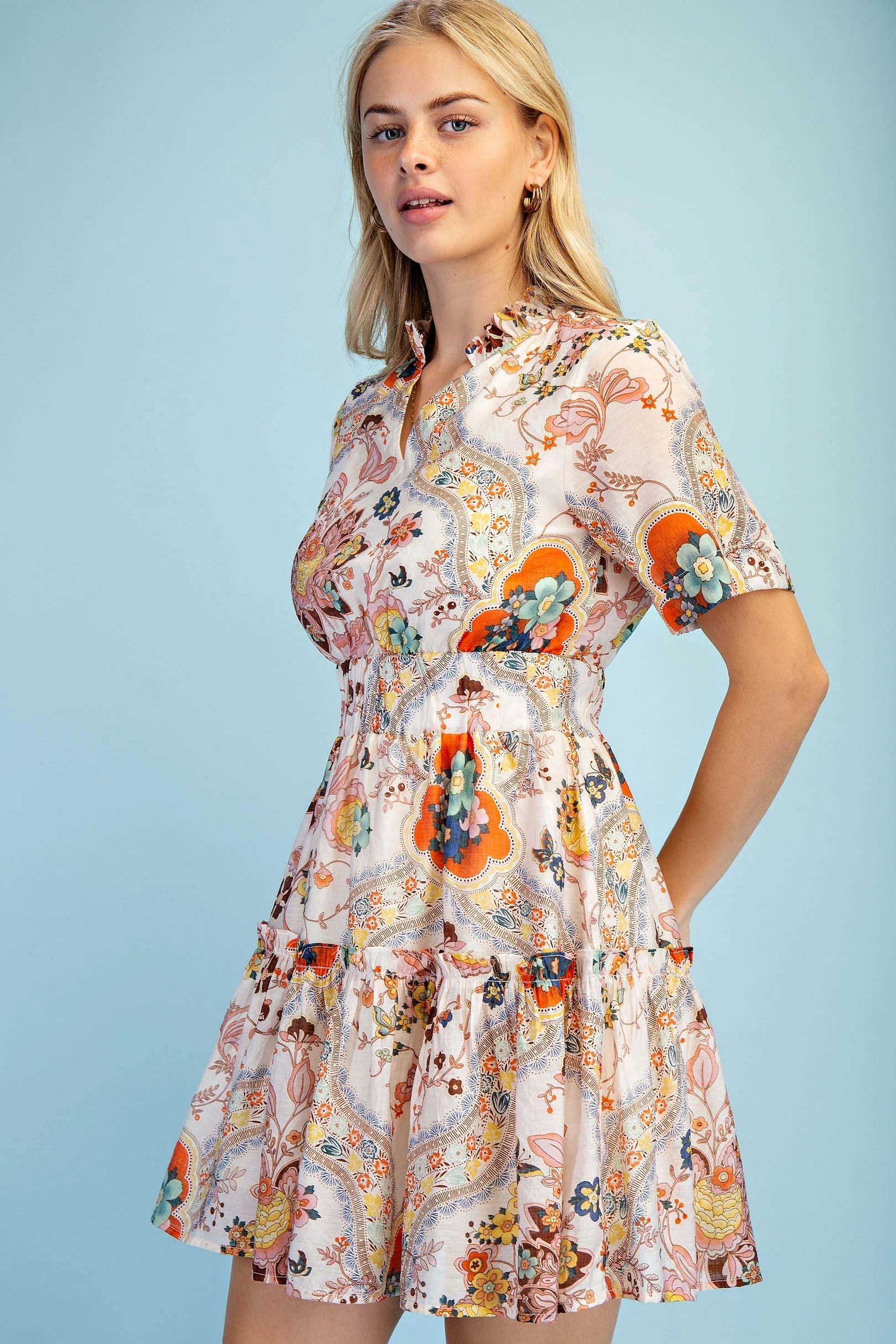 Tiered V-Neck Mini Dress with Collar