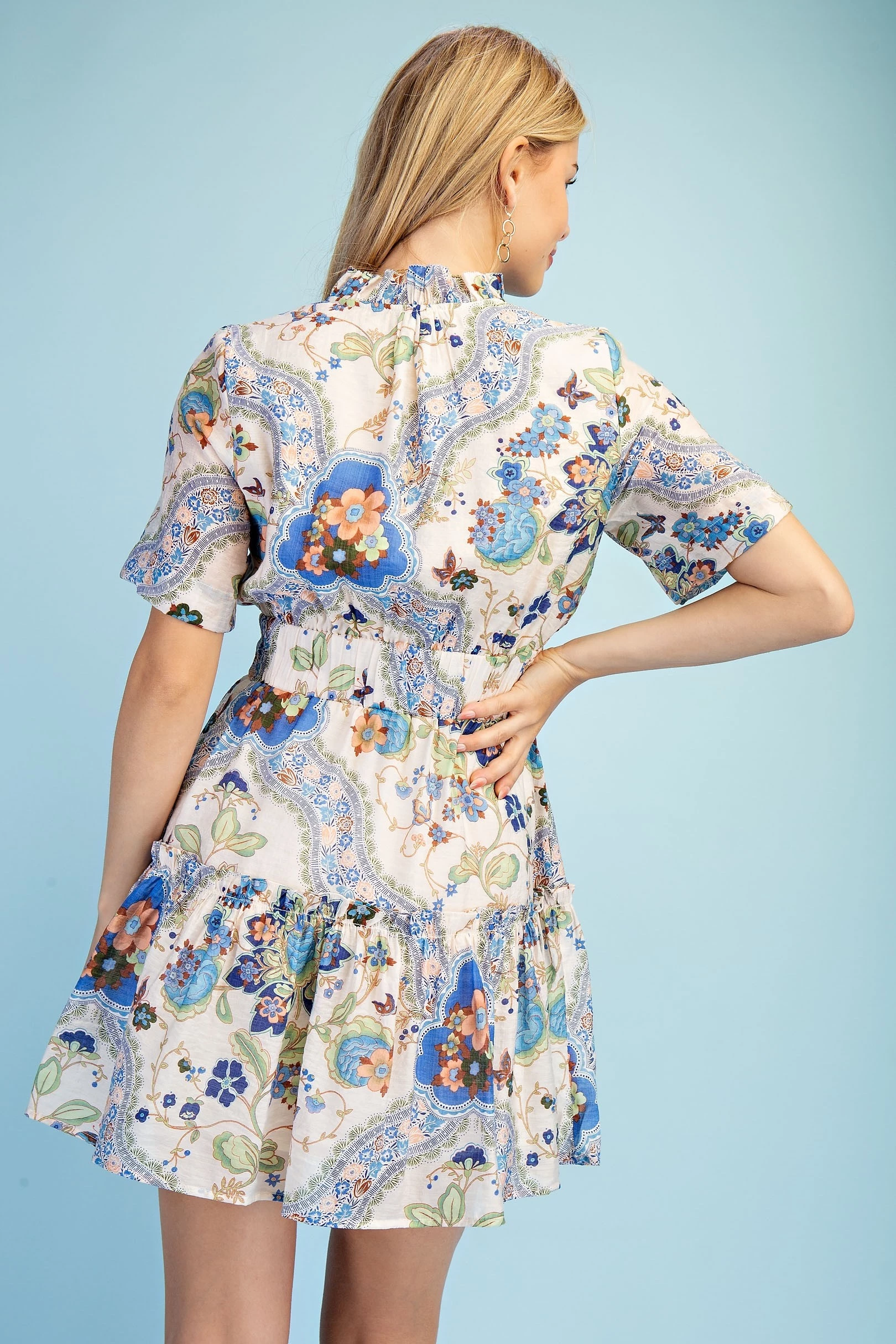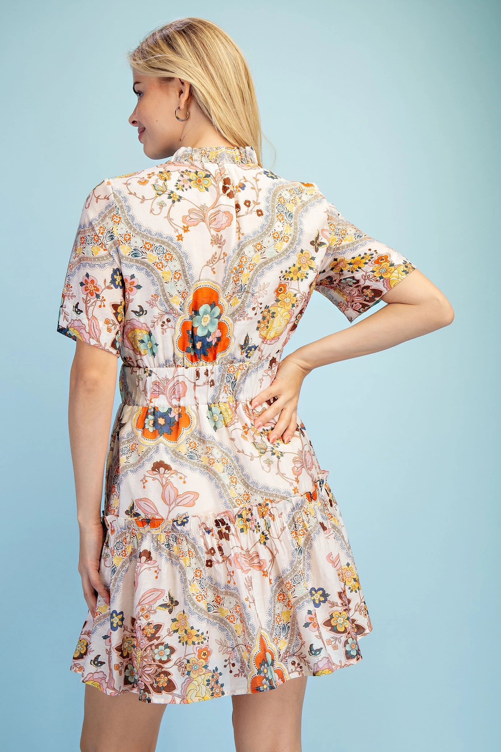 Printed V-Neck Short Sleeve Mini Dress with Back Tie