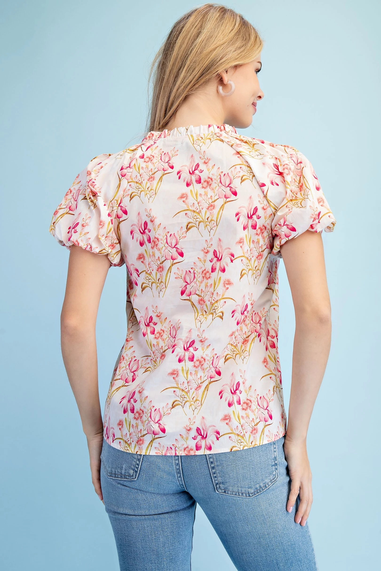 Floral Print Button Down Blouse with Short Puff Sleeves and a Ruffled Collar